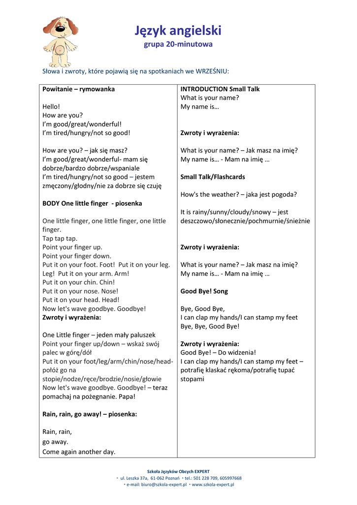 Język angielski grupa 20-minutowa Słowa i zwroty, które pojawią się na spotkaniach we WRZEŚNIU: Powitanie – rymowanka Hello! How are you? I’m good/great/wonderful! I’m tired/hungry/not so good! How are you? – jak się masz? I’m good/great/wonderful- mam się dobrze/bardzo dobrze/wspaniale I’m tired/hungry/not so good – jestem zmęczony/głodny/nie za dobrze się czuję INTRODUCTION Small Talk What is your name? My name is… Zwroty i wyrażenia: What is your name? – Jak masz na imię? My name is… - Mam na imię … Small Talk/Flashcards How's the weather? – jaka jest pogoda? BODY One little finger - piosenka One little finger, one little finger, one little finger. Tap tap tap. Point your finger up. Point your finger down. Put it on your foot. Foot! Put it on your leg. Leg! Put it on your arm. Arm! Put it on your chin. Chin! Put it on your nose. Nose! Put it on your head. Head! Now let's wave goodbye. Goodbye! Zwroty i wyrażenia: One Little finger – jeden mały paluszek Point your finger up/down – wskaż swój palec w górę/dół Put it on your foot/leg/arm/chin/nose/headpołóż go na stopie/nodze/ręce/brodzie/nosie/głowie Now let's wave goodbye. Goodbye! – teraz pomachaj na pożegnanie. Papa! It is rainy/sunny/cloudy/snowy – jest deszczowo/słonecznie/pochmurnie/śnieżnie Zwroty i wyrażenia: What is your name? – Jak masz na imię? My name is… - Mam na imię … Good Bye! Song Bye, Good Bye, I can clap my hands/I can stamp my feet Bye, Bye, Good Bye! Zwroty i wyrażenia: Good Bye! – Do widzenia! I can clap my hands/I can stamp my feet – potrafię klaskać rękoma/potrafię tupać stopami Rain, rain, go away! – piosenka: Rain, rain, go away. Come again another day. Szkoła Języków Obcych EXPERT ◦ ul. Leszka 37a, 61-062 Poznań ◦tel.: 501 228 709, 605997668 ◦e-mail: [email protected] ◦www.szkola-expert.pl Język angielski grupa 20-minutowa DADDY /MOMMY/BROTHER/SISTER/BABY/ALL THE FAMILY wants to play. Rain, rain, go away. Zwroty i wyrażenia: Rain, rain, go away – deszczu, deszczu, odejdź Come again another Day – przyjdź innego dnia DADDY /MOMMY/BROTHER/SISTER/BABY/ALL THE FAMILY wants to play – tata/mama/brat/siostra/dziecko/cała rodzina chce się bawić The eensey weensey spider – piosenka: The eensey weensey spider went up the water spout. Down came the rain and washed the spider out. Out came the sun and dried up all the rain. Then the eensey weensey spider went up the spout again Zwroty i wyrażenia: The eensey weensey spider went up the water spout – pająk Eensey Weensey wszedł na rynnę Down came the rain and washed the spider out – spadł deszcz i zmył pajączka Out came the sun and dried up all the rain – wyszło słońce i osuszyło deszcz Then the eensey weensey spider went up the spout again – wtedy pająk Eensey Weensey znów wszedł na rynnę Szkoła Języków Obcych EXPERT ◦ ul. Leszka 37a, 61-062 Poznań ◦tel.: 501 228 709, 605997668 ◦e-mail: [email protected] ◦www.szkola-expert.pl