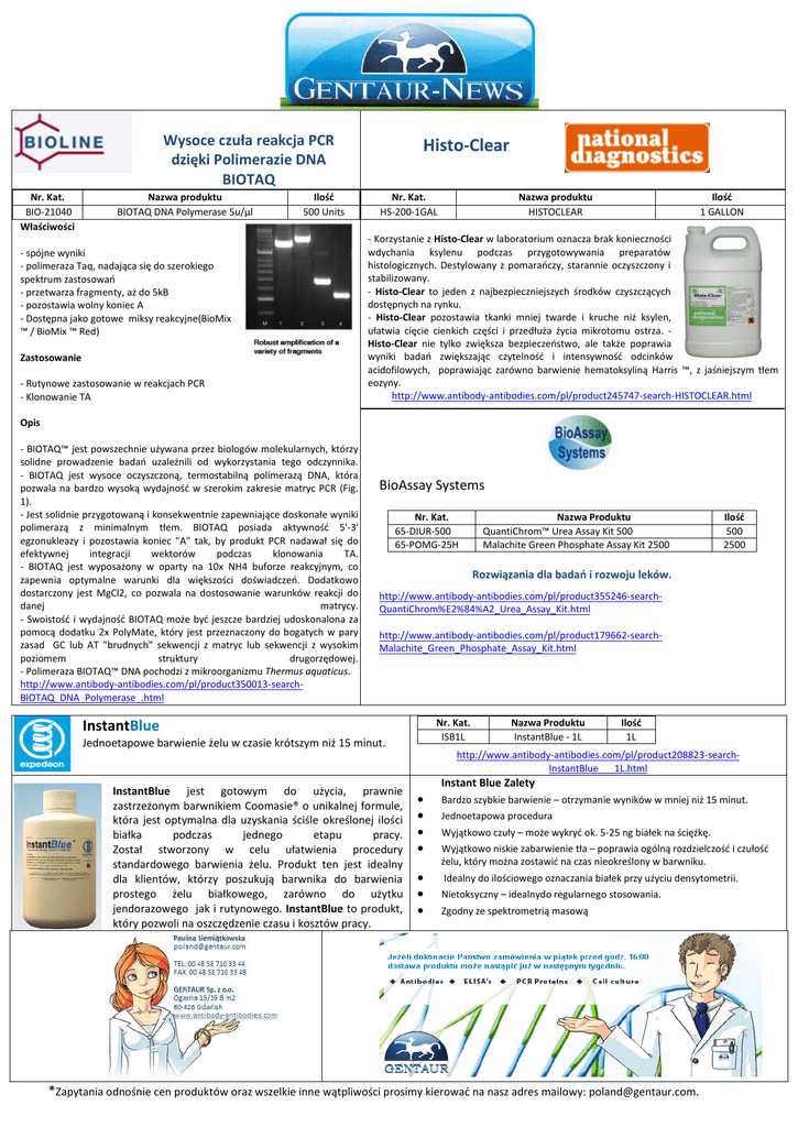 Wysoce czuła reakcja PCR dzięki Polimerazie DNA BIOTAQ Nr. Kat. BIO-21040 Właściwości Nazwa produktu BIOTAQ DNA Polymerase 5u/µl Ilość 500 Units - spójne wyniki - polimeraza Taq, nadająca się do szerokiego spektrum zastosowań - przetwarza fragmenty, aż do 5kB - pozostawia wolny koniec A - Dostępna jako gotowe miksy reakcyjne(BioMix ™ / BioMix ™ Red) Zastosowanie - Rutynowe zastosowanie w reakcjach PCR - Klonowanie TA Histo-Clear Nr. Kat. HS-200-1GAL Nazwa produktu HISTOCLEAR Ilość 1 GALLON - Korzystanie z Histo-Clear w laboratorium oznacza brak konieczności wdychania ksylenu podczas przygotowywania preparatów histologicznych. Destylowany z pomarańczy, starannie oczyszczony i stabilizowany. - Histo-Clear to jeden z najbezpieczniejszych środków czyszczących dostępnych na rynku. - Histo-Clear pozostawia tkanki mniej twarde i kruche niż ksylen, ułatwia cięcie cienkich części i przedłuża życia mikrotomu ostrza. Histo-Clear nie tylko zwiększa bezpieczeństwo, ale także poprawia wyniki badań zwiększając czytelność i intensywność odcinków acidofilowych, poprawiając zarówno barwienie hematoksyliną Harris ™, z jaśniejszym tłem eozyny. http://www.antibody-antibodies.com/pl/product245747-search-HISTOCLEAR.html Opis - BIOTAQ™ jest powszechnie używana przez biologów molekularnych, którzy solidne prowadzenie badań uzależnili od wykorzystania tego odczynnika. - BIOTAQ jest wysoce oczyszczoną, termostabilną polimerazą DNA, która pozwala na bardzo wysoką wydajność w szerokim zakresie matryc PCR (Fig. 1). - Jest solidnie przygotowaną i konsekwentnie zapewniające doskonałe wyniki polimerazą z minimalnym tłem. BIOTAQ posiada aktywność 5'-3' egzonukleazy i pozostawia koniec "A" tak, by produkt PCR nadawał się do efektywnej integracji wektorów podczas klonowania TA. - BIOTAQ jest wyposażony w oparty na 10x NH4 buforze reakcyjnym, co zapewnia optymalne warunki dla większości doświadczeń. Dodatkowo dostarczony jest MgCl2, co pozwala na dostosowanie warunków reakcji do danej matrycy. - Swoistość i wydajność BIOTAQ może być jeszcze bardziej udoskonalona za pomocą dodatku 2x PolyMate, który jest przeznaczony do bogatych w pary zasad GC lub AT "brudnych" sekwencji z matryc lub sekwencji z wysokim poziomem struktury drugorzędowej. - Polimeraza BIOTAQ™ DNA pochodzi z mikroorganizmu Thermus aquaticus. http://www.antibody-antibodies.com/pl/product350013-searchBIOTAQ_DNA_Polymerase_.html BioAssay Systems Nr. Kat. 65-DIUR-500 65-POMG-25H Nazwa Produktu QuantiChrom™ Urea Assay Kit 500 Malachite Green Phosphate Assay Kit 2500 Ilość 500 2500 Rozwiązania dla badań i rozwoju leków. http://www.antibody-antibodies.com/pl/product355246-searchQuantiChrom%E2%84%A2_Urea_Assay_Kit.html http://www.antibody-antibodies.com/pl/product179662-searchMalachite_Green_Phosphate_Assay_Kit.html Nr. Kat. ISB1L InstantBlue Jednoetapowe barwienie żelu w czasie krótszym niż 15 minut. Nazwa Produktu InstantBlue - 1L Ilość 1L http://www.antibody-antibodies.com/pl/product208823-searchInstantBlue___1L.html InstantBlue jest gotowym do użycia, prawnie zastrzeżonym barwnikiem Coomasie® o unikalnej formule, która jest optymalna dla uzyskania ściśle określonej ilości białka podczas jednego etapu pracy. Został stworzony w celu ułatwienia procedury standardowego barwienia żelu. Produkt ten jest idealny dla klientów, którzy poszukują barwnika do barwienia prostego żelu białkowego, zarówno do użytku jendorazowego jak i rutynowego. InstantBlue to produkt, który pozwoli na oszczędzenie czasu i kosztów pracy. Instant Blue Zalety Bardzo szybkie barwienie – otrzymanie wyników w mniej niż 15 minut. Jednoetapowa procedura Wyjątkowo czuły – może wykryć ok. 5-25 ng białek na ściężkę. Wyjątkowo niskie zabarwienie tła – poprawia ogólną rozdzielczość i czułość żelu, który można zostawić na czas nieokreślony w barwniku. Idealny do ilościowego oznaczania białek przy użyciu densytometrii. Nietoksyczny – idealnydo regularnego stosowania. Zgodny ze spektrometrią masową *Zapytania odnośnie cen produktów oraz wszelkie inne wątpliwości prosimy kierować na nasz adres mailowy: [email protected].