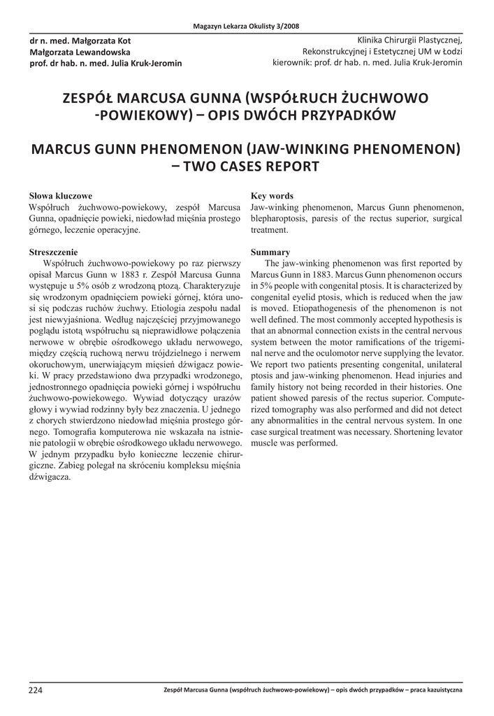 Magazyn Lekarza Okulisty 3/2008 dr n. med. Małgorzata Kot Małgorzata Lewandowska prof. dr hab. n. med. Julia Kruk-Jeromin Klinika Chirurgii Plastycznej, Rekonstrukcyjnej i Estetycznej UM w Łodzi kierownik: prof. dr hab. n. med. Julia Kruk-Jeromin Zespół Marcusa Gunna (współruch żuchwowo -powiekowy) – opis dwóch przypadków Marcus Gunn Phenomenon (jaw-winking phenomenon) – two cases report Słowa kluczowe Współruch żuchwowo-powiekowy, zespół Marcusa Gunna, opadnięcie powieki, niedowład mięśnia prostego górnego, leczenie operacyjne. Key words Jaw-winking phenomenon, Marcus Gunn phenomenon, blepharoptosis, paresis of the rectus superior, surgical treatment. Streszczenie Współruch żuchwowo-powiekowy po raz pierwszy opisał Marcus Gunn w 1883 r. Zespół Marcusa Gunna występuje u 5% osób z wrodzoną ptozą. Charakteryzuje się wrodzonym opadnięciem powieki górnej, która unosi się podczas ruchów żuchwy. Etiologia zespołu nadal jest niewyjaśniona. Według najczęściej przyjmowanego poglądu istotą współruchu są nieprawidłowe połączenia nerwowe w obrębie ośrodkowego układu nerwowego, między częścią ruchową nerwu trójdzielnego i nerwem okoruchowym, unerwiającym mięsień dźwigacz powieki. W pracy przedstawiono dwa przypadki wrodzonego, jednostronnego opadnięcia powieki górnej i współruchu żuchwowo-powiekowego. Wywiad dotyczący urazów głowy i wywiad rodzinny były bez znaczenia. U jednego z chorych stwierdzono niedowład mięśnia prostego górnego. Tomografia komputerowa nie wskazała na istnienie patologii w obrębie ośrodkowego układu nerwowego. W jednym przypadku było konieczne leczenie chirurgiczne. Zabieg polegał na skróceniu kompleksu mięśnia dźwigacza. Summary The jaw-winking phenomenon was first reported by Marcus Gunn in 1883. Marcus Gunn phenomenon occurs in 5% people with congenital ptosis. It is characterized by congenital eyelid ptosis, which is reduced when the jaw is moved. Etiopathogenesis of the phenomenon is not well defined. The most commonly accepted hypothesis is that an abnormal connection exists in the central nervous system between the motor ramifications of the trigeminal nerve and the oculomotor nerve supplying the levator. We report two patients presenting congenital, unilateral ptosis and jaw-winking phenomenon. Head injuries and family history not being recorded in their histories. One patient showed paresis of the rectus superior. Computerized tomography was also performed and did not detect any abnormalities in the central nervous system. In one case surgical treatment was necessary. Shortening levator muscle was performed. 224 Zespół Marcusa Gunna (współruch żuchwowo-powiekowy) – opis dwóch przypadków – praca kazuistyczna