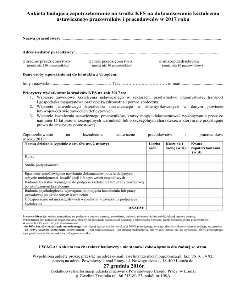 Ankieta badająca zapotrzebowanie na środki KFS na dofinansowanie kształcenia ustawicznego pracowników i pracodawców w 2017 roku Nazwa pracodawcy: .................................................................................................................................................. Adres siedziby pracodawcy: ..................................................................................................................................... □ średnie przedsiębiorstwo □ małe przedsiębiorstwo (mniej niż 250 pracowników) (mniej niż 50 pracowników) □ mikroprzedsiębiorca (mniej niż 10 pracowników) Dane osoby upoważnionej do kontaktu z Urzędem: Imię i nazwisko: ..................................................... Tel.: ………………..………… e- mail: ..................................... Priorytety wydatkowania środków KFS na rok 2017 to: 1. Wsparcie zawodowe kształcenia ustawicznego w sektorach: przetwórstwo przemysłowe, transport i gospodarka magazynowa oraz opieka zdrowotna i pomoc społeczna. 2. Wsparcie zawodowego kształcenia ustawicznego w zidentyfikowanych w danym powiecie lub województwie zawodach deficytowych. 3. Wsparcie kształcenia ustawicznego pracowników, którzy mogą udokumentować wykonywanie przez co najmniej 15 lat prac w szczególnych warunkach lub o szczególnym charakterze, a którym nie przysługuje prawo do emerytury pomostowej. Zapotrzebowanie w roku 2017: na kształcenie ustawiczne Nazwa działania (zgodnie z art. 69a ust. 2 ustawy) pracodawców Liczba osób i Koszt na 1 osobę (w zł) pracowników Kwota zapotrzebowania (w zł) Kursy Studia podyplomowe Egzaminy umożliwiające uzyskanie dokumentów potwierdzających nabycie umiejętności, kwalifikacji lub uprawnień zawodowych Badania lekarskie wymagane do podjęcia kształcenia lub pracy zawodowej po ukończonym kształceniu Badania psychologiczne wymagane do podjęcia kształcenia lub pracy zawodowej po ukończonym kształceniu Ubezpieczenie od nieszczęśliwych wypadków w związku z podjęciem kształcenia RAZEM: Pracownikiem jest osoba zatrudniona na podstawie umowy o pracę, powołania, wyboru, mianowania lub spółdzielczej umowy o pracę. Pracodawcą jest jednostka organizacyjna, choćby nie posiadała osobowości prawnej, a także osoba fizyczna, jeżeli zatrudniają one pracowników. W ramach KFS możliwe jest sfinansowanie: - do 80% kosztów kształcenia ustawicznego, nie więcej jednak niż do wysokości 300% przeciętnego wynagrodzenia w danym roku na jednego uczestnika, - do 100% kosztów kształcenia ustawicznego – jeśli wnioskodawca jest mikroprzedsiębiorcą, nie więcej jednak niż do wysokości 300% przeciętnego wynagrodzenia w danym roku na jednego uczestnika. UWAGA: Ankieta ma charakter badawczy i nie stanowi zobowiązania dla żadnej ze stron. Wypełnioną ankietę proszę przesłać na adres e-mail: [email protected], fax: 86 16 34 92, pocztą na adres: Powiatowy Urząd Pracy, ul. Nowogrodzka 1, 18-400 Łomża do 27 grudnia 2016r. Dodatkowych informacji udziela pracownik Powiatowego Urzędu Pracy w Łomży p. Ewelina Trzcinka tel. 86 215-80-23, pokój nr 108A