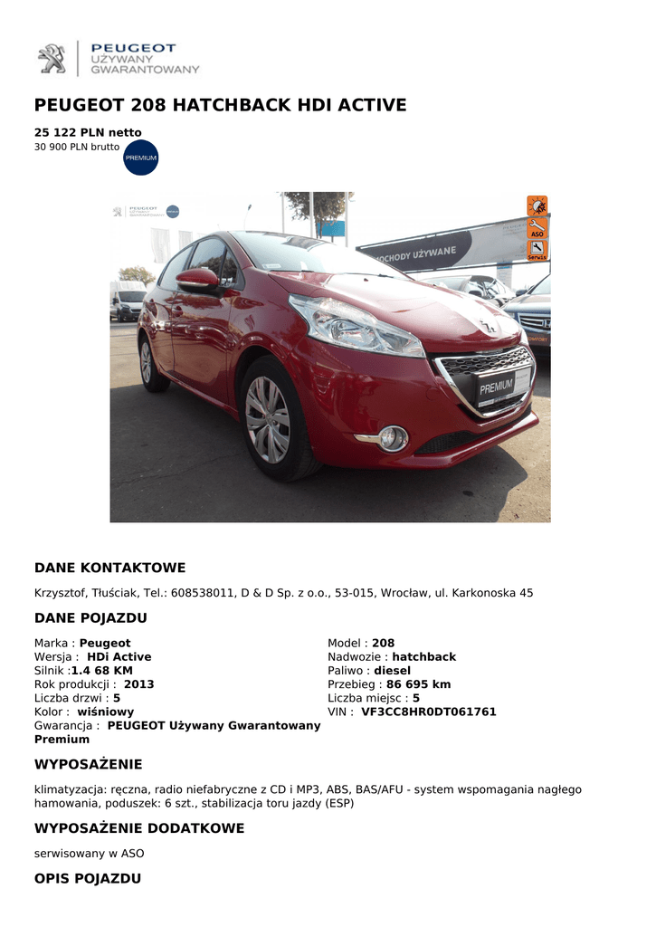 PEUGEOT 208 HATCHBACK HDI ACTIVE 25 122 PLN netto 30 900 PLN brutto DANE KONTAKTOWE Krzysztof, Tłuściak, Tel.: 608538011, D & D Sp. z o.o., 53-015, Wrocław, ul. Karkonoska 45 DANE POJAZDU Marka : Peugeot Wersja : HDi Active Silnik :1.4 68 KM Rok produkcji : 2013 Liczba drzwi : 5 Kolor : wiśniowy Gwarancja : PEUGEOT Używany Gwarantowany Premium Model : 208 Nadwozie : hatchback Paliwo : diesel Przebieg : 86 695 km Liczba miejsc : 5 VIN : VF3CC8HR0DT061761 WYPOSAŻENIE klimatyzacja: ręczna, radio niefabryczne z CD i MP3, ABS, BAS/AFU - system wspomagania nagłego hamowania, poduszek: 6 szt., stabilizacja toru jazdy (ESP) WYPOSAŻENIE DODATKOWE serwisowany w ASO OPIS POJAZDU PAKIET KORZYŚCI: Dlaczego warto kupić auto w D&D PEUGEOT UŻYWANY GWARANTOWANY: -Bo jesteśmy liderem w sprzedaży samochodów Peugeot Używany Gwarantowany na DOLNYM ŚLĄSKU -Dokładnie sprawdzamy stan techniczny, -W każdym samochodzie GWARANTUJEMY przebieg, -Na fakturze sprzedaży zawsze wpisujemy przebieg i wystawiamy na pełną wartość auta -Auto zawsze posiada aktualne badanie techniczne i ważne ubezpieczenie OC -Klient zawsze otrzymuje komplet dokumentów do rejestracji -Gwarantujemy jazdę próbną i profesjonalną obsługą -Dla nas najważniejszy jest Klient KREDYT- dla osób fizycznych i firm do 84 miesięcy, kredyt do 100% wartości auta LEASING – minimalne wpłaty, wykup 1%, od 24-84 miesięcy UBEZPIECZENIA- atrakcyjne PAKIETY DEALERSKIE ODKUPUJEMY SAMOCHODY WSZYSTKICH MAREK ZA GOTÓWKE, ROZLICZAMY BEZGOTÓWKOWO PRZY ZAKUPIE AUTA UŻYWANEGO LUB NOWEGO. Niniejsze ogłoszenie nie stanowi oferty handlowej w myśl art.66, paragraf 1.Kodeksu Cywilnego. Sprzedawca nie odpowiada za ewentualne błędy lub nieaktualność ogłoszenia Fotel kierowcy z mech. regulacją wysokości, ESP - system stabilizacji toru jazdy, AFU - system wspomagania hamowania, Automatyczna blokada drzwi podczas jazdy, Elektryczne podnoszenie szyb, przód, Komputer pokładowy, Klamki zewnętrzne w kolorze nadwozia, Gniazdo 12V, Światła przeciwmgielne, Światła do jazdy dziennej, Wspomaganie układu kierowniczego, Zamek centralny z pilotem, Zagłówki przednie i tylne z regulacją wysokości, Tempomat z organicznikiem prędkości, Wycieraczka szyby tylnej, WIP Sound: Radio CD z MP3, gniazdo AUX, 4 głośniki, sterowanie z kierownicy, Tapicerka materiałowa, Szyby barwione, Tylne oparcie składane, dzielone, Uchwyty na kubki w konsoli środkowej, Uchwyty ISOFIX do mocowania fotelika dziecięcego - tył, Szyba tylna ogrzewana, Pasy bezpieczeństwa z napinaczami - tył, Lusterka boczne ze zintegrowanymi kierunkowskazami, regulowane elektrycznie i ogrzewane, Schowek w desce rozdzielczej przed pasażerem, zamykany, podświetlany, Lusterka boczne w kolorze nadwozia, Pasy bezpieczeństwa przednie z napinaczami, ogranicznikami napięcia i regulacja wysokości mocowania, Oświetlenie bagażnika, Lakier uni, Koło zapasowe pełnowymiarowe, Kontrolki zapięcia pasów bezpieczeństwa dla wszystkich miejsc z funkcją ostrzegania o odpięciu pasów, Klimatyzacja, Immobilizer, Kolumna kierownicy z regulacją w dwóch płaszczyznach, Klamki wewnętrzne chromowane, Felgi stalowe 15 z ogumieniem 185/65, Airbag 6 sztuk: poduszki powietrzne czołowe i boczne dla kierowcy i pasażera, kurtyny powietrzne, ABS, Alarm, Lakier metalik Pierwszy właściciel, Kupiony w ASO w Polsce, Pojazd regularnie serwisowany, samochód sprzedawany z 12 miesięczną gwarancją PUG Samochód sprzedawany w programie PEUGEOT Używany Gwarantowany PREMIUM: Roczna Gwarancja Umowna Certyfikat Jakości Pojazdu Dekra Opieka Peugeot Assitance Specjalna Oferta Ubezpieczeniowa Specjalna Oferta Finansowania Zakupu Wymiana w 30 Dni Dowiedz się więcej na : http://www.UzywanyGwarantowany.pl QR CODE DLA OGŁOSZENIA W SERWISIE UZYWANYGWARANTOWANY.PL Powered by TCPDF (www.tcpdf.org)