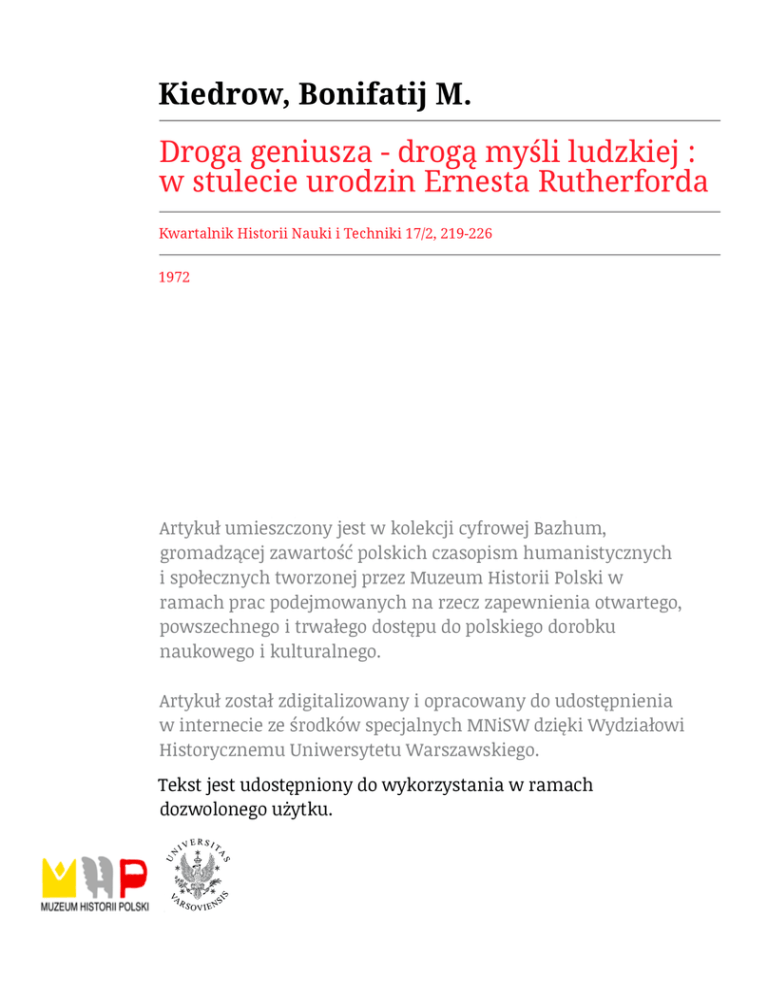 A R Bonifatij M. T Y K U Ł Y Kiedrow DROGA GENIUSZA — DROGĄ MYŚLI LUDZKIEJ (W stulecie urodzin Ernesta Rutherforda) * Historia poznania ludzkiego izna wiele zjawisk zadziwiających. Jednym z nich, przyciągającym uwagę nie tylko historyka nauki, ale także psychologa i filozofa, jest zdumiewająca zbieżność drogi kształtowania się i rozwoju genialnej osobowości uczonego z drogą, którą przebywała myśl ludzka na przestrzeni całej historii ludzkości. Jaskrawym przykładem takiej zbieżności jest twórczość wielkiego fizyka angielskiego, twórcy fizyki jądrowej, Ernesta Rutherforda, którego stulecie urodzin obchodziliśmy 30 sierpnia 1971 r. I W swoim zaraniu nauka miała głównie charakter filozofii przyrody: brakujące ogniwa naukowej eksplikacji obserwowanych zjawisk, a nawet same wiadomości o takich zjawiskach zastępowała spekulatywną refleksją. Tak właśnie działo się np. w fizyce i chemii. Można to doskonale prześledzić w historii teorili atomistycznej i doktryny o żywiołach jako pierwiastkowych składnikach materii. Starożytni myśliciele greccy rozwijali atomistyczną teorię budowy materii, a filozofowie przyrody od Empedoklesa do Arystotelesa wypracowali doktrynę o czterech elementach, która stała się pierwowzorem późniejszych poglądów na pierwiastki chemiczne, Zwłaszcza na cztery 'pierwiastki organogeniczne, których zwiąźki zaczęła w XIX w. badać i syntetyzować chemia organiczna. Wszakże ani chemia, ani fizyka nie mogły powstać jako samodzielne gałęzie nauk przyrodniczych, dopóki nie nauczyły się oddzielać faktów od domysłów i zmyśleń, czyli od tego wszystkiego, co wniosła filozofia przyrody. Bez dokładnlie sprawdzonych, dowiedzionych i w tym sensie ustalonych faktów nie mogła ukonstytuować się żadna nauka. Dlatego też i w chemii, badającej budowę su'bstancyj, w XVII i XVIII w. wysunęło się na plan pierwszy zadanie natury czysto empirycznej: musiała ona nauczyć się wyodrębniać i 'oczyszazać substancje, rozkładać je na części składowe, doprowadzając rozkład do ostatecznych granic, czyli do pierwiastków chemicznych. I dopiero, gdy nagromadzono dostateczny materiał empiryczny dotyczący składu różnych substancji, można było przystąpić do jego teoretycznego objaśniania i uogólniania. Osiągnięto to w teorii budowy materii. Już w połowie XVIII w. Łomonosow formułował, w formie hipotez, poglądy atomistyczne, ale nie miały one jeszcze 'oparcia w solidnym * Artykuł akademika B. M. Kiedrowa, dyrektora Instytutu Historiii Przyrodoznawstwa i Techniki AN ZSRR, tłumaczył z rosyjskiego Tadeusz Zabłudowski. (Przypis redakcji). K W A R T A L N I K H I S T O R I I N A U K I I T E C H N I K I , R O K X V I I — Nr 2 220 Bonifatij M. Kiedrow materiale empirycznym. Dopieno na początku XIX w. Dalton stworzył atomistykę chemiazną jako teorię tłumaczącą zjawiska chemiczne i wewnętrzną budowę materii. Teoria ta rozwijała się szybko i na jej podstawie zaczęto syntetyzować nowe substancje, szczególnie w dziedzinie chemii organicznej, z której osiągnięciami wiąże się powstanie produkcji barwników anilinowych oraz przemysłu farmaceutycznego i perfumeryjnego. Wytwarzano teraz sztucznie nie tylko substancje istniejące w przyrodzie, lecz również takie, których obecności w przyrodzie nie stwierdzano. Był to wyższy poziom rozwoju chemii niż poprzedni, na którym znano tylko substancje istniejące w przyrodzie. Wreszcie, gdy Mendel ej ew odkrył prawo okresowości pierwiastków chemicznych i przewidział istnienie nie znanych jeszcze wówczas pierwiastków (1869—1871) i gdy te pierwiastki rzeczywiście odkryto (1875— 1886), osiągnęła chemia jako nauka o budowie substancyj najwyższe stadium swego rozwoju. W tym stadium występuje funkcja prognostyczna nauki. Tak więc na przykładzie chemii możemy się przekonać, że droga rozwoju poznania ludzkiego przebiega przez: stadium filozofii przyrody (wysuwanie idei ogólnych), stadium empiryczne (gromadzenie faktów), stadium teoretyczne (objaśnianie obserwowanych zjawisk), stadium odkrywania tego, co istnieje w przyrodzie, i wreszcie stadium formułowania weryfikowalnych prognoz, które następnie znajdą potwierdzenie. Idee zrodzone w zaraniu myśli naukowej, w czasach panowania filozofii przyrody, nie poszły w zapomnienie, lecz zachowały się w dalszym ruchu myśli ludzkiej i przyoblekły się w ciało danych naukowych, stając się podstawą naukowych badań i odkryć, hipotez i teorii. Idea atomizmu nie 'zanikła z chwilą, gdy zarzucono spekulatywno-fi 1 ozof iczn e podejście do przyrody i jej poznania, lecz odradzała się raz po raz, aż w pracach Daltona stała się hipotezą chemiczną, a następnie, w miarę sukcesów praktycznych, wzniosła się do wyżyn teorii naukowej. Znaczy to, że nie wolno przekreślać wsizystkiego, co jest związane ze stadium spektulatywno-filozoficznym w rozwoju nauki, lecz że i tu dostrzegać trzeba ciągłość rozwojową. Z tego punktu widzenia przyjrzyjmy się teraz twórczości Rutherforda. II W 1891 г., u progu swej działalności naukowej, Rutherford jako 20-letni student wygłosił na uniwersytecie, którego był słuchaczem, referat o ewolucji materii. W tym referacie /wypowiedział myśli o podzielności atomów i ich złożonej budowie, wysuwając przypuszczenie, że składają się one z jakichś cząstek bardziej elementarnych. Była to w gruncie rzeczy idea spekulatywna w rodzaju tych, którymi operowała filozofia przyrody. W tym czasie bowiem nie posiadano jeszcze żadnych bezpośrednich danych eksperymentalnych, które by ją uzasadniały, jakkolwiek idea o złożonej budowie atomów i zmienności pierwiastków unosiła się już w powietrzu. Referat młodego studenta spotkał się z ironicznymi uwagami i sprzeciwem słuchaczy. Rutherford nie dał się jednak speszyć. Wierzył w słuszność swej idei, ale uświadomił sobie, że w nauce przekonać m