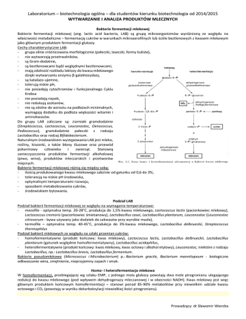 Laboratorium – biotechnologia ogólna – dla studentów kierunku biotechnologia od 2014/2015 WYTWARZANIE I ANALIZA PRODUKTÓW MLECZNYCH Bakterie fermentacji mlekowej Bakterie fermentacji mlekowej (ang. lactic acid bacteria, LAB) są grupą mikroorganizmów wyróżnioną ze względu na właściwości metaboliczne – fermentację cukrów w warunkach mikroaerofilnych lub ściśle beztlenowych z kwasem mlekowym jako głównym produktem fermentacji glukozy. Cechy charakterystyczne LAB: - grupa silnie zróżnicowana morfologicznie (pałeczki, laseczki, formy kuliste), - nie wytwarzają przetrwalników, - są Gram-dodatnie, - są beztlenowcami bądź względnymi beztlenowcami, - mają zdolność rozkładu laktozy do kwasu mlekowego dzięki wytwarzaniu enzymu β-galaktozydazy, - są katalazo-ujemne, - tolerują niskie pH, - nie posiadają cytochromów i funkcjonalnego Cyklu Krebsa - nie posiadają rzęsek, - nie redukują azotanów, - nie są zdolne do wzrostu na podłożach minimalnych, wymagają dodatku do podłoża większości witamin i aminokwasów. Do grupy LAB zaliczane są: ziarniaki gramdodatnie (Streptococcus, Lactococcus, Leuconostoc, Oenococcus, Pediococcus), gramdodatnie pałeczki z rodzaju Lactobacillus oraz rodzaj Bifidobacterium. Naturalnym środowiskiem występowania LAB jest mleko, rośliny, kiszonki, a także błony śluzowe oraz przewód pokarmowy człowieka i zwierząt. Stanowią zanieczyszczenia produktów fermentacji alkoholowej (piwo, wino), produktów mleczarskich i przetworów mięsnych. Bakterie fermentacji mlekowej różnią się między sobą: - ilością produkowanego kwasu mlekowego zależnie od gatunku od 0,6 do 3%, - tolerancją na niskie pH środowiska, - optymalnymi temperaturami rozwoju, - sposobem metabolizowania cukrów, - środowiskiem bytowania. Podział LAB Podział bakterii fermentacji mlekowej ze względu na wymagania temperaturowe: - mezofile - optymalna temp. 20-28°C, produkcja do 1,5% kwasu mlekowego, Lactococcus lactis (paciorkowiec mlekowy), Lactococcus cremoris (paciorkowiec śmietanowy), Lactobacillus casei, Lactobacillus plantarum, Leuconostoc (Leuconostoc citrovorum - bywa używany jako dodatek do zakwasów przy wyrobie masła), - termofile – optymalna temp. 40-45°C, produkcja do 3% kwasu mlekowego, Lactobacillus delbrueckii, Streptococcus thermophilus Podział bakterii mlekowych ze względu na szlaki przemian cukrów: - homofermentatywne (produkt końcowy: kwas mlekowy), Lactococcus lactis, Lactobacillus delbrueckii, Lactobacillus plantarum (gatunek względnie homofermentatywny), Lactobacillus acidophilus, - heterofermentatywne (produkt końcowy: kwas mlekowy, kwas octowy i alkohol etylowy), Leuconostoc, niektóre z rodzaju Lactobacillus, np.: Lactobacillus brevis, Lactobacillus fermentum. Bakterie pseudomlekowe (Micrococcus i Microbacterium) p.: Bacterium gracile, Bacterium mannitopeum - biologiczne odkwaszanie wina, zmętnienie, nieprzyjemny zapach i smak. Homo- i heterofermentacja mlekowa W homofermentacji, przebiegającej wg szlaku EMP, z jednego mola glukozy powstają dwa mole pirogronianu ulegającego redukcji do kwasu mlekowego (pod wpływem dehydrogenazy mleczanowej i w obecności NADH). Kwas mlekowy jest więc głównym produktem końcowym homofermentacji – stanowi ponad 85-90% metabolitów przy niewielkim udziale kwasu octowego i CO2 (powstają w wyniku dekarboksylacji niewielkiej ilości pirogronianu). Prowadzący: dr Sławomir Wierzba Laboratorium – biotechnologia ogólna – dla studentów kierunku biotechnologia od 2014/2015 WYTWARZANIE I ANALIZA PRODUKTÓW MLECZNYCH Hydroliza laktozy u bakterii LAB. Wolna laktoza (u bakterii termofilnych) hydrolizowana wewnątrz komórki do glukozy i galaktozy (β-galaktozydaza), glukoza wchodzi w szlak glikolityczny (EMP)bezpośrednio, galaktoza jest przekształcana w ufosforylowaną glukozę w szlaku Leloira. Ufosforylowana laktoza (u bakterii mezofilnych) jest hydrolizowana przez fosfo-βgalaktozydazę do glukozy i galaktozo-6-fosforanu, który następnie jest przekształcany do fosfodihydroksyacetonu i aldehydu trifosfoglecerynowego (szlak tagatozowy) i w takiej postaci są włączane do szlaku EMP. W przypadku heterofermentacji glukoza ulega glikolizie w szlaku HMP, a częściowo w szlaku EMP. W wyniku tych przemian na każdy mol kwasu mlekowego powstaje dodatkowo 1 mol etanolu lub kwasu octowego oraz 1 mol dwutlenku węgla. Końcowym produktem heterofermentacji jest więc tylko w około 50% kwas mlekowy. Pozostałe metabolity stanowią głównie kwas octowy, etanol i CO2. Ponadto, w trakcie fermentacji mlekowej u obu typów bakterii powstają śladowe ilości dodatkowych produktów ubocznych nadających charakterystyczne cechy organoleptyczne powstającym produktom fermentacji: diacetyl, acetoina, aldehyd octowy, w mniejszych ilościach: kwasy lotne (propionowy, mrówkowy), lotne kwasy tłuszczowe, alkohole, aceton i estry. Na przykład Streptococcus diacetilactis, pałeczka heterofermentatywna, wytwarza niewielkie ilości kwasu octowego, etanolu oraz diacetylu – związek ten odpowiada za powstawanie świeżego zapachu masła. Specyficzny rodzaj heterofermentacji mlekowej przeprowadzają bifidobakterie – jest to to szlak fosfoketolazy pentozowej. Ten odrębny szlak jest wynikiem obecności u bifidobakterii specyficznych enzymów zastępujących kluczowe enzymy odpowiedzialne za przeprowadzanie typowej fermentacji mlekowej. Sumaryczny schemat heterofermentacji typu Bifidobacterium przedstawia się następująco: 2 C6H12O6 → 2 CH3-CHOH-COOH + 3 CH3COOH glukoza kwas mlekowy kwas octowy Charakterystyka LAB Rodzaj Lactobacillus: L. acidophilus, L. amylovorus, L. casei, L. crispatus, L. gasseri, L. johnsonii, L. paracasei, L. plantarum, L. reuteri, L. rhamnosus. - Grupa I bezwzględnie homofermentatywne (fermentują heksozy do kwasu mlekowego, pentozy i glukonian nie fermentują). Obejmuje 15 gatunków, z których tylko: L. delbrueckii, L. helveticus, L. acidophilus są wykorzy