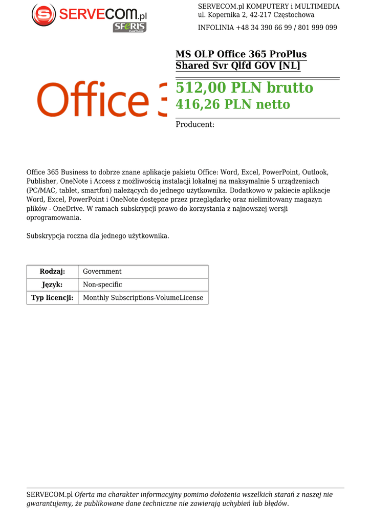 SERVECOM.pl KOMPUTERY i MULTIMEDIA ul. Kopernika 2, 42-217 Częstochowa INFOLINIA +48 34 390 66 99 / 801 999 099 MS OLP Office 365 ProPlus Shared Svr Qlfd GOV [NL] 512,00 PLN brutto 416,26 PLN netto Producent: Office 365 Business to dobrze znane aplikacje pakietu Office: Word, Excel, PowerPoint, Outlook, Publisher, OneNote i Access z możliwością instalacji lokalnej na maksymalnie 5 urządzeniach (PC/MAC, tablet, smartfon) należących do jednego użytkownika. Dodatkowo w pakiecie aplikacje Word, Excel, PowerPoint i OneNote dostępne przez przeglądarkę oraz nielimitowany magazyn plików - OneDrive. W ramach subskrypcji prawo do korzystania z najnowszej wersji oprogramowania. Subskrypcja roczna dla jednego użytkownika. Rodzaj: Government Język: Non-specific Typ licencji: Monthly Subscriptions-VolumeLicense SERVECOM.pl Oferta ma charakter informacyjny pomimo dołożenia wszelkich starań z naszej nie gwarantujemy, że publikowane dane techniczne nie zawierają uchybień lub błędów.
