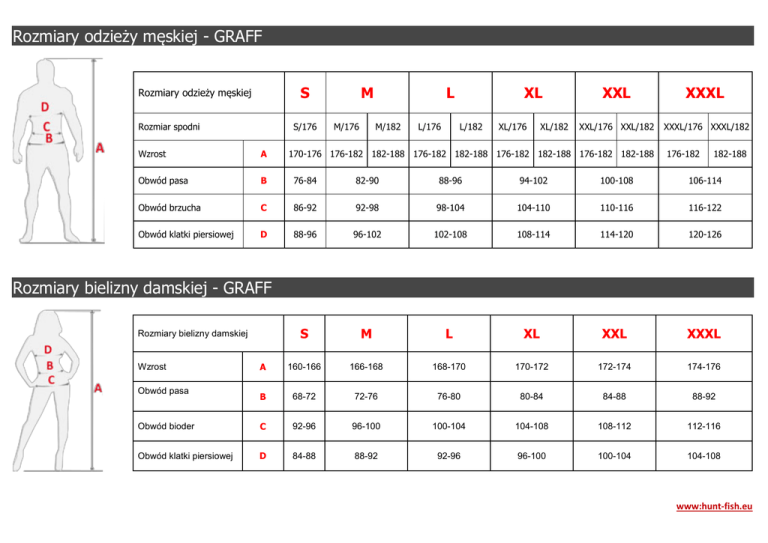 Rozmiary odzieży męskiej - GRAFF S Rozmiary odzieży męskiej Rozmiar spodni S/176 M M/176 L M/182 L/176 XL L/182 XL/176 XL/182 XXL XXXL XXL/176 XXL/182 XXXL/176 XXXL/182 Wzrost A 170-176 176-182 182-188 176-182 182-188 176-182 182-188 176-182 182-188 176-182 182-188 Obwód pasa B 76-84 82-90 88-96 94-102 100-108 106-114 Obwód brzucha C 86-92 92-98 98-104 104-110 110-116 116-122 Obwód klatki piersiowej D 88-96 96-102 102-108 108-114 114-120 120-126 S M L XL XXL XXXL A 160-166 166-168 168-170 170-172 172-174 174-176 B 68-72 72-76 76-80 80-84 84-88 88-92 Obwód bioder C 92-96 96-100 100-104 104-108 108-112 112-116 Obwód klatki piersiowej D 84-88 88-92 92-96 96-100 100-104 104-108 Rozmiary bielizny damskiej - GRAFF Rozmiary bielizny damskiej Wzrost Obwód pasa www:hunt-fish.eu