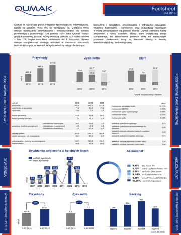 Factsheet 3Q 2015 Qumak to największy polski integrator technologiczno-informatyczny. Działa na polskim rynku ITC od trzydziestu lat. Giełdowa firma oferuje rozwiązania informatyczne i infrastrukturalne dla sektora prywatnego i publicznego. Od połowy 2014 roku Qumak tworzy grupę kapitałową, w skład której wchodzą obecnie trzy spółki zależne – Star ITS, Skylar oraz MAE Multimedia Art & Education. Spółka oferuje kompleksową obsługę wdrożeń w dwunastu obszarach technologicznych, w ramach których świadczy usługi obejmujące: Przychody konsulting i doradztwo, projektowanie i wdrażanie rozwiązań, wsparcie techniczne i serwisowe oraz rozbudowę rozwiązań w miarę zmieniających się potrzeb klienta. Qumak zatrudnia kadrę ekspertów z wielu dziedzin, którzy stale zwiększają swoje kompetencje, by realizowane projekty stały na najwyższym poziomie. Partnerami firmy są światowi liderzy z branży teleinformatycznej i technologicznej. Zysk netto EBIT 577,5 540,1 12,7* 10,4 12,6* 11,7 9,2* 482,6 mln zł PODSTAWOWE DANE FINANSOWE 2012 2013 -3,7 2014 2012 2013 -3,2 2014 2012 2013 2014 *wynik oczyszczony z rezerw mln zł 2012 2013 2014 przychody zysk brutto ze sprzedaży 482,6 71,2 540,1 80,4 577,5 79,5 10,4 7,1 -3,7 zysk netto koszty sprzedaży 43,9 53,4 66,0 13 13,2 12,1 34,1 -0,5 15,5 -2,9 -3,1 -6,8 1,7 -21,5 koszt ogólnego zarządu z działalności operacyjnej z działalności inwestycyjnej przepływy środków pieniężnych Z działalności finansowej aktywa ogółem środki pieniężne i ich ekwiwalenty zobowiązania i rezerwy na zobowiązania kapitał własny 2014 rentowność sprzedaży brutto 12,71% rentowność EBITDA -0,05% rentowność zysku operacyjnego -0,56% rentowność brutto -0,72% rentowność netto -0,64% wskaźnik zadłużenia ogólnego 0,74 -10,4 wskaźnik zadłużenia oprocentowanego do aktywów 0,08 wskaźnik pokrycia aktywów trwałych kapitałem własnym 3,49 wskaźnik zadłużenia kapitału własnego 0,31 wskaźnik bieżącej płynności (current ratio) 1,34 wskaźnik szybkiej płynności (quick ratio) 0,98 283,6 235,2 269,8 46,1 37,0 16,7 189,1 94,6 152,8 84,4 198,1 69,6 Dywidenda wypłacona w kolejnych latach Akcjonariat 18,2 13% 10,4 mln zł 6% 10,4 9,97% 8,13% 5,38% 9, 54% 9,25% 65,86% 10,4 8% 7% 3,6 2,5 2% 3% 2007 2008 2009 2010 2011 2012 w tym Leg Mason Parasol FIO OFE PZU „Złota Jesień” PTE Allianz Polska S.A. Aviva PTE Aviva BZ WBK S.A. pozostali akcjonariusze 2014 Zysk netto Backlog 526 43% 29% % 523,4 404,9 454 7,1 368 1-3Q 2015 3Q2012 377 mln zł 5,3 1-3Q 2014 1-3Q 2015 1-3Q 2014 3Q2013 3Q2014 3Q2015 (na 30.10.2015) WYNIKI FINANSOWE 1-3Q 2015 WYNIKI FINANSOWE 1-3Q 2015 Przychody 2013 Leg Mason TFI AKCJONARIAT DYWIDENDA wartość dywidendy stopa dywidendy PODSTAWOWE DANE FINANSOWE 7,8 7,3 Ranking IDG TOP 200 – 2014; *na podstawie szacunków własnych 1. 0 dostawca rozwiązań i usług IT dla sektora edukacyjnego i naukowo-badawczego 2. dostawca rozwiązań inteligentnych budynków pod względem przychodów z sektora przemysłowego i budowlanego wśród dostawców usług integracyjnych wśród dostawców usług centrów i przetwarzania danych 5. największy dostawca serwerów RYNEK I STRATEGIA POZYCJA RYNKOWA dostawca rozwiązań w infrastrukturze lotniczej * Qumak wdraża obecnie strategię rozpisaną na lata 2013-2016. Zgodnie z nią spółka skupia się na obszarach, w których ma silną pozycję rynkową oraz intensywnie eksploruje nowe, często niszowe, segmenty rynku. Mapa zainteresowań Grupy Qumak obejmuje projekty z szeroko pojętego pola nowoczesnych technologii, skierowane na cyfryzację kraju, unowocześnienie infrastruktury, podniesienie dostępności Internetu, rozwój e-administracji, dostępności dóbr kultury i ogólnie podniesienia jakości życia obywateli. W ciągu zaledwie kilku lat Qumak, zaczynając praktycznie od zera, zdobył wiodącą pozycję na rynku bezpieczeństwa lotniczego, ekspozycji multimedialnych i inteligentnych systemów transportowych (ITS). Spółka od lat utrzymuje się w czołówce firm wyspecjalizowanych w wysokozaawansowanych technologiach budynkowych oraz realizacji zaawansowanych technologicznie centrów danych. Qumak działa równie intensywnie na rynku publicznym, jak i prywatnym. Strategia spółki w dużym stopniu stymulowana jest przez fundusze unijne, dlatego duży wpływ na jej realizację będzie miała nowa perspektywa EU na lata 2014-20. Rynek, na którym działa Qumak wart jest ok. 33 mld zł. Ocenia się, że już w 2017 r. może osiągnąć wartość nawet 50 mld zł i stanie się tym samym drugim co do wielkości w Europie Środkowo-Wschodniej. Wysokie tempo wzrostu w sektorze IT determinowane jest głównie zewnętrznymi źródłami finansowania inwestycji i szybkim rozwojem technologicznym. LINIE BIZNESOWE Paweł Jaguś Prezes Zarządu Funkcję Prezesa Zarządu pełni od marca 2006 roku. Z firmą związany od ponad 22 lat. Absolwent Akademii GórniczoHutniczej w Krakowie. Jacek Suchenek Wiceprezes Zarządu ds. Realizacji Grupa QUMAK S.A. spółka notowana na GPW od 2006 roku 93% udział w kapitale 90% udział w kapitale Wojciech Strusiński 58% Wiceprezes Zarządu ds. Sprzedaży Z firmą Qumak związany do ponad 10 lat. Od stycznia 2013 r. kieruje Pionem Handlowym Spółki. Posiada dyplom Executive MBA, wydany wspólnie przez ESSEC Business School oraz SGGW. Marek Tiahnybok Star ITS to spółka powołana do realizacji Smart Cities, a zwłaszcza inteligentnych systemów zarządzania transportem. Wykonuje projekty w zakresie systemów inżynierii ruchu, realizuje je oraz zajmuje się ich udoskonalaniem i rozbudową Kontakt Firma specjalizuje się w projektach związanych z modernizacją i serwisem lotnisk i lądowisk a także wdrożeniach zapewniających bezpieczeństwo w portach lotniczych MAE opracowuje i wdraża projekty z wykorzystaniem nowoczesnych technologii dla obiektów muzealnych i wystawienniczych wraz z opracowaniem własnego kontentu multimedialnego 