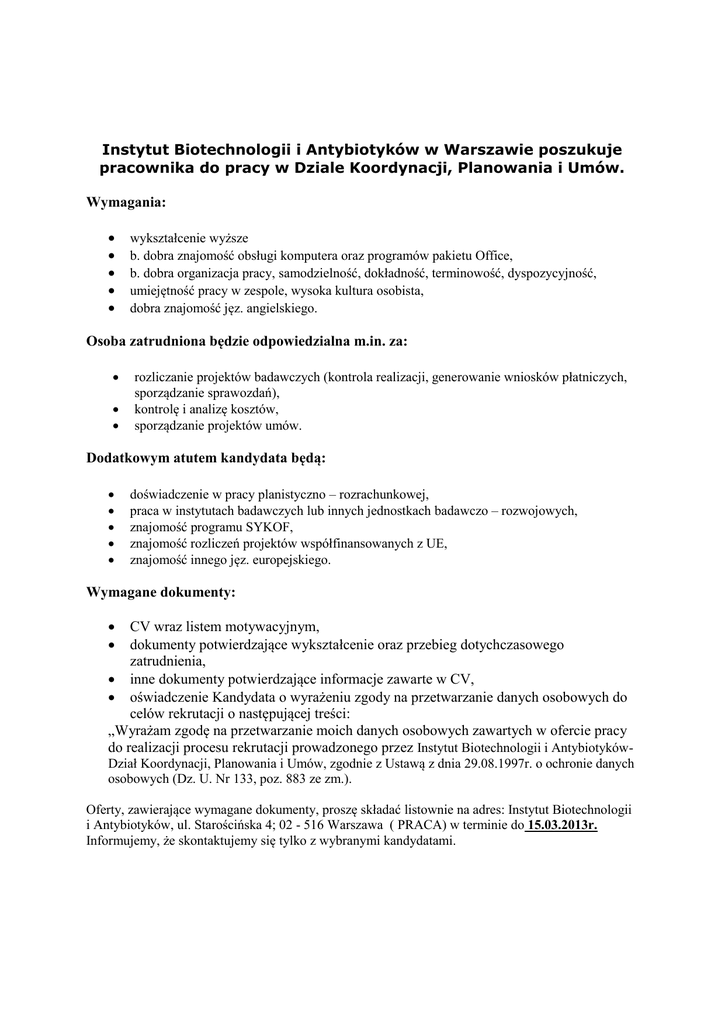 Instytut Biotechnologii i Antybiotyków w Warszawie poszukuje pracownika do pracy w Dziale Koordynacji, Planowania i Umów. Wymagania: wykształcenie wyższe b. dobra znajomość obsługi komputera oraz programów pakietu Office, b. dobra organizacja pracy, samodzielność, dokładność, terminowość, dyspozycyjność, umiejętność pracy w zespole, wysoka kultura osobista, dobra znajomość jęz. angielskiego. Osoba zatrudniona będzie odpowiedzialna m.in. za: rozliczanie projektów badawczych (kontrola realizacji, generowanie wniosków płatniczych, sporządzanie sprawozdań), kontrolę i analizę kosztów, sporządzanie projektów umów. Dodatkowym atutem kandydata będą: doświadczenie w pracy planistyczno – rozrachunkowej, praca w instytutach badawczych lub innych jednostkach badawczo – rozwojowych, znajomość programu SYKOF, znajomość rozliczeń projektów współfinansowanych z UE, znajomość innego jęz. europejskiego. Wymagane dokumenty: CV wraz listem motywacyjnym, dokumenty potwierdzające wykształcenie oraz przebieg dotychczasowego zatrudnienia, inne dokumenty potwierdzające informacje zawarte w CV, oświadczenie Kandydata o wyrażeniu zgody na przetwarzanie danych osobowych do celów rekrutacji o następującej treści: „Wyrażam zgodę na przetwarzanie moich danych osobowych zawartych w ofercie pracy do realizacji procesu rekrutacji prowadzonego przez Instytut Biotechnologii i AntybiotykówDział Koordynacji, Planowania i Umów, zgodnie z Ustawą z dnia 29.08.1997r. o ochronie danych osobowych (Dz. U. Nr 133, poz. 883 ze zm.). Oferty, zawierające wymagane dokumenty, proszę składać listownie na adres: Instytut Biotechnologii i Antybiotyków, ul. Starościńska 4; 02 - 516 Warszawa ( PRACA) w terminie do 15.03.2013r. Informujemy, że skontaktujemy się tylko z wybranymi kandydatami.