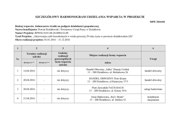SZCZEGÓŁOWY HARMONOGRAM UDZIELANIA WSPARCIA W PROJEKCIE SHW 2016/04 Rodzaj wsparcia: Jednorazowe środki na podjęcie działalności gospodarczej. Nazwa beneficjenta: Powiat Działdowski / Powiatowy Urząd Pracy w Działdowie Numer Projektu: RPWM.10.01.00-28-0004/16-00 Tytuł Projektu: „Aktywizacja osób bezrobotnych w wieku powyżej 29 roku życia w powiecie działdowskim (II)” Okres realizacji projektu: 01.01.2016 – 31.12.2016 1 2 3 Terminy realizacji (od-do) Godziny realizacji poszczególnych form wsparcia (od-do) Lp. 4 6 Miejsce realizacji formy wsparcia Uwagi Adres dd-mm-rrr*** dd-mm-rrr*** 1 14.04.2016 - nie dotyczy Handel Obwoźny „Julka” Danuta Cieślak 13 – 200 Działdowo, ul. Bielnikowa 26 handel obwoźny 2 20.04.2016 - nie dotyczy HANDEL OBWOŻNY Piotr Kinast 13 – 200 Działdowo, ul Katarzyny 37/3 handel obwoźny 3 20.04.2016 - nie dotyczy Piotr Zawodnik FACH-DACH 13 – 200 Działdowo, ul. Kisiny 54 b usługi budowlane 4 21.04.2016 - nie dotyczy Irena Dąbrowska „Styl i Moda” 13 – 200 Działdowo, ul. Hallera 33 działalność stacjonarna 5 21.04.2016 - nie dotyczy USŁUGI OGÓLNOBUDOWLANE GRZEGORZ TRZCIŃSKI 13 – 230 Lidzbark, ul. Podleśna 26 6 22.04.2016 - nie dotyczy MARIAN KROPLEWSKI 13 – 220 Rybno, Hartowiec 94 usługi budowlane 7 26.04.2016 - nie dotyczy Małgorzata Jaworska 13 – 200 Działdowo, Burkat 37 działalność stacjonarna 8 26.04.2016 - nie dotyczy Produkcja Odzieży Roboczej Maria Jolanta Olba 13 – 220 Rybno, ul. Lubawska 7 działalność stacjonarna 9 26.04.2016 - nie dotyczy Daniel Kowalski USŁUGI OGÓLNOBUDOWLANE 13 – 206 Płośnica, ul. Dworcowa 116 usługi budowlane 10 25.04.2016 - nie dotyczy Piotr Kiński - PIOTREX 13 – 206 Płośnica, Rutkowice 26/1 działalność stacjonarna 11 28.04.2016 - nie dotyczy Firma Handlowo-Usługowa Daniel Hillar 13 – 220 Rybno, Grabacz 1 działalność stacjonarna 12 28.04.2016 - nie dotyczy Jan Biedacha FIRMA USŁUGOWA 13 – 200 Działdowo, ul. ZMW Wici 12 usługi mobilne 13 05.05.2016 - nie dotyczy Kompleksowe Wykończenia Wnętrz Jarosław Tomasz Ryński 13 – 200 Działdowo, ul. Leśna 11B/2 usługi budowlane 14 10.05.2016 - nie dotyczy Patrycja Ćwiklińska „KART-DECOR” 13 – 200 Działdowo, ul. Czyżewskiego 27 sprzedaż przez Internet usługi budowlane 15 16.05.2016 - nie dotyczy Firma Usługowa „PIECYK” Krzysztof Pieckowski 13 – 240 Iłowo – Osada, Wierzbowo 8 usługi mobilne 16 13.05.2016 - nie dotyczy „MAR-PAR” Katarzyna Paradowska 13 – 230 Lidzbark, Nowy Dwór 31 usługi mobilne 17 16.05.2016 - nie dotyczy USŁUGI ELEKTRYCZNE SŁAWOMIR LABICKI 13 – 220 Rybno, ul. Zajeziorna 64 usługi mobilne 18 17.05.2016 - nie dotyczy Mariusz Prusak Usługi Gazowo-Hydrauliczne 13 – 230 Lidzbark, Cibórz 43 usługi mobilne 19 17.05.2016 - nie dotyczy AUTO KOSMETYKA Rober Jankowski 13 – 200 Działdowo, ul. Sportowa 25 działalność stacjonarna 20 18.05.2016 - nie dotyczy Julita Żarczyńska FOTOGRAFIA 13- 214 Uzdowo, Ruszkowo 59 działalność stacjonarna 21 18.05.2016 - nie dotyczy Alicja Krezymon FIRMA HANDLOWO - USŁUGOWA 13 – 200 Działdowo, ul. Czyżewskiego 3 usługi mobilne 22 19.05.2016 - nie dotyczy Zakład Usług Budowlanych – Adrian Senaj 13 – 230 Lidzbark, ul. Zieluńska 92 usługi budowlane 23 19.05.2016 - nie dotyczy SaxArt ROBERT SCHADE 13 – 230 Lidzbark, Grądy 10/B usługi mobilne 24 13.06.2016 - nie dotyczy Oczekuje na rozpoczęcie działalności 13 – 200 Działdowo, ul. Różana 1 usługi mobilne 25 16.06.2016 Data sporządzenia: 21.06.2016r. Sporządziła: Maria Cherkowska - nie dotyczy Oczekuje na rozpoczęcie działalności 13 – 200 Działdowo, ul. Orzeszkowej 1c/19 usługi mobilne
