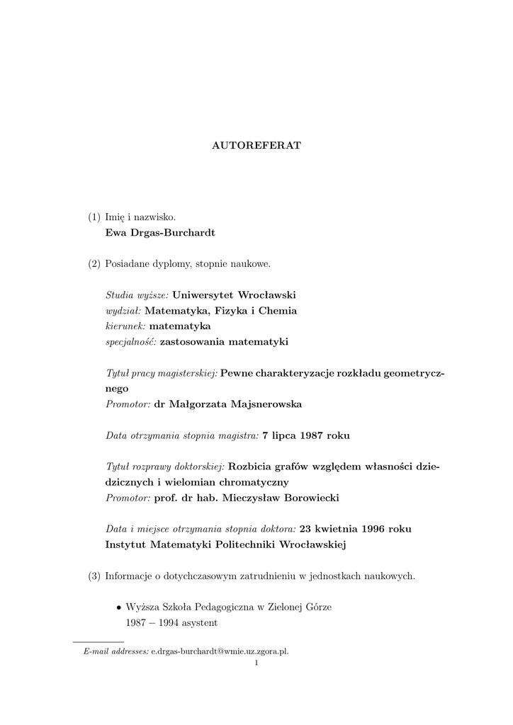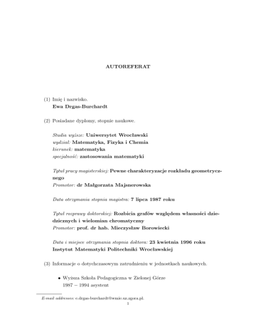AUTOREFERAT (1) Imię i nazwisko. Ewa Drgas
