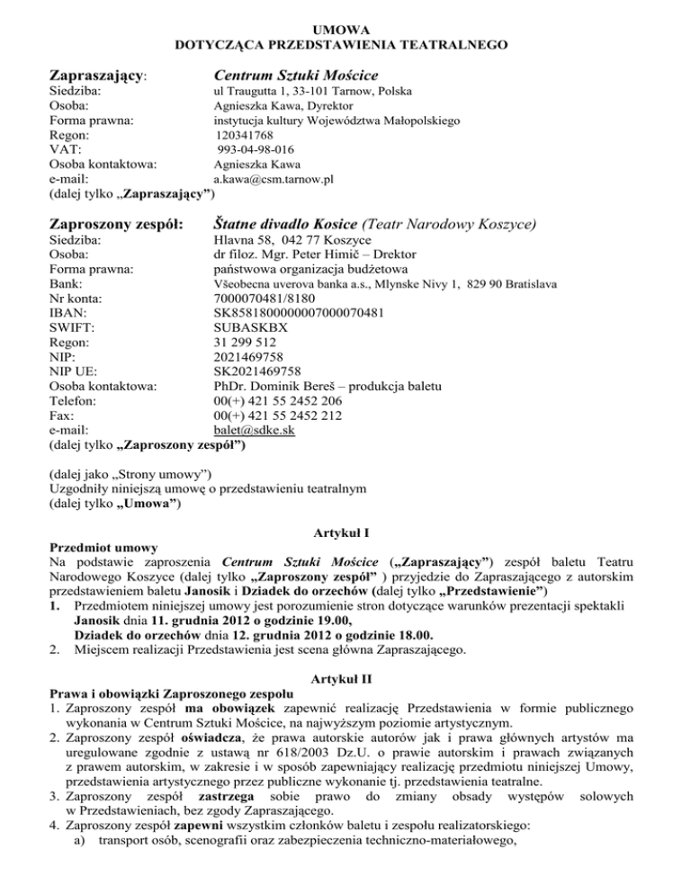 UMOWA DOTYCZĄCA PRZEDSTAWIENIA TEATRALNEGO Zapraszający: Centrum Sztuki Mościce Siedziba: ul Traugutta 1, 33-101 Tarnow, Polska Osoba: Agnieszka Kawa, Dyrektor Forma prawna: instytucja kultury Województwa Małopolskiego Regon: 120341768 VAT: 993-04-98-016 Osoba kontaktowa: Agnieszka Kawa e-mail: [email protected] (dalej tylko „Zapraszający”) Zaproszony zespół: Štatne divadlo Kosice (Teatr Narodowy Koszyce) Siedziba: Hlavna 58, 042 77 Koszyce Osoba: dr filoz. Mgr. Peter Himič – Drektor Forma prawna: państwowa organizacja budŜetowa Bank: Všeobecna uverova banka a.s., Mlynske Nivy 1, 829 90 Bratislava Nr konta: 7000070481/8180 IBAN: SK8581800000007000070481 SWIFT: SUBASKBX Regon: 31 299 512 NIP: 2021469758 NIP UE: SK2021469758 Osoba kontaktowa: PhDr. Dominik Bereš – produkcja baletu Telefon: 00(+) 421 55 2452 206 Fax: 00(+) 421 55 2452 212 e-mail: [email protected] (dalej tylko „Zaproszony zespół”) (dalej jako „Strony umowy”) Uzgodniły niniejszą umowę o przedstawieniu teatralnym (dalej tylko „Umowa”) Artykuł I Przedmiot umowy Na podstawie zaproszenia Centrum Sztuki Mościce („Zapraszający”) zespół baletu Teatru Narodowego Koszyce (dalej tylko „Zaproszony zespół” ) przyjedzie do Zapraszającego z autorskim przedstawieniem baletu Janosik i Dziadek do orzechów (dalej tylko „Przedstawienie”) 1. Przedmiotem niniejszej umowy jest porozumienie stron dotyczące warunków prezentacji spektakli Janosik dnia 11. grudnia 2012 o godzinie 19.00, Dziadek do orzechów dnia 12. grudnia 2012 o godzinie 18.00. 2. Miejscem realizacji Przedstawienia jest scena główna Zapraszającego. Artykuł II Prawa i obowiązki Zaproszonego zespołu 1. Zaproszony zespół ma obowiązek zapewnić realizację Przedstawienia w formie publicznego wykonania w Centrum Sztuki Mościce, na najwyŜszym poziomie artystycznym. 2. Zaproszony zespół oświadcza, Ŝe prawa autorskie autorów jak i prawa głównych artystów ma uregulowane zgodnie z ustawą nr 618/2003 Dz.U. o prawie autorskim i prawach związanych z prawem autorskim, w zakresie i w sposób zapewniający realizację przedmiotu niniejszej Umowy, przedstawienia artystycznego przez publiczne wykonanie tj. przedstawienia teatralne. 3. Zaproszony zespół zastrzega sobie prawo do zmiany obsady występów solowych w Przedstawieniach, bez zgody Zapraszającego. 4. Zaproszony zespół zapewni wszystkim członków baletu i zespołu realizatorskiego: a) transport osób, scenografii oraz zabezpieczenia techniczno-materiałowego, b) diety w zakresie prawnym, c) wszystkie pozostałe koszty związane z artystycznymi względami, d) niezbędne ubezpieczenie w podróŜy i podczas pobytu u zapraszającego. 5. Zaproszony zespół ma obowiązek: a) pisemnie poinformować Zapraszającego o niemoŜliwości zagrania przedstawienia najpóźniej na 7 dni przed jego realizacją, za informację pisemną uwaŜa się e-mail, b) zapewnić, gotowość i przygotowanie artystów oraz ekipy realizacyjnej, do prezentacji na najwyŜszym poziomie artystycznym. c) zapewnić komplet kostiumów, scenografię i rekwizyty do Przedstawienia d) zapewnić dotrzymanie czasowego harmonogramu przedsięwzięcia. e) zapewnić, aby wszyscy uczestnicy przestrzegali przepisy BHP i PPOś. f) uregulować opłatę licencyjną spółce ochrony praw autorskich LITA. 6. Zaproszony zespół przekaŜe Zapraszającemu swoje materiały reklamowe, zwłaszcza zdjęcia i informacje o spektaklach, jednocześnie przenosi na Zapraszającego prawo do wykorzystania tych materiałów wyłącznie w celu zareklamowania Przedstawień. 7. Zaproszony zespół zobowiązuje się do dostarczenia aktualnego certyfikatu rezydencji podatkowej wydanego przez właściwy urząd do 30 dni od daty podpisania umowy. W przypadku niedostarczenia w/w certyfikatu Zapraszający potrąci 20 % z wartości o której mowa w artykule III punkt 3 na pokrycie podatku. Artykuł III Prawa i obowiązki Zapraszającego 1. Zapraszający zobowiązuje się do zapewnienia artystom przed Przedstawieniem i podczas Przedstawienia odpowiednich warunków do przygotowania jak i jego wykonania wraz z zapleczem. 2. Zapraszający ma obowiązek: a) pisemnie informować Zaproszony zespół o ewentualnej rezygnacji z Przedsięwzięcia i/lub Przedstawienia przynamniej na 7 dni przed jego realizacją, za informację pisemną uwaŜa się email, b) zapewnić warunki techniczne przedstawienia na podstawie wymogów Zaproszonego zespołu, a zwłaszcza: - posprzątanie i opróŜnienia sceny w dniu przedstawienia najpóźniej do godz. 10.00 - potrzebną ilość damskich i męskich szatni dla występujących z urządzeniami sanitarnymi i temperaturą min. 20 st. C oraz szatnię dla garderoby i techniki, - współpracę personelu technicznego w miejscu realizacji Przedstawienia z zespołem realizującym Zaproszonego: akustyk, realizator światła, brygadzista sceny, elektryk, bileterki, poŜarnicy, 4 techników do pomocy do rozładunku i załadunku scenografii i materiałów technicznych; budowę scenografii oraz pozostałych techników zabezpiecza sobie Teatr c) zapewnić reklamę Przedstawienia we wszystkich środkach przekazu, wykorzystując materiały Zaproszonego zespołu, d) zabezpieczyć przedsprzedaŜ i sprzedaŜ biletów na Przedstawienie. 3. Przychód z biletów sprzedanych przez Zapraszającego zostanie podzielony między stronami po połowie. Zapraszający zapłaci wynagrodzenie w wysokości 50 % dochodu (słownie: pięćdziesiąt procent) na podstawie faktury wystawionej przez Zaproszony zespół, w terminie do 14 dni od daty jej otrzymania. Zapraszający wystawi i wyśle raport ze sprzedaŜy biletów w terminie 7 dni od daty Przedstawienia. Miejscem opodatkowania jest PL. 4. Zapraszający zobowiązuje się do zapewnienia zakwaterowania dla Zaproszonego zespołu w standardowej jakości, w nocy z dnia 11 grudnia 2012 do 12 grudnia 2012, na podstawie listy osób stanowiącej zał. nr 1 do niniejszej umowy. 5. Niniejszym Teatr Narodo
