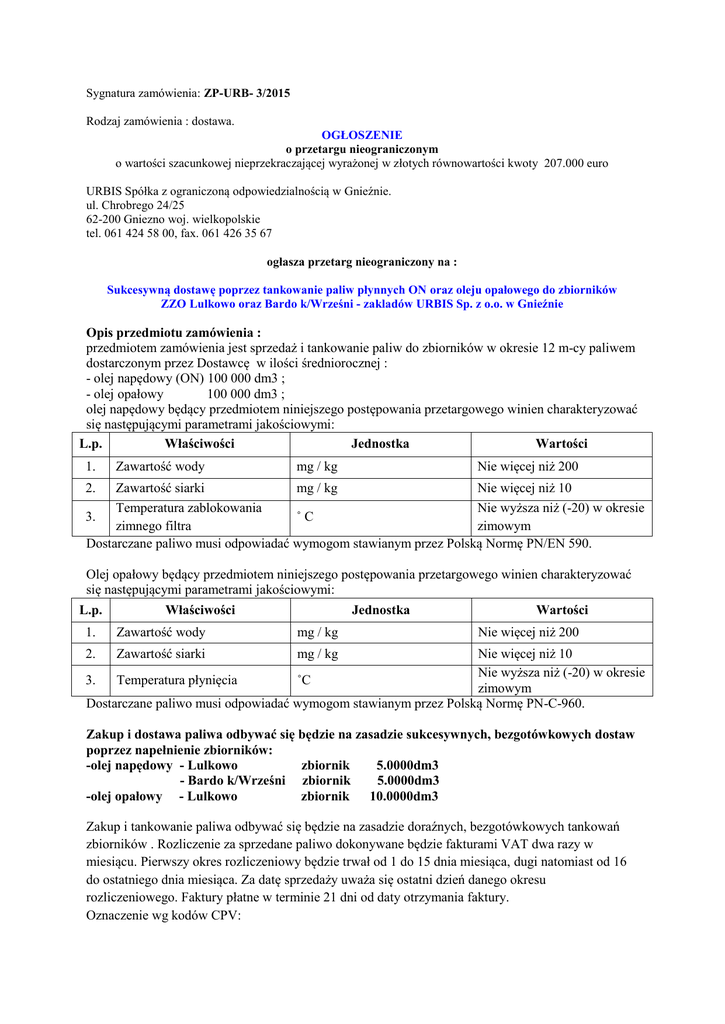 Sygnatura zamówienia: ZP-URB- 3/2015 Rodzaj zamówienia : dostawa. OGŁOSZENIE o przetargu nieograniczonym o wartości szacunkowej nieprzekraczającej wyrażonej w złotych równowartości kwoty 207.000 euro URBIS Spółka z ograniczoną odpowiedzialnością w Gnieźnie. ul. Chrobrego 24/25 62-200 Gniezno woj. wielkopolskie tel. 061 424 58 00, fax. 061 426 35 67 ogłasza przetarg nieograniczony na : Sukcesywną dostawę poprzez tankowanie paliw płynnych ON oraz oleju opałowego do zbiorników ZZO Lulkowo oraz Bardo k/Wrześni - zakladów URBIS Sp. z o.o. w Gnieźnie Opis przedmiotu zamówienia : przedmiotem zamówienia jest sprzedaż i tankowanie paliw do zbiorników w okresie 12 m-cy paliwem dostarczonym przez Dostawcę w ilości średniorocznej : - olej napędowy (ON) 100 000 dm3 ; - olej opałowy 100 000 dm3 ; olej napędowy będący przedmiotem niniejszego postępowania przetargowego winien charakteryzować się następującymi parametrami jakościowymi: L.p. Właściwości Jednostka Wartości 1. Zawartość wody mg / kg Nie więcej niż 200 2. Zawartość siarki mg / kg Nie więcej niż 10 Temperatura zablokowania Nie wyższa niż (-20) w okresie ˚C zimnego filtra zimowym Dostarczane paliwo musi odpowiadać wymogom stawianym przez Polską Normę PN/EN 590. 3. Olej opałowy będący przedmiotem niniejszego postępowania przetargowego winien charakteryzować się następującymi parametrami jakościowymi: L.p. Właściwości Jednostka Wartości 1. Zawartość wody mg / kg Zawartość siarki mg / kg Nie więcej niż 200 Nie więcej niż 10 Nie wyższa niż (-20) w okresie 3. Temperatura płynięcia ˚C zimowym Dostarczane paliwo musi odpowiadać wymogom stawianym przez Polską Normę PN-C-960. 2. Zakup i dostawa paliwa odbywać się będzie na zasadzie sukcesywnych, bezgotówkowych dostaw poprzez napełnienie zbiorników: -olej napędowy - Lulkowo zbiornik 5.0000dm3 - Bardo k/Wrześni zbiornik 5.0000dm3 -olej opałowy - Lulkowo zbiornik 10.0000dm3 Zakup i tankowanie paliwa odbywać się będzie na zasadzie doraźnych, bezgotówkowych tankowań zbiorników . Rozliczenie za sprzedane paliwo dokonywane będzie fakturami VAT dwa razy w miesiącu. Pierwszy okres rozliczeniowy będzie trwał od 1 do 15 dnia miesiąca, dugi natomiast od 16 do ostatniego dnia miesiąca. Za datę sprzedaży uważa się ostatni dzień danego okresu rozliczeniowego. Faktury płatne w terminie 21 dni od daty otrzymania faktury. Oznaczenie wg kodów CPV: kod – 09134100-8 nazwa – olej napędowy; kod – 09135100-5 nazwa – olej opałowy Zamawiający udostępnia SIWZ na stronie internetowej www.urbis.gniezno.pl. Specyfikację Istotnych Warunków Zamówienia można też odebrać w siedzibie zamawiającego Gniezno, ul. Chrobrego 24/25, pok. 4 Dział techniczny Warunkiem udziału w postępowaniu jest wniesienie przed upływem terminu składania ofert wadium w wysokości 20 000 zł,Zamawiający nie dopuszcza składania ofert częściowych. Zamawiający nie dopuszcza składania ofert wariantowych. Termin wykonania zamówienia: od dnia zawarcia umowy do dnia 31-05-2016 r. Zamknięte koperty zawierające oferty należy złożyć w URBIS Spółka z o. o. w Gnieźnie ul. Chrobrego 24/25 sekretariat w nieprzekraczalnym terminie do dnia 25-05-2015r. do godz. 10:00. Koperta winna być oznakowana: "Oferta przetargowa na:” Dostawę poprzez tankowanie paliwa do zbiorników" Otwarcie ofert nastąpi w dniu 25-05-2015r. o godz. 10:15 w siedzibie zamawiającego Gniezno, ul. Chrobrego 24/25 świetlica. Kryterium wyboru oferty i jego znaczenie : cena - 100 % Termin związania ofertą 30 dni . Bieg terminu rozpoczyna się wraz z upływem terminu składania ofert. Osoby upoważnione do kontaktów: W sprawach proceduralnych –Elżbieta Sybilska tel. 0-61 424 58 18, fax 0-61 426 35 67 w godzinach od 7:00 do 15:00, e-mail: [email protected] Zamawiający nie przewiduje ustanowienia dynamicznego sytemu zakupów; Zamawiający nie przewiduje wyboru najkorzystniejszej oferty z zastosowaniem aukcji elektronicznej. Zamawiający nie przewiduje zawarcia umowy ramowej. O udzielenie zamówienia mogą ubiegać się wykonawcy, którzy spełniają warunki określone w art. 22 ust. 1 ustawy Prawo zamówień publicznych: 1. Posiadają uprawnienia do wykonywania czynności objętej przedmiotem zamówienia. 2. Posiadają niezbędną wiedzę i doświadczenie. 3. Dysponują potencjałem technicznym do wykonania przedmiotu zamówienia tj. wykonawca winien posiadać stację paliw na terenie miasta Gniezna . 4. Znajdują się w sytuacji ekonomicznej i finansowej zapewniającej wykonanie zamówienia tj: posiadają ubezpieczenie od odpowiedzialności cywilnej z tytułu prowadzonej działalności gospodarczej. 5. Spełniają warunki zawarte w art.22 ust.1 i nie podlegają wykluczeniu na podstawie art.24 ust.1 i 2 ustawy PZP. Dokumenty i oświadczenia jakie należy złożyć w celu potwierdzenia spełnienia warunków udziału w postępowaniu: 1.Aktualny odpis z właściwego rejestru albo aktualne zaświadczenie o wpisie do ewidencji działalności gospodarczej , jeżeli odrębne przepisy wymagają wpisu do rejestru lub zgłoszenia do ewidencji działalności gospodarczej wystawione nie wcześniej niż 6 m- cy przed upływem terminu składania ofert. 2.Koncesja na prowadzenie działalności gospodarczej w zakresie obrotu paliwami ciekłymi wydana na podstawie ustawy z dnia 10-04-1997r Prawo Energetyczne ( Dz.U. 2012.1059 z późn. zmianami ). 3.Aktualne zaświadczenie właściwego naczelnika urzędu skarbowego oraz właściwego oddziału Zakładu Ubezpieczeń Społecznych lub Kasy Rolniczego Ubezpieczenia Społecznego potwierdzających odpowiednio, że wykonawca nie zalega z opłacaniem podatków, opłat oraz składek na ubezpieczenie zdrowotne i społeczne, lub zaświadczeń, że uzyskał przewidziane prawem zwolnienie, odroczenie lub rozłożenie na raty zaległych płatności lub wstrzymanie w całości wykonania decyzji właściwego organu - wystawionych 