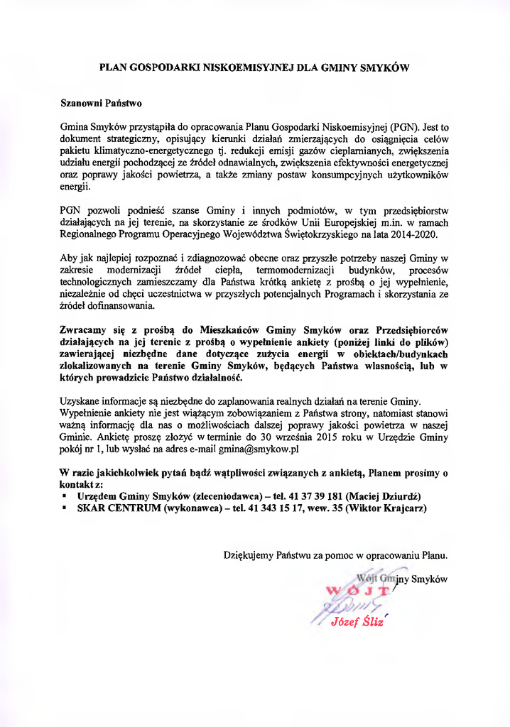 PLAN GOSPODARKI NISKOEMISYJNEJ DLA GMINY SMYKÓW Szanowni Państwo Gmina Smyków przystąpiła do opracowania Planu Gospodarki Niskoemisyjnej (PGN). Jest to dokument strategiczny, opisujący kierunki działań zmierzających do osiągnięcia celów pakietu klimatyczno-energetycznego tj. redukcji emisji gazów cieplarnianych, zwiększenia udziału energii pochodzącej ze źródeł odnawialnych, zwiększenia efektywności energetycznej oraz poprawy jakości powietrza, a także zmiany postaw konsumpcyjnych użytkowników energii. PGN pozwoli podnieść szanse Gminy i innych podmiotów, w tym przedsiębiorstw działających na jej terenie, na skorzystanie ze środków Unii Europejskiej m.in. w ramach Regionalnego Programu Operacyjnego Województwa Świętokrzyskiego na lata 2014-2020. Aby jak najlepiej rozpoznać i zdiagnozować obecne oraz przyszłe potrzeby naszej Gminy w zakresie modernizacji źródeł ciepła, termomodemizacji budynków, procesów technologicznych zamieszczamy dla Państwa krótką ankietę z prośbą o jej wypełnienie, niezależnie od chęci uczestnictwa w przyszłych potencjalnych Programach i skorzystania ze Źródeł dofinansowania. Zwracamy się z prośbą do Mieszkańców Gminy Smyków oraz Przedsiębiorców działających na jej terenie z prośbą o wypełnienie ankiety (poniżej linki do plików) zawierającej niezbędne dane dotyczące zużycia energii w obiektachibudynkach zlokalizowanych na terenie Gminy Smyków, będących Państwa własnością, lub w których prowadzicie Państwo działalność. Uzyskane informacje są niezbędne do zaplanowania realnych działań na terenie Gminy. Wypełnienie ankiety nie jest wiążącym zobowiązaniem z Państwa strony, natomiast stanowi ważną informację dla nas o możliwościach dalszej poprawy jakości powietrza w naszej Gminie. Ankietę proszę złożyć w terminie do 30 września 2015 roku w Urzędzie Gminy pokój nr 1, lub wysłać na adres e-mail [email protected] W razie jakichkolwiek pytań bądź wątpliwości związanych z ankietą, Planem prosimy o kontakt z: • Urzędem Gminy Smyków (zleceniodawca) — tel. 41 37 39 181 (Maciej Dziurdź) • SKAR CENTRUM (wykonawca) — tel. 41 343 15 17, wew. 35 (Wiktor Krajcarz) Dziękujemy Państwu za pomoc w opracowaniu Planu. A ,ez iny Smyków ś" J •,'"/7 Józef śliz' Załączniki: Ankieta dla budynków mieszkalnych w wersji on-lina (http://gmina-smykow-m.srvys.com) - ankieta dostępna przez przeglądarkę w formacie edytowalnym — ankietę należy wypełnić, zapisać na komputerze i odesłać drogą elektroniczną ([email protected]) wpisując w tytule Ankieta PGN w formacie pdf — ankietę należy wydrukować, wypisać ręcznie, a następnie zeskanować bądź sfotografować i wysłać e-mailem lub wydrukowaną wysłać tradycyjną pocztą ([email protected] lub adres: Urząd Gminy Smyków, Smyków 91, 26-212 Smyków z dopiskiem Ankieta PGN) Ankieta dla przedsiębiorstw w wersji on-line (http://gmina-smykow.srvys.com) - ankieta dostępna przez przeglądarkę w formacie edytowalnym — ankietę należy wypełnić, zapisać na komputerze i odesłać drogą elektroniczną ([email protected]) wpisując w tytule Ankieta PGN w formacie pdf — ankietę należy wydrukować, wypisać ręcznie, a następnie zeskanować bądź sfotografować i wysłać e-mailem lub wydrukowaną wysłać tradycyjną pocztą ([email protected] lub adres: Urząd Gminy Smyków, Smyków 91, 26-212 Smyków z dopiskiem Ankieta PGN)