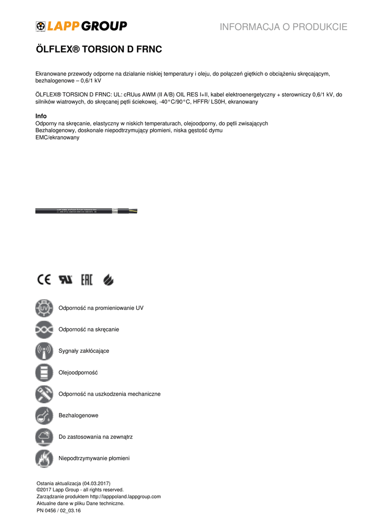 INFORMACJA O PRODUKCIE ÖLFLEX® TORSION D FRNC Ekranowane przewody odporne na działanie niskiej temperatury i oleju, do połączeń giętkich o obciążeniu skręcającym, bezhalogenowe – 0,6/1 kV ÖLFLEX® TORSION D FRNC: UL: cRUus AWM (II A/B) OIL RES I+II, kabel elektroenergetyczny + sterowniczy 0,6/1 kV, do silników wiatrowych, do skręcanej pętli ściekowej, -40°C/90°C, HFFR/ LS0H, ekranowany Info Odporny na skręcanie, elastyczny w niskich temperaturach, olejoodporny, do pętli zwisających Bezhalogenowy, doskonale niepodtrzymujący płomieni, niska gęstość dymu EMC/ekranowany Odporność na promieniowanie UV Odporność na skręcanie Sygnały zakłócające Olejoodporność Odporność na uszkodzenia mechaniczne Bezhalogenowe Do zastosowania na zewnątrz Niepodtrzymywanie płomieni Ostania aktualizacja (04.03.2017) ©2017 Lapp Group - all rights reserved. Zarządzanie produktem http://lapppoland.lappgroup.com Aktualne dane w pliku Dane techniczne. PN 0456 / 02_03.16 INFORMACJA O PRODUKCIE ÖLFLEX® TORSION D FRNC Odporny na działanie niskich temperatur Korzyści Specjalna konstrukcja skutecznie kompensuje ciągłe ruchy skrętne pętli kablowej zwisającej wewnątrz elektrowni wiatrowej między gondolą a wieżą Duża elastyczność i właściwości w zakresie demontażu i odizolowywania umożliwiają oszczędność miejsca podczas montażu oraz szybką obróbkę przewodu Odporny na działanie wody morskiej, aplikacje morskie i lądowe FRNC = Flame Retardant Non Corrosive (samogasnący, niepowodujący korozji) - ograniczenie rozprzestrzeniania się ognia oraz toksyczności i gęstości dymu w przypadku pożaru - minimalizacja szkód w budynkach i zakładach produkcyjnych - bezpieczeństwo pracowników, stosowany w miejscach o dużym zagęszczeniu ludzi Wersja ekranowana D z owijką z miedzi chroniącą przed zakłócającymi polami elektromagnetycznymi Zakres zastosowania Do zastosowania w aplikacjach ruchomych i nieruchomych oraz aplikacjach wymagających ruchów skrętnych w budowie maszyn oraz budowie elektrowni wiatrowych Specjalnie dla montażu w pętli kablowej zwisającej między obrotową gondolą, a wieżą wiatraka w celu połączenia generatora z jednostkami kontrolnymi Cechy produktu Odporny na skręcenia do ±150°/m Dobra odporność na warunki atmosferyczne, ścieranie, temperaturę i promieniowanie UV Odporny na działanie wielu olejów Bezhalogenowy oraz wysoce samogasnący Indywidualne projekty są możliwe do zrealizowania pod warunkiem osiągnięcia wymaganej minimalnej ilości zamówienia Normy i aprobaty Zastosowano europejską, metryczną budowę żył wielodrutowych zgodnie ze skalą IEC dla żył o przekroju nominalnym w mm 2 zgodnie z IEC 60228/VDE 0295, żyła wielodrutowa klasy 6 (cynowana). W celu przejścia na rozmiary AWG, nieparzyste rozmiary nominalne AWG muszą być wyłączone z rozważań. Kolejny najniższy nominalny rozmiar AWG (określony w mm²) musi być porównany z wartościami nominalnymi w mm² wg IEC 60228 - patrz załącznik T16. Zapewni to, że obciążalność nominalna zdefiniowana dla rozmiarów AWG nie przekroczy obciążalności nominalnej określonej dla przekrojów wg IEC. Świadectwo typu kabla: UL AWM styl 21288 według UL zgodnie z normą UL 758 Właściwości przeciwpożarowe: - Bezhalogenowy (IEC 60754-1) - Niewydzielający żrących gazów (IEC 60754-2) - Niska gęstość dymu (IEC 61034-2) - Niepodrzymujący płomieni (IEC 60332-1-2) - Nierozprzestrzeniający płomieni (IEC 60332-3-24 i IEC 60332-3-25) Olejoodporny według EN 60811-404 oraz UL OIL RES I i UL OIL RES II Odporność na działanie promieniowania UV zgodnie z ISO 4892-2 oraz ozonu zgodnie z EN 50396 Budowa produktu Przewód z cienkich drucików z czystej miedzi Izolacja żyły: związek poliolefinowy Układ żyły zoptymalizowany pod kątem pracy przy dużym skręcaniu, żyły skręcone warstwowo Opcjonalne ekranowanie (D) ze spiralnej owijki z cynowanych drutów miedzianych Płaszcz zewnętrzny z bezhalogenowej mieszanki specjalnej; kolor czarny (RAL 9005) Ostania aktualizacja (04.03.2017) ©2017 Lapp Group - all rights reserved. Zarządzanie produktem http://lapppoland.lappgroup.com Aktualne dane w pliku Dane techniczne. PN 0456 / 02_03.16 INFORMACJA O PRODUKCIE ÖLFLEX® TORSION D FRNC Dane techniczne Klasyfikacja: ETIM 5.0 Class-ID: EC000104 Opis klasy ETIM 5.0: Przewód sterowniczy Oznaczenie żył: Przewody sterownicze i przyłączeniowe: Kod kolorów według VDE 0293-308, patrz załącznik T9 Powyżej 6 żył: kolor czarny z białymi numerami Przewody sygnałowe, parowane: DIN 47100 Budowa żyły: Z cienkich drucików według VDE 0295, klasa 6/IEC 60228, klasa 6 Ruch skręcający w turbinie wiatrowej (WTG): TW-0 i TW-2, patrz Załącznik T0 Minimalny promień gięcia: Połączenia ruchome: 10 x średnica zewnętrzna Połączenia nieruchome: 6 x średnica zewnętrzna Napięcie nominalne: Zgodnie z IEC/VDE: U 0 /U 0,6/1 kV AC Napięcie robocze zgodnie z UL: 1000 V Napięcie próbne: Żyła/żyła: 4000 V Żyła/ekran: 2000 V Żyła ochronna: G = z żyłą ochronną żółto - zieloną X = bez żyły ochronnej Zakres temperatury: Połączenia ruchome: od -40°C do +90°C (UL +80°C) Połączenia nieruchome: od -40°C do +90°C (UL +80°C) Wskazówka Wszystkie podane wartości dotyczące produktów są wartościami nominalnymi (o ile nie wskazano inaczej). Inne wartości, takie jak np. tolerancje mogą być przedstawione na zamówienie (jeżeli są dostępne i przeznaczone do publikacji). Standardowe odcinki proszę sprawdzić na: www.lapppolska.pl Rodzaj opakowania: bęben Inne wykonania dostępne na zamówienie Fotografie nie mogą być używane do wymiarowania oraz nie stanowią szczegółowego odwzorowania przedstawionych produktów. * Podane ceny to ceny netto bez podatku VAT i dodatkowych opłat. Sprzedaż klientom biznesowym. Ostania aktualizacja (04.03.2017) ©2017 Lapp Group - all rights reserved. Zarządzanie produktem http://lappp
