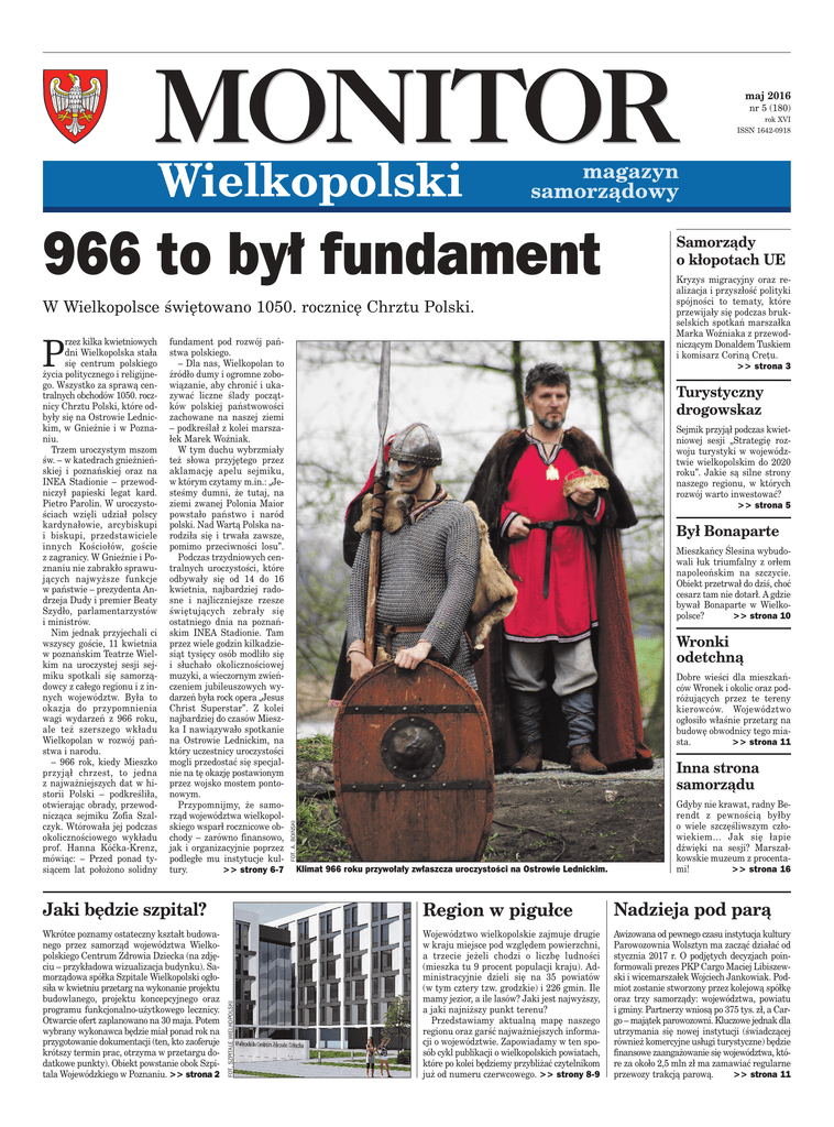 maj 2016 nr 5 (180) rok XVI ISSN 1642-0918 966 to był fundament W Wielkopolsce świętowano 1050. rocznicę Chrztu Polski. fundament pod rozwój państwa polskiego. – Dla nas, Wielkopolan to źródło dumy i ogromne zobowiązanie, aby chronić i ukazywać liczne ślady początków polskiej państwowości zachowane na naszej ziemi – podkreślał z kolei marszałek Marek Woźniak. W tym duchu wybrzmiały też słowa przyjętego przez aklamację apelu sejmiku, w którym czytamy m.in.: „Jesteśmy dumni, że tutaj, na ziemi zwanej Polonia Maior powstało państwo i naród polski. Nad Wartą Polska narodziła się i trwała zawsze, pomimo przeciwności losu”. Podczas trzydniowych centralnych uroczystości, które odbywały się od 14 do 16 kwietnia, najbardziej radosne i najliczniejsze rzesze świętujących zebrały się ostatniego dnia na poznańskim INEA Stadionie. Tam przez wiele godzin kilkadziesiąt tysięcy osób modliło się i słuchało okolicznościowej muzyki, a wieczornym zwieńczeniem jubileuszowych wydarzeń była rock opera „Jesus Christ Superstar”. Z kolei najbardziej do czasów Mieszka I nawiązywało spotkanie na Ostrowie Lednickim, na który uczestnicy uroczystości mogli przedostać się specjalnie na tę okazję postawionym przez wojsko mostem pontonowym. Przypomnijmy, że samorząd województwa wielkopolskiego wsparł rocznicowe obchody – zarówno finansowo, jak i organizacyjnie poprzez podległe mu instytucje kultury. >> strony 6-7 Kryzys migracyjny oraz realizacja i przyszłość polityki spójności to tematy, które przewijały się podczas brukselskich spotkań marszałka Marka Woźniaka z przewodniczącym Donaldem Tuskiem i komisarz Coriną Creţu. >> strona 3 Turystyczny drogowskaz Sejmik przyjął podczas kwietniowej sesji „Strategię rozwoju turystyki w województwie wielkopolskim do 2020 roku”. Jakie są silne strony naszego regionu, w których rozwój warto inwestować? >> strona 5 Był Bonaparte Mieszkańcy Ślesina wybudowali łuk triumfalny z orłem napoleońskim na szczycie. Obiekt przetrwał do dziś, choć cesarz tam nie dotarł. A gdzie bywał Bonaparte w Wielkopolsce? >> strona 10 Wronki odetchną Dobre wieści dla mieszkańców Wronek i okolic oraz podróżujących przez te tereny kierowców. Województwo ogłosiło właśnie przetarg na budowę obwodnicy tego miasta. >> strona 11 Inna strona samorządu FOT. A. BOIŃSKI P rzez kilka kwietniowych dni Wielkopolska stała się centrum polskiego życia politycznego i religijnego. Wszystko za sprawą centralnych obchodów 1050. rocznicy Chrztu Polski, które odbyły się na Ostrowie Lednickim, w Gnieźnie i w Poznaniu. Trzem uroczystym mszom św. – w katedrach gnieźnieńskiej i poznańskiej oraz na INEA Stadionie – przewodniczył papieski legat kard. Pietro Parolin. W uroczystościach wzięli udział polscy kardynałowie, arcybiskupi i biskupi, przedstawiciele innych Kościołów, goście z zagranicy. W Gnieźnie i Poznaniu nie zabrakło sprawujących najwyższe funkcje w państwie – prezydenta Andrzeja Dudy i premier Beaty Szydło, parlamentarzystów i ministrów. Nim jednak przyjechali ci wszyscy goście, 11 kwietnia w poznańskim Teatrze Wielkim na uroczystej sesji sejmiku spotkali się samorządowcy z całego regionu i z innych województw. Była to okazja do przypomnienia wagi wydarzeń z 966 roku, ale też szerszego wkładu Wielkopolan w rozwój państwa i narodu. – 966 rok, kiedy Mieszko przyjął chrzest, to jedna z najważniejszych dat w historii Polski – podkreśliła, otwierając obrady, przewodnicząca sejmiku Zofia Szalczyk. Wtórowała jej podczas okolicznościowego wykładu prof. Hanna Kóčka-Krenz, mówiąc: – Przed ponad tysiącem lat położono solidny Samorządy o kłopotach UE Klimat 966 roku przywołały zwłaszcza uroczystości na Ostrowie Lednickim. Gdyby nie krawat, radny Berendt z pewnością byłby o wiele szczęśliwszym człowiekiem… Jak się łapie dźwięki na sesji? Marszałkowskie muzeum z procentami! >> strona 16 Region w pigułce Nadzieja pod parą Wkrótce poznamy ostateczny kształt budowanego przez samorząd województwa Wielkopolskiego Centrum Zdrowia Dziecka (na zdjęciu – przykładowa wizualizacja budynku). Samorządowa spółka Szpitale Wielkopolski ogłosiła w kwietniu przetarg na wykonanie projektu budowlanego, projektu koncepcyjnego oraz programu funkcjonalno-użytkowego lecznicy. Otwarcie ofert zaplanowano na 30 maja. Potem wybrany wykonawca będzie miał ponad rok na przygotowanie dokumentacji (ten, kto zaoferuje krótszy termin prac, otrzyma w przetargu dodatkowe punkty). Obiekt powstanie obok Szpitala Wojewódzkiego w Poznaniu. >> strona 2 Województwo wielkopolskie zajmuje drugie w kraju miejsce pod względem powierzchni, a trzecie jeżeli chodzi o liczbę ludności (mieszka tu 9 procent populacji kraju). Administracyjnie dzieli się na 35 powiatów (w tym cztery tzw. grodzkie) i 226 gmin. Ile mamy jezior, a ile lasów? Jaki jest najwyższy, a jaki najniższy punkt terenu? Przedstawiamy aktualną mapę naszego regionu oraz garść najważniejszych informacji o województwie. Zapowiadamy w ten sposób cykl publikacji o wielkopolskich powiatach, które po kolei będziemy przybliżać czytelnikom już od numeru czerwcowego. >> strony 8-9 Awizowana od pewnego czasu instytucja kultury Parowozownia Wolsztyn ma zacząć działać od stycznia 2017 r. O podjętych decyzjach poinformowali prezes PKP Cargo Maciej Libiszewski i wicemarszałek Wojciech Jankowiak. Podmiot zostanie stworzony przez kolejową spółkę oraz trzy samorządy: województwa, powiatu i gminy. Partnerzy wniosą po 375 tys. zł, a Cargo – majątek parowozowni. Kluczowe jednak dla utrzymania się nowej instytucji (świadczącej również komercyjne usługi turystyczne) będzie finansowe zaangażowanie się województwa, które za około 2,5 mln zł ma zamawiać regularne przewozy trakcją parową. >> strona 11 FOT. SZPITALE WIELKOPOLSKI Jaki będzie szpital? 2