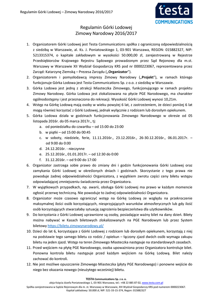 Regulamin Górki Lodowej – Zimowy Narodowy 2016/2017 Regulamin Górki Lodowej Zimowy Narodowy 2016/2017 1. Organizatorem Górki Lodowej jest Testa Communications spółka z ograniczoną odpowiedzialnością z siedzibą w Warszawie, al. Ks. J. Poniatowskiego 1, 03-901 Warszawa, REGON: 015882327, NIP: 5213315374, o kapitale zakładowym w wysokości 50.000,00 zł, zarejestrowaną w Rejestrze Przedsiębiorców Krajowego Rejestru Sądowego prowadzonym przez Sąd Rejonowy dla m.st. Warszawy w Warszawie XII Wydział Gospodarczy KRS pod nr 0000223067, reprezentowana przez Zarząd: Katarzynę Ziemską – Prezesa Zarządu („Organizator”). 2. Organizatorem i pomysłodawcą imprezy Zimowy Narodowy („Projekt”), w ramach którego funkcjonuje Górka Lodowa jest Testa Communications Sp. z o.o. z siedzibą w Warszawie. 3. Górka Lodowa jest jedną z atrakcji Miasteczka Zimowego, funkcjonującego w ramach projektu Zimowy Narodowy. Górka Lodowa jest zlokalizowana na płycie PGE Narodowego, ma charakter ogólnodostępny i jest przeznaczona do rekreacji. Wysokość Górki Lodowej wynosi 10,21m. 4. Wstęp na Górkę Lodową mają osoby w wieku powyżej 6 lat, z zastrzeżeniem, że dzieci poniżej 6 lat mogą również korzystać z Górki Lodowej, jednak wyłącznie z rodzicem lub dorosłym opiekunem. 5. Górka Lodowa działa w godzinach funkcjonowania Zimowego Narodowego w okresie od 05 listopada 2016r. do 05 marca 2017r., tj: a. od poniedziałku do czwartku – od 15:00 do 23:00 b. w piątki – od 15:00 do 00:45 c. w soboty, niedziele, ferie, 11.11.2016r., 23.12.2016r., 26-30.12.2016r., 06.01.2017r. – od 9:00 do 0:00 d. 24.12.2016r. - nieczynne e. 25.12.2016r., 01.01.2017r. – od 12:30 do 0:00 f. 31.12.2016r. – od 9:00 do 17:00 6. Organizator zastrzega sobie prawo do zmiany dni i godzin funkcjonowania Górki Lodowej oraz zamykania Górki Lodowej w określonych dniach i godzinach. Skorzystanie z tego prawa nie powoduje żadnej odpowiedzialności Organizatora, z wyjątkiem zwrotu części ceny biletu wstępu odpowiadającej zmniejszeniu świadczenia przez Organizatora. 7. W wyjątkowych przypadkach, np. awarii, obsługa Górki Lodowej ma prawo w każdym momencie ogłosić przerwę techniczną. Nie powoduje to żadnej odpowiedzialności Organizatora. 8. Organizator może czasowo ograniczyć wstęp na Górkę Lodową ze względu na przekroczenie maksymalnej ilości osób korzystających, niesprzyjających warunków atmosferycznych lub gdy ilość osób korzystających stwarzałaby sytuację zagrożenia bezpieczeństwa dla użytkowników. 9. Do korzystania z Górki Lodowej uprawnione są osoby, posiadające ważny bilet na dany dzień. Bilety można nabywać w Kasach biletowych zlokalizowanych na PGE Narodowym lub przez System biletowy https://bilety.zimowynarodowy.pl/ 10. Dzieci do lat 6, korzystające z Górki Lodowej z rodzicem lub dorosłym opiekunem, korzystają z niej na podstawie tego samego biletu co rodzic / opiekun – łączony zjazd dwóch osób wymaga zakupu biletu na jeden zjazd. Wstęp na teren Zimowego Miasteczka następuje na standardowych zasadach. 11. Przed wejściem na płytę PGE Narodowego, osoba upoważniona przez Organizatora kontroluje bilet. Ponowna kontrola biletu następuje przed każdym wejściem na Górkę Lodową. Bilet należy zachować do kontroli. 12. Nie jest możliwe opuszczenie Zimowego Miasteczka (płyty PGE Narodowego) i ponowne wejście do niego bez okazania nowego (nieużytego wcześniej) biletu. TESTA Communications Sp. z o. o. aleja Księcia Józefa Poniatowskiego 1, 03-901 Warszawa, tel.: +48 22 885 87 02, www.testa.com.pl Spółka zarejestrowana w Sądzie Rejonowym dla m. st. Warszawy w Warszawie, XIII Wydział Gospodarczy KRS pod numerem 0000223067. Kapitał zakładowy: 50.000 zł, NIP: 521-33-15-374, Regon: 015882327 Regulamin Górki Lodowej – Zimowy Narodowy 2016/2017 13. W przypadku organizowania odrębnych imprez sportowo-rekreacyjnych lub zajęć dla grup zorganizowanych, Organizator ma prawo do zmiany godzin funkcjonowania Górki Lodowej. Nie powoduje to żadnej odpowiedzialności Organizatora. 14. Zabronione jest wszelkie postępowanie zagrażające bezpieczeństwu własnemu lub innych użytkowników Górki Lodowej oraz stanowi sanitarno-higienicznemu Górki Lodowej, w szczególności: a. używanie otwartego ognia, b. żucie gumy, c. zaśmiecanie i zanieczyszczanie Górki Lodowej, d. wnoszenia i spożywania napojów i jedzenia na terenie Górki Lodowej e. wnoszenia szklanych pojemników, niebezpiecznych przedmiotów oraz środków chemicznych, f. wchodzenie na teren Górki Lodowej w łyżwach, g. hałasowanie i przeszkadzanie innym użytkownikom Górki Lodowej, h. pozostawianie jakichkolwiek przedmiotów i sprzętu na terenie Górki Lodowej, i. chodzenie po konstrukcji Górki Lodowej oraz przebywanie w strefie zjazdów. 15. Organizator ma prawo odmówić wstępu na Górkę Lodową: osobom pod wpływem alkoholu, osobom niepodporządkowującym się poleceniom osób upoważnionych przez Organizatora do obsługi Górki Lodowej, osobom zakłócającym właściwe funkcjonowanie Górki Lodowej bądź utrudniającym korzystanie z Górki Lodowej innym użytkownikom oraz osobom łamiącym lub nieprzestrzegającym regulaminu. 16. Każdy korzystający z Górki Lodowej zobligowany jest do wykonywania poleceń osób upoważnionych przez Organizatora oraz do stosowania się do podawanych komunikatów. Osoba upoważniona przez Organizatora ma prawo wyprosić z terenu Górki Lodowej osoby niestosujące się do poleceń. 17. Na Górce Lodowej obowiązuje całkowity zakaz wnoszenia i spożywania środków odurzających i napojów alkoholowych, przebywania osób w stanie nietrzeźwości oraz palenia papierosów. 18. Obowiązuje całkowity zakaz wchodzenia na Górkę Lodową oraz poruszania się po Miasteczku Zimowym z naczyniami szklanymi. 19. Bezwzględnie zakazane jest niszczenie sprzętu, urządzeń, infrastruktury i wyposażenia Górki Lodowej. 20. Obowiąz