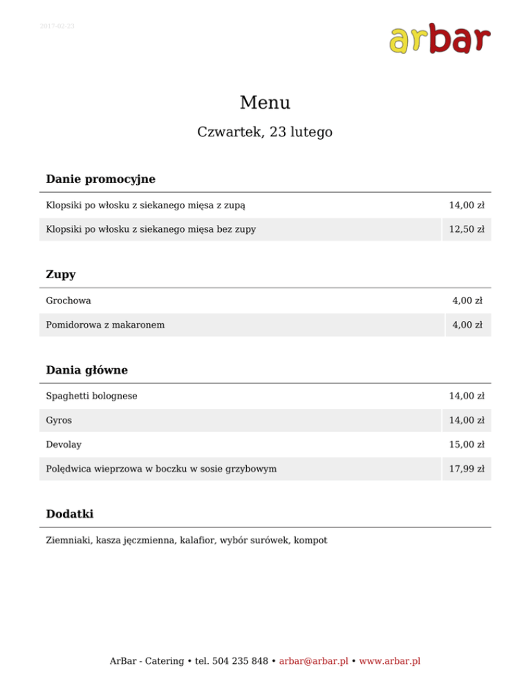 ArBar - Menu Restauracji dn. 2017-02-23 - ArBar