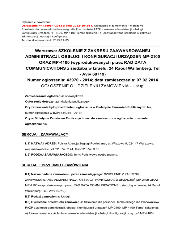 Ogłoszenie powiązane: Ogłoszenie nr 434054-2013 z dnia 2013-10-24 r. Ogłoszenie o zamówieniu - Warszawa Szkolenie dla personelu technicznego dla Pracowników PAŻP z zakresu administracji, obsługi i konfiguracji urządzeń MP-2100, MP-4100 Temat szkolenia: a) Zaawansowane szkolenie w zakresie administracji, obsługi i konfiguracji... Termin składania ofert: 2013-11-05 Warszawa: SZKOLENIE Z ZAKRESU ZAAWANSOWANEJ ADMINISTRACJI, OBSŁUGI I KONFIGURACJI URZĄDZEŃ MP-2100 ORAZ MP-4100 (wyprodukowanych przez RAD DATA COMMUNICATIONS z siedzibą w Izraelu, 24 Raoul Wallenberg, Tel - Aviv 69719) Numer ogłoszenia: 43970 - 2014; data zamieszczenia: 07.02.2014 OGŁOSZENIE O UDZIELENIU ZAMÓWIENIA - Usługi Zamieszczanie ogłoszenia: obowiązkowe. Ogłoszenie dotyczy: zamówienia publicznego. Czy zamówienie było przedmiotem ogłoszenia w Biuletynie Zamówień Publicznych: tak, numer ogłoszenia w BZP: 434054 - 2013r. Czy w Biuletynie Zamówień Publicznych zostało zamieszczone ogłoszenie o zmianie ogłoszenia: nie. SEKCJA I: ZAMAWIAJĄCY I. 1) NAZWA I ADRES: Polska Agencja Żeglugi Powietrznej, ul. Wieżowa 8, 02-147 Warszawa, woj. mazowieckie, tel. 22 574 62 44, faks 22 574 63 59. I. 2) RODZAJ ZAMAWIAJĄCEGO: Inny: Państwowa osoba prawna. SEKCJA II: PRZEDMIOT ZAMÓWIENIA II.1) Nazwa nadana zamówieniu przez zamawiającego: SZKOLENIE Z ZAKRESU ZAAWANSOWANEJ ADMINISTRACJI, OBSŁUGI I KONFIGURACJI URZĄDZEŃ MP-2100 ORAZ MP-4100 (wyprodukowanych przez RAD DATA COMMUNICATIONS z siedzibą w Izraelu, 24 Raoul Wallenberg, Tel - Aviv 69719). II.2) Rodzaj zamówienia: Usługi. II.3) Określenie przedmiotu zamówienia: Szkolenie dla personelu technicznego dla Pracowników PAŻP z zakresu administracji, obsługi i konfiguracji urządzeń MP-2100, MP-4100 Temat szkolenia: a) Zaawansowane szkolenie w zakresie administracji, obsługi i konfiguracji urządzeń MP-4100 i MP-2100 - miejsce szkolenia:Polska lub inny kraj strefy Schengen wskazany przez Wykonawcę w ofercie; b) Szkolenie w zakresie obsługi i konfiguracji Multipleksów MP-2100 firmy RAD - miejsce szkolenia: Polska lub inny kraj strefy Schengen wskzany przez Wykonawcę w ofercie. II.4) Wspólny Słownik Zamówień (CPV): 79.63.20.00-3. SEKCJA III: PROCEDURA III.1) TRYB UDZIELENIA ZAMÓWIENIA: Przetarg nieograniczony III.2) INFORMACJE ADMINISTRACYJNE Zamówienie dotyczy projektu/programu finansowanego ze środków Unii Europejskiej: nie SEKCJA IV: UDZIELENIE ZAMÓWIENIA IV.1) DATA UDZIELENIA ZAMÓWIENIA: 29.01.2014. IV.2) LICZBA OTRZYMANYCH OFERT: 1. IV.3) LICZBA ODRZUCONYCH OFERT: . IV.4) NAZWA I ADRES WYKONAWCY, KTÓREMU UDZIELONO ZAMÓWIENIA: POLIXEL Sp. z o.o., Zakopiańska 6, 03-934 Warszawa, kraj/woj. mazowieckie. IV.5) Szacunkowa wartość zamówienia (bez VAT): 202291,16 PLN. IV.6) INFORMACJA O CENIE WYBRANEJ OFERTY ORAZ O OFERTACH Z NAJNIŻSZĄ I NAJWYŻSZĄ CENĄ Cena wybranej oferty: 270080,00 Oferta z najniższą ceną: 270080,00 / Oferta z najwyższą ceną: 270080,00 Waluta: PLN.