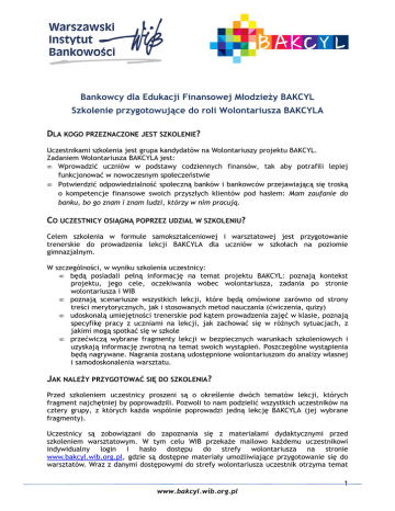 Bankowcy dla Edukacji Finansowej Młodzieży BAKCYL Szkolenie przygotowujące do roli Wolontariusza BAKCYLA DLA KOGO PRZEZNACZONE JEST SZKOLENIE? Uczestnikami szkolenia jest grupa kandydatów na Wolontariuszy projektu BAKCYL. Zadaniem Wolontariusza BAKCYLA jest: • Wprowadzić uczniów w podstawy codziennych finansów, tak aby potrafili lepiej funkcjonować w nowoczesnym społeczeństwie • Potwierdzić odpowiedzialność społeczną banków i bankowców przejawiającą się troską o kompetencje finansowe swoich przyszłych klientów pod hasłem: Mam zaufanie do banku, bo go znam i znam ludzi, którzy w nim pracują. CO UCZESTNICY OSIĄGNĄ POPRZEZ UDZIAŁ W SZKOLENIU? Celem szkolenia w formule samokształceniowej i warsztatowej jest przygotowanie trenerskie do prowadzenia lekcji BAKCYLA dla uczniów w szkołach na poziomie gimnazjalnym. W szczególności, w wyniku szkolenia uczestnicy: • będą posiadali pełną informację na temat projektu BAKCYL: poznają kontekst projektu, jego cele, oczekiwania wobec wolontariusza, zadania po stronie wolontariusza i WIB • poznają scenariusze wszystkich lekcji, które będą omówione zarówno od strony treści merytorycznych, jak i stosowanych metod nauczania (ćwiczenia, quizy) • udoskonalą umiejętności trenerskie pod kątem prowadzenia zajęć w klasie, poznają specyfikę pracy z uczniami na lekcji, jak zachować się w różnych sytuacjach, z jakimi mogą spotkać się w szkole • przećwiczą wybrane fragmenty lekcji w bezpiecznych warunkach szkoleniowych i uzyskają informację zwrotną na temat swoich wystąpień. Poszczególne wystąpienia będą nagrywane. Nagrania zostaną udostępnione wolontariuszom do analizy własnej i samodoskonalenia warsztatu. JAK NALEŻY PRZYGOTOWAĆ SIĘ DO SZKOLENIA? Przed szkoleniem uczestnicy proszeni są o określenie dwóch tematów lekcji, których fragment najchętniej by poprowadzili. Pozwoli to nam podzielić wszystkich uczestników na cztery grupy, z których każda wspólnie poprowadzi jedną lekcję BAKCYLA (jej wybrane fragmenty). Uczestnicy są zobowiązani do zapoznania się z materiałami dydaktycznymi przed szkoleniem warsztatowym. W tym celu WIB przekaże mailowo każdemu uczestnikowi indywidualny login i hasło dostępu do strefy wolontariusza na stronie www.bakcyl.wib.org.pl, gdzie są dostępne materiały umożliwiające przygotowanie się do warsztatów. Wraz z danymi dostępowymi do strefy wolontariusza uczestnik otrzyma temat 1 www.bakcyl.wib.org.pl lekcji i listę wybranych fragmentów do poprowadzenia przez wolontariuszy przypisanych do tego tematu. W strefie wolontariusza prosimy o zapoznanie się z: • • • Programami lekcji (rekomendujemy zapoznanie się z programami wszystkich lekcji, a szczególnie tej, której fragment będzie uczestnik prowadził; warto ją także przećwiczyć) - dostępne w zakładce LEKCJE Vademecum wolontariusza, zawierającym praktyczne informacje, jak prowadzić lekcje w szkole - dostępne w zakładce SZKOLENIE WOLONTARIUSZY Nagraniem „Warsztat pracy trenera”, zawierającym wskazówki służące doskonaleniu warsztatu trenerskiego - dostępne w zakładce SZKOLENIE WOLONTARIUSZY UWAGA! Zapoznanie się z materiałami przed warsztatami jest niezbędne, aby móc efektywnie uczestniczyć w zajęciach. JAK BĘDĄ PRZEBIEGAŁY ZAJĘCIA? Udział w całości szkolenia jest obowiązkowy. Prosimy o punktualne przybycie na zajęcia. Zaczynamy o godz. 9.00 kluczowymi informacjami o projekcie. Przewidziana jest także sesja pytań i odpowiedzi dotyczących projektu, zasad współpracy, etc. Następnie uczestnicy zostaną podzielenie na grupy wg przypisanych tematów lekcji. W ramach danej grupy uzgadniają miedzy sobą podział fragmentów lekcji do poprowadzenia w trakcie warsztatów. Każdy uczestnik będzie prowadził samodzielnie tylko jeden, około 510 minutowy, fragment lekcji. Wystąpienie powinno przewidywać interakcję z grupą i być zgodne z dobrymi praktykami prowadzenia zajęć (stąd konieczność wcześniejszego zapoznania się z materiałami dydaktycznymi ze strefy wolontariusza). Po każdej lekcji nastąpi omówienie pod kątem sposobu prowadzenia zajęć przez wolontariuszy. Informacja zwrotna będzie pochodziła od Głównego Dydaktyka WIB-CKP, Dyrektora Projektu BAKCYL, a także nawzajem od pozostałych uczestników szkolenia. Omówienie poszczególnych wystąpień będzie służyło doskonaleniu warsztatu trenerskiego wolontariuszy oraz sposobu przekazywania treści zawartych w lekcjach, dzięki nauce na własnych i cudzych atutach i błędach. Na zakończenie szkolenia zostanie przedstawiony plan dalszych działań w projekcie. Każdy uczestnik otrzyma zaświadczenie uczestnictwa w szkoleniu. Dodatkowy materiał do pracy własnej - poszczególne wystąpienia będą nagrywane. Nagrania nie będą omawiane na szkoleniu, ale zostaną udostępnione wolontariuszom do analizy własnej i samodoskonalenia warsztatu. W materiałach na szkoleniu uczestnicy otrzymają m.in. wydrukowane wszystkie konspekty lekcji (dostępne w wersji elektronicznej w strefie wolontariusza na stronie www.bakcyl.wib.org.pl). KIEDY I GDZIE ODBĘDZIE SIĘ SZKOLENIE? Terminy szkoleń warsztatowych: Warszawa Poznań Gdańsk Warszawa lub Łódź 25 lutego 2016 (czwartek), godz. 9:00-17:30 10 marca 2016 (czwartek), godz. 9:00-17:30 31 marca 2016 (czwartek), godz. 9:00-17:30 21 kwietnia 2016 (czwartek), godz. 9:00-17:30 WIB zastrzega możliwość zmiany terminów, o czym uczestnicy zostaną poinformowani z wyprzedzeniem. 2 www.bakcyl.wib.org.pl Zapewniamy wyżywienie w trakcie szkolenia. Przewidziane są kilkunastominutowe przerwy kawowe oraz dłuższa przerwa obiadowa. Dla osób dojeżdżających spoza miasta, w którym prowadzone jest szkolenie (ale w obrębie danego województwa) WIB zwróci koszty dojazdu na podstawie przedłożonych przez uczestników oświadczeń (zgodnie ze wzorem dostępnym w strefie wolontariusza na stronie www.bakcyl.wib.org.pl). JAKI JEST