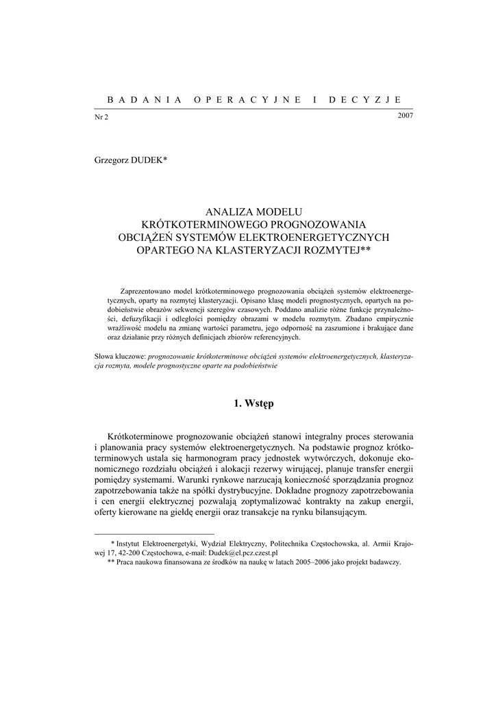 B A D A N I A O P E R A C Y J N E I D E C Y Z J E 2007 Nr 2 Grzegorz DUDEK* ANALIZA MODELU KRÓTKOTERMINOWEGO PROGNOZOWANIA OBCIĄŻEŃ SYSTEMÓW ELEKTROENERGETYCZNYCH OPARTEGO NA KLASTERYZACJI ROZMYTEJ** Zaprezentowano model krótkoterminowego prognozowania obciążeń systemów elektroenergetycznych, oparty na rozmytej klasteryzacji. Opisano klasę modeli prognostycznych, opartych na podobieństwie obrazów sekwencji szeregów czasowych. Poddano analizie różne funkcje przynależności, defuzyfikacji i odległości pomiędzy obrazami w modelu rozmytym. Zbadano empirycznie wrażliwość modelu na zmianę wartości parametru, jego odporność na zaszumione i brakujące dane oraz działanie przy różnych definicjach zbiorów referencyjnych. Słowa kluczowe: prognozowanie krótkoterminowe obciążeń systemów elektroenergetycznych, klasteryzacja rozmyta, modele prognostyczne oparte na podobieństwie 1. Wstęp Krótkoterminowe prognozowanie obciążeń stanowi integralny proces sterowania i planowania pracy systemów elektroenergetycznych. Na podstawie prognoz krótkoterminowych ustala się harmonogram pracy jednostek wytwórczych, dokonuje ekonomicznego rozdziału obciążeń i alokacji rezerwy wirującej, planuje transfer energii pomiędzy systemami. Warunki rynkowe narzucają konieczność sporządzania prognoz zapotrzebowania także na spółki dystrybucyjne. Dokładne prognozy zapotrzebowania i cen energii elektrycznej pozwalają zoptymalizować kontrakty na zakup energii, oferty kierowane na giełdę energii oraz transakcje na rynku bilansującym. * Instytut Elektroenergetyki, Wydział Elektryczny, Politechnika Częstochowska, al. Armii Krajowej 17, 42-200 Częstochowa, e-mail: [email protected] ** Praca naukowa finansowana ze środków na naukę w latach 2005–2006 jako projekt badawczy. 16 G. DUDEK Wobec istotności problemu dla funkcjonowania i bezpieczeństwa pracy systemu oraz wymiernych korzyści finansowych związanych ze zwiększaniem precyzji prognoz, w ostatnich 20–30 latach opracowano wiele modeli prognozowania obciążeń. Modele klasyczne wykorzystują metody wygładzania, regresji i analizy statystycznej [14]. Nowe modele oparte są najczęściej na metodach sztucznej inteligencji [24] – sztucznych sieciach neuronowych [10], systemach rozmytych [8, 27] i systemach ekspertowych [28] lub uczeniu maszynowym i teorii rozpoznawania obrazów, np. na drzewach regresyjnych [5], czy hierarchicznych metodach klasteryzacji [12]. Tworzy się także modele hybrydowe łączące najlepsze cechy modeli składowych – systemy neuronowo-rozmyte [18], systemy ekspertowe z logiką rozmytą [29] i łączone z sieciami neuronowymi [17]. Rozwijane są także inne oryginalne podejścia: metoda rozkładu kanonicznego wektora losowego [26], metoda funkcji punktowych [22], metoda wykorzystująca geometrię fraktalną [4]. W tym artykule analizowany jest model prognozowania krótkoterminowego oparty na rozmytej klasteryzacji. Zbadano działanie modelu przyjmując definicje funkcji przynależności i defuzyfikacji, miary odległości między obrazami sekwencji szeregów czasowych obciążeń i różne definicje zbiorów referencyjnych oraz wrażliwość modelu na zmiany wartości jego parametru, dane zaszumione i brakujące. 2. Modele prognostyczne oparte na podobieństwie Analizowana metoda, wykorzystująca klasteryzację rozmytą, jest metodą opartą na podobieństwie (similarity-based method). Można ją zaliczyć do klasy metod analogowych [3], w których wnioskuje się o przyszłości jednych obiektów na podstawie wiedzy o innych, podobnych obiektach lub, w szczególnym przypadku, na podstawie dotychczasowej historii tych samych obiektów. Ten drugi sposób, opisywany w tym artykule, jest uprawniony wówczas, gdy w szeregu występują wahania okresowe lub zbliżone do okresowych. Metoda wymaga podziału szeregu czasowego na sekwencje, obejmujące zwykle jeden okres. Elementy sekwencji przetwarza się, otrzymując jej obraz. Zakłada się, że jeśli obraz procesu xt w okresie bezpośrednio poprzedzającym prognozę wykazuje podobieństwo do obrazu xt–i z historii tego procesu, to obraz prognozy yt+j (skojarzony z obrazem xt) jest podobny do obrazu „prognozy” yt–i+j (skojarzonego z obrazem xt–i). Przez obraz rozumie się wektor o składowych będących funkcjami rzeczywistych elementów szeregu czasowego (tutaj elementami szeregu są obciążenia systemu elektroenergetycznego w kolejnych godzinach). Obrazy xt, xt–i i yt–i+j są określane na podstawie historii procesu. Pary xt i xt–i oraz yt–i+j i yt+j są zdefiniowane w ten sam sposób Analiza modelu krótkoterminowego prognozowania ... 17 i przesunięte w czasie o tę samą liczbę elementów szeregu i – zwykle jest to wielokrotność okresu wahań. Sposób definicji obrazów x i y zależy od specyfiki szeregu czasowego (składowych periodycznych, trendu) oraz okresu i horyzontu prognozy j. Funkcje przekształcające elementy szeregu w obrazy należy tak dobrać, aby zmaksymalizować jakość modelu prognostycznego i aby obrazy przenosiły jak najwięcej informacji o procesie. Ponadto funkcje przekształcające sekwencje prognoz w obrazy powinny zapewniać możliwość obliczenia rzeczywistych prognoz elementów szeregu. Dyskusja definicji tych funkcji była przedmiotem publikacji [9]. Miary podobieństwa oparte są na miarach odległości, np. na metryce Minkowskiego (w szczególności euklidesowej), Mahalanobisa – uwzględniającej wariancje i kowariancje składowych obrazów, Hamminga – dla obrazów o składowych binarnych lub jakościowych, na miarach korelacji lub na miarach podobieństwa funkcji [3]. Jedna z klas modeli prognostycznych opartych na podobieństwie korzysta ze zbioru par obrazów referencyjnych (x, y). Dla wektora obrazu wejściowego xt odnajdywane są najbardziej podobne wektory obrazów x w zbiorze referencyjnym i ze skojarzonych z nimi wektorów y konstruowany jest obraz prognozy yt+j, 