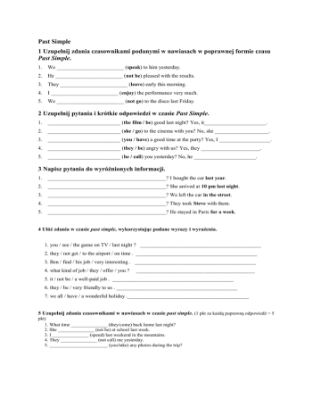 Past Simple 1 Uzupełnij zdania czasownikami podanymi w nawiasach w poprawnej formie czasu Past Simple. 1. We _________________________ (speak) to him yesterday. 2. He _________________________ (not be) pleased with the results. 3. They _________________________ (leave) early this morning. 4. I _________________________ (enjoy) the performance very much. 5. We _________________________ (not go) to the disco last Friday. 2 Uzupełnij pytania i krótkie odpowiedzi w czasie Past Simple. 1. ___________________________ (the film / be) good last night? Yes, it_______________________. 2. ___________________________ (she / go) to the cinema with you? No, she ____________________. 3. ___________________________ (you / have) a good time at the party? Yes, I ___________________. 4. ___________________________ (they / be) angry with us? Yes, they ______________________. 5. ___________________________ (he / call) you yesterday? No, he _______________________. 3 Napisz pytania do wyróżnionych informacji. 1. ____________________________________________? I bought the car last year. 2. ____________________________________________? She arrived at 10 pm last night. 3. ____________________________________________? We left the car in the street. 4. ____________________________________________? They took Steve with them. 5. ____________________________________________? He stayed in Paris for a week. 4 Ułóż zdania w czasie past simple, wykorzystując podane wyrazy i wyrażenia. 1. you / see / the game on TV / last night ? _____________________________________________ 2. they / not get / to the airport / on time . _____________________________________________ 3. Ben / find / his job / very interesting . _____________________________________________ 4. what kind of job / they / offer / you ? ____________________________________________ 5. it / not be / a well-paid job . _____________________________________________ 6. they / be / very friendly to us . _____________________________________________ 7. we all / have / a wonderful holiday ._____________________________________________ 5 Uzupełnij zdania czasownikami w nawiasach w czasie past simple. (1 pkt za każdą poprawną odpowiedź = 5 pkt) 1. What time _______________ (they/come) back home last night? 2. She _______________ (not be) at school last week. 3. I _______________ (spend) last weekend in the mountains. 4. They _______________ (not call) me yesterday. 5. ________________________ (you/take) any photos during the trip?