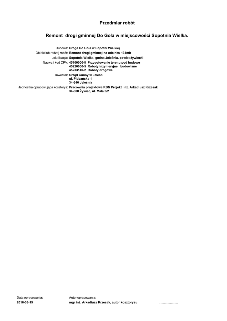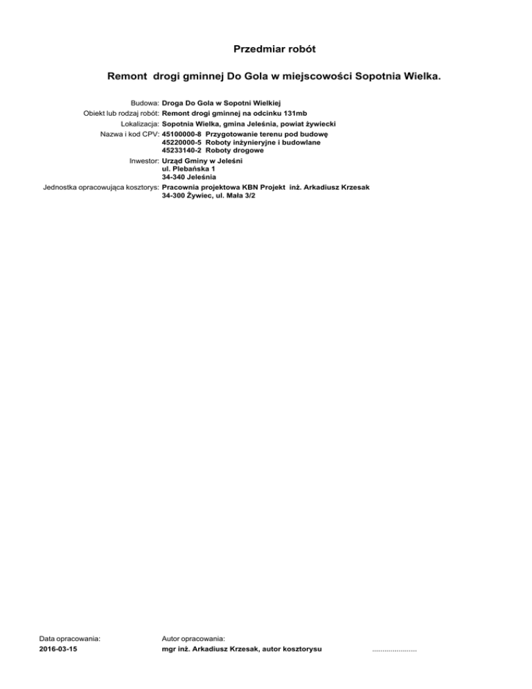 Przedmiar robót Remont drogi gminnej Do Gola w miejscowości Sopotnia Wielka. Budowa: Droga Do Gola w Sopotni Wielkiej Obiekt lub rodzaj robót: Remont drogi gminnej na odcinku 131mb Lokalizacja: Sopotnia Wielka, gmina Jeleśnia, powiat żywiecki Nazwa i kod CPV: 45100000-8 Przygotowanie terenu pod budowę 45220000-5 Roboty inżynieryjne i budowlane 45233140-2 Roboty drogowe Inwestor: Urząd Gminy w Jeleśni ul. Plebańska 1 34-340 Jeleśnia Jednostka opracowująca kosztorys: Pracownia projektowa KBN Projekt inż. Arkadiusz Krzesak 34-300 Żywiec, ul. Mała 3/2 Data opracowania: 2016-03-15 Autor opracowania: mgr inż. Arkadiusz Krzesak, autor kosztorysu ...................... Remont drogi Do Gola w Sopotni Wielkiej ZUZIA12 (C) Datacomp 1994-2015 (lic. 0005016E) Przedmiar robót <-NR-> <-PODST-> Nr 1 1.1 1.2 1.3 1.4 1.5 1.6 1.7 1.8 1.9 2 2.1 2.2 Podstawa Kosztorys <-OPIS-> <-JEDN-> Opis robót <-ILOSC-> Jm Ilość Remont drogi gminnej Do Gola w miejscowości Sopotnia Wielka. Element Roboty przygotowawcze i rozbiórkowe KNR 201/126/1 Usunięcie warstwy ziemi urodzajnej (humus) przy pomocy spycharek, grubość warstwy do 15˙cm Wyliczenie ilości robót: 66,20 66,200000 RAZEM: 66,200000 KNR 201/206/3 Roboty ziemne koparkami podsiębiernymi z transportem urobku samochodami samowyładowczymi (2) do 1˙km, koparka 0,60˙m3, humus, samochód 5-10˙t Wyliczenie ilości robót: Wywóz ziemi 66,20*0,15 9,930000 RAZEM: 9,930000 KNNR 5/721/1 Cięcie nawierzchni mechanicznie, z mas mineralno-asfaltowych, głębokość 5˙cm Wyliczenie ilości robót: 8,00 8,000000 RAZEM: 8,000000 KNNR 5/721/2 Cięcie nawierzchni mechanicznie, z mas mineralno-asfaltowych, dodatek za każdy następny 1˙cm głębokości (ponad 5) Krotność=3 Wyliczenie ilości robót: 8,00 8,000000 RAZEM: 8,000000 KNR 231/1402/5 Ścinanie poboczy mechanicznie, grubości do 10˙cm, nakłady podstawowe (1) Wyliczenie ilości robót: 70,50 70,500000 RAZEM: 70,500000 KNR 231/1402/6 Ścinanie poboczy mechanicznie, dodatek za każde dalsze 5˙cm grubości ponad 10˙cm, nakłady (1) podstawowe Wyliczenie ilości robót: 70,50 70,500000 RAZEM: 70,500000 KNR 231/101/1 Koryta wykonywane na całej szerokości jezdni i chodników, mechanicznie, grunt kategorii I-IV, na głębokości 15˙cm -analogia Krotność=0,75 Wyliczenie ilości robót: Korytowanie na głębokość 20cm 198,00 198,000000 RAZEM: 198,000000 KNNR 1/202/7 Roboty ziemne wykonywane koparkami podsiębiernymi, z transportem urobku samochodami (2) samowyładowczymi na odległość do 1˙km, koparka 0,60 m3, kategoria gruntu I-II Wyliczenie ilości robót: Odwóz 0,15*198 29,700000 Wykop z odwozem 3,40 3,400000 RAZEM: 33,100000 KNNR 1/208/2 Nakłady uzupełniające do tablic za każdy dalszy rozpoczęty 1 km odległości transportu ponad 1 km (2) samochodami samowyładowczymi, drogi o nawierzchni utwardzonej, kategoria gruntu I-IV, samochód 5-10˙t Wyliczenie ilości robót: 0,15*198,00 29,700000 3,40 3,400000 RAZEM: 33,100000 Element Nawierzchnie: droga, pobocza KNR 231/1003/5 Regeneracja i powierzchniowe zamknięcie nawierzchni bitumicznej, emulsja asfaltowa jako lepiszcze, kruszywo łamane 7˙dm3/m2 -analogia Wyliczenie ilości robót: Zabezpieczenie połączeń i szczeliny 8,00 technologicznej 8,000000 RAZEM: 8,000000 KNNR 6/113/5 Podbudowy z kruszyw łamanych, warstwa górna, po zagęszczeniu 10˙cm Wyliczenie ilości robót: Podbudowa z kruszywa łamanego 150,00+27,00 stabilizowaneo mechanicznie 0/31,5 gr. 10cm 177,000000 RAZEM: 177,000000 m2 66,200 m3 9,930 m 8,000 m 8,000 m2 70,500 m2 70,500 m2 198,000 m3 33,100 m3 33,100 mb 8,000 m2 177,000 strona nr: 2 Remont drogi Do Gola w Sopotni Wielkiej <-NR-> Nr 2.3 2.4 2.5 <-PODST-> ZUZIA12 (C) Datacomp 1994-2015 (lic. 0005016E) <-OPIS-> <-JEDN-> Podstawa Opis robót KNNR 6/113/2 Podbudowy z kruszyw łamanych, warstwa dolna, po zagęszczeniu 20˙cm Wyliczenie ilości robót: Podbudowa z kruszywa łamanego 198,00 stabilizowaneo mechanicznie 0/63 gr. 20cm Jm <-ILOSC-> Ilość RAZEM: 198,000000 198,000000 m2 198,000 RAZEM: 198,000000 198,000000 m2 198,000 KNNR 6/113/2 Podbudowy z kruszyw łamanych, warstwa górna, po zagęszczeniu 20˙cm Wyliczenie ilości robót: Podbudowa z kruszywa łamanego 198,00 stabilizowaneo mechanicznie 0/31,5 gr. 20cm KNNR 6/1005/7 Skropienie nawierzchni asfaltem Krotność=2 Wyliczenie ilości robót: 348,00+27,00 375,000000 RAZEM: 375,000000 2.6 KNR 231/310/1 Nawierzchnie z mieszanek mineralno-bitumicznych grysowych, asfaltowe, warstwa wiążąca o grubości 4˙cm Wyliczenie ilości robót: Warstwa profilująca z betonu 348,00+27,00 asfaltowego 0/16 mm gr. 4cm 375,000000 RAZEM: 375,000000 2.7 KNR 231/310/5 Nawierzchnie z mieszanek mineralno-bitumicznych grysowych, asfaltowe, warstwa ścieralna o grubości 3˙cm Wyliczenie ilości robót: Warstwa profilująca z betonu 348,00+27,00 asfaltowego 0/16 mm gr. 4cm 375,000000 RAZEM: 375,000000 2.8 KNR 231/310/6 Nawierzchnie z mieszanek mineralno-bitumicznych grysowych, asfaltowe, dodatek za każdy dalszy 1˙cm grubości warstwy Wyliczenie ilości robót: Warstwa ścieralna z betonu 348,00+27,00 asfaltowego 0/11 mm gr. 4cm -dodatek za 1cm różnicy grubości 375,000000 RAZEM: 375,000000 2.9 KNR 231/1501/2 Transport mieszanki mineralno-bitumicznej z wytworni do miejsca wbudowania na odległość do 0,5˙km, mieszanka mineralno-bitumiczna, ładowność 5-10˙t Wyliczenie ilości robót: 37,31+28,69+9,56 75,560000 RAZEM: 75,560000 2.10 KNR 231/1502/2 Transport mieszanki mineralno-bitumicznej z wytworni do miejsca wbudowania na dalsze 0,5˙km ponad 0,5˙km, mieszanka mineralno-bitumiczna, ładowność 5,0-10˙t Krotność=8 Wyliczenie ilości robót: 37,31+28,69+9,56 75,560000 RAZEM: 75,560000 2.11 KNNR 6/113/6 Podbudowy z kruszyw łamanych, warstwa górna, po zagęszczeniu 15˙cm -analogia Wyliczenie ilości robót: Pobocze z kruszywa łamanego 70,50 stabilizowanego mechanicznie o uziarnieniu ciągłym 0/31,5 gr. 15cm 70,500000 RAZEM: 70,500000 3 Element Poprawa odwodn