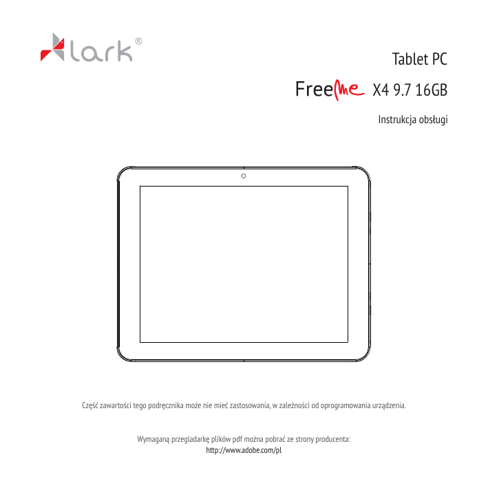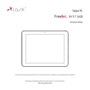 Tablet PC X4 9.7 16GB Instrukcja obsługi Część zawartości tego podręcznika może nie mieć zastosowania, w zależności od oprogramowania urządzenia. Wymaganą przegladarkę plików pdf można pobrać ze strony producenta: http://www.adobe.com/pl Przed rozpoczęciem użytkowania Dziękujemy za wybór tabletu Lark FreeMe X4 9.7 i życzymy satysfakcji z jego użytkowania. Tablet PC to wielofunkcyjne urządzenie, które wykorzystasz zarówno do nauki i pracy, jak i po godzinach, dla przyjemności i rozrywki. Dzięki tabletowi wygodny i szybki dostęp do Internetu masz zawsze w zasięgu ręki, bez potrzeby korzystania z dużych i nieporęcznych komputerów poprzednich generacji. System Android 4.1 i aplikacja Android Market umożliwiają dostęp do mnóstwa przydatnych aplikacji, zarówno biznesowych, jak i służących rozrywce. Przejrzysty i intuicyjny interfejs zapewni Ci przyjemność codziennego korzystania z tabletu. Prosimy, przeczytaj tę instrukcję i zachowaj ją na później. Instrukcja zawiera ważne wskazówki dotyczące bezpiecznej i efektywnej eksploatacji tabletu. Producent zastrzega sobie możliwość wprowadzania zmian w urządzeniu, jak i w instrukcji. Aktualizowane wersje instrukcji będą umieszczane na stronie www.lark.com.pl. Prosimy odwoływać się do strony www.lark.com.pl w przypadku pytań lub wątpliwości dotyczących obsługi urządzenia. 1 Przed rozpoczęciem użytkowania Ochrona i konserwacja urządzenia Chroń tablet i towarzyszące mu akcesoria przed wodą i wilgocią. Zamoczenie urządzenia elektrycznego nie tylko powoduje jego poważne uszkodzenie, ale stanowi także zagrożenie dla użytkownika (ryzyko porażenia prądem). Chroń urządzenie przed silnymi wstrząsami, upadkiem, wibracjami. Chroń urządzenie przed wysokimi i niskimi temperaturami. Unikaj upadków, nie rzucaj urządzeniem, nie przebijaj obudowy. Nie zginaj tabletu. Nie używaj akcesoriów nieznanego pochodzenia, mogą one uszkodzić tablet i wyłączają gwarancję producenta. Ważne wskazówki dotyczące bezpieczeństwa Zawsze przestrzegaj poniższych zasad.Zapoznaj z nimi także starsze dzieci, które mogą używać tabletu. Nigdynie obsługuj tabletu podczas prowadzenia samochodu. W szpitalach i innych placówkach medycznych może obowiązywać zakaz używania urządzeń elektronicznych, w tym tabletów. Zawsze stosuj się do takich zakazów. Wyłączaj tablet w samolocie przez cały czas trwania lotu lub podczas startu i lądowania, w zależności od instrukcji wydanych przez obsługę samolotu. Wyłączaj urządzenie w pobliżu ważnych urządzeń elektronicznych, których działanie mogłyby zakłócić ewentualne interferencje. Nie próbuj rozkręcać, modyfikować ani samodzielnie naprawiać tabletu. Zawsze powierzaj takie zadania autoryzowanym serwisom. Chroń tablet przed silnym promieniowaniem magnetycznym. Pole takie może uszkodzić magnetyczne nośniki pamięci. 2 Przed rozpoczęciem użytkowania Nie używaj tabletu w miejscach o bardzo wysokiej temperaturze lub w obszarach szczególnie zagrożonych pożarem lub wybuchem, na przykład na stacjach benzynowych. Nadzoruj korzystanie z urządzenia przez dzieci, nie dopuszczaj do samodzielnej zabawytabletem. Chroń tablet przed wodą i wilgocią, nie używaj ani nie przechowuj go np. w łazience. Przekreślony symbol pojemnika na śmieci oznacza, że na terenie Unii Europejskiej po zakończeniu użytkowania produktu należy się go pozbyć w osobnym, specjalnie od tego przeznaczonym punkcie. Nie należy wyrzucać tych produktów razem z niesortowanymi odpadami komunalnymi. 3 Zapoznanie z elementami produktu Budowa urządzenia 1 2 1. Kamera 2. Ekran dotykowy 4 Zapoznanie z elementami produktu 3 4 6 7 8 9 10 11 12 13 5 3. Aparat 9. Mikrofon 4. Głośnik 10. Złącze micro USB 5. Przycisk RESET 11. Złącze HDMI 6. Zwiększanie / zmniejszanie głośności 12. Gniazdo zasilania 7. 13. Przycisk ON/OFF (Włączanie/Wyłączanie) Gniazdo słuchawek 8. Slot na kartę microSD 5 Zasady użytkowania Ładowanie akumulatora Przed pierwszym użyciem tabletu prosimy naładować jego akumulator. 1. Podłącz tablet do ładowarki sieciowej, wtyczkę ładowarki umieść w gniazdku elektrycznym. 2. Sprawdzaj diody ładowania. Czerwona oznacza, że urządzenie się ładuje, zielona – ładowanie zostało zakończone. UWAGA! Czas ładowania wynosi około 4 godziny. Jeśli używasz urządzenia w czasie jego ładowania, proces ładowania będzie trwał dłużej. Po zakończeniu ładowania lub aby przerwać ładowanie, odłącz kabel od urządzenia. Akumulator możesz wymienić tylko na identyczny. Nie zgniataj akumulatora, nie wrzucaj go do ognia itd. grozi to pożarem lub porażeniem prądem. 6 Obsługa urządzenia Funkcje przycisków Przycisk ON/OFF - naciśnij dłużej, aby włączyć urządzenie Zwiększenie głośności - wciśnij przycisk V+, aby zwiększyć głośność Zmniejszenie głośności - wciśnij przycisk V-, aby zmniejszyć głośność Włączanie i wyłączanie urządzenia Włączanie Po naciśnięciu i przytrzymaniu przez 2 sekundy przycisku ON/OFF pokaże się ekran startowy Wyłączanie Aby wyłączyć urządzenie wciśnij i przytrzymaj przycisk ON/OFF przez około 2 sekundy. Blokowanie i odblokowanie ekranu Aby odblokować ekran, przeciągnij ikonę blokady do góry. 7 Obsługa urządzenia Funkcja MULTI-TOUCH Nigdy przedtem posługiwanie się urządzeniem elektronicznym nie było tak proste i naturalne. Ekran reaguje nawet na delikatne muśnięcia, rozumie dotyk kilku palców przyłożonych jednocześnie, czyli np. 'uszczypnięcie zmniejsza obraz, a rozsunięcie palców- powiększa go. Obraz możemy obrócić przy pomocy dwóch palców, zupełnie jak kartkę papieru na stole. Ekran pojemnościowy jest też niezastąpiony przy obsłudze gier. Obsługa panelu dotykowego Istnieje kilka sposobów obsługi panelu dotykowego, menu i aplikacji zainstalowanych na urządzeniu. Kliknięcie Obsługa panelu dotykowego w urządzeniu 