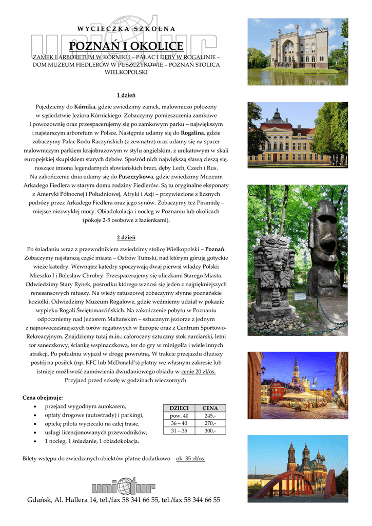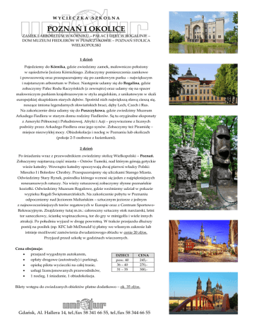 WYCIECZKA SZKOLNA POZNAŃ I OKOLICE ZAMEK I ARBORETUM W KÓRNIKU – PAŁAC I DĘBY W ROGALINIE – DOM MUZEUM FIEDLERÓW W PUSZCZYKOWIE – POZNAŃ STOLICA WIELKOPOLSKI 1 dzień Pojedziemy do Kórnika, gdzie zwiedzimy zamek, malowniczo położony w sąsiedztwie Jeziora Kórnickiego. Zobaczymy pomieszczenia zamkowe i powozownię oraz przespacerujemy się po zamkowym parku – największym i najstarszym arboretum w Polsce. Następnie udamy się do Rogalina, gdzie zobaczymy Pałac Rodu Raczyńskich (z zewnątrz) oraz udamy się na spacer malowniczym parkiem krajobrazowym w stylu angielskim, z unikatowym w skali europejskiej skupiskiem starych dębów. Spośród nich największą sławą cieszą się, noszące imiona legendarnych słowiańskich braci, dęby Lech, Czech i Rus. Na zakończenie dnia udamy się do Puszczykowa, gdzie zwiedzimy Muzeum Arkadego Fiedlera w starym domu rodziny Fiedlerów. Są tu oryginalne eksponaty z Ameryki Północnej i Południowej, Afryki i Azji – przywiezione z licznych podróży przez Arkadego Fiedlera oraz jego synów. Zobaczymy też Piramidę – miejsce niezwykłej mocy. Obiadokolacja i nocleg w Poznaniu lub okolicach (pokoje 2-5 osobowe z łazienkami). 2 dzień Po śniadaniu wraz z przewodnikiem zwiedzimy stolicę Wielkopolski – Poznań. Zobaczymy najstarszą część miasta – Ostrów Tumski, nad którym górują gotyckie wieże katedry. Wewnątrz katedry spoczywają dwaj pierwsi władcy Polski: Mieszko I i Bolesław Chrobry. Przespacerujemy się uliczkami Starego Miasta. Odwiedzimy Stary Rynek, pośrodku którego wznosi się jeden z najpiękniejszych renesansowych ratuszy. Na wieży ratuszowej zobaczymy słynne poznańskie koziołki. Odwiedzimy Muzeum Rogalowe, gdzie weźmiemy udział w pokazie wypieku Rogali Świętomarcińskich. Na zakończenie pobytu w Poznaniu odpoczniemy nad Jeziorem Maltańskim – sztucznym jeziorze z jednym z najnowocześniejszych torów regatowych w Europie oraz z Centrum SportowoRekreacyjnym. Znajdziemy tutaj m.in.: całoroczny sztuczny stok narciarski, letni tor saneczkowy, ściankę wspinaczkową, tor do gry w minigolfa i wiele innych atrakcji. Po południu wyjazd w drogę powrotną. W trakcie przejazdu dłuższy postój na posiłek (np. KFC lub McDonald’s) płatny we własnym zakresie lub istnieje możliwość zamówienia dwudaniowego obiadu w cenie 20 zł/os. Przyjazd przed szkołę w godzinach wieczornych. Cena obejmuje: przejazd wygodnym autokarem, opłaty drogowe (autostrady) i parkingi, opiekę pilota wycieczki na całej trasie, usługi licencjonowanych przewodników, 1 nocleg, 1 śniadanie, 1 obiadokolacja. DZIECI pow. 40 36 – 40 31 – 35 CENA 245,270,300,- Bilety wstępu do zwiedzanych obiektów płatne dodatkowo – ok. 35 zł/os. Gdańsk, Al. Hallera 14, tel./fax 58 341 66 55, tel./fax 58 344 66 55 Sugerowane bilety wstępów: Kórnik – Zamek ………………………………………………………. cena: ok. 7 zł/os. Kórnik – Arboretum ………………………………………….………. cena: ok. 4 zł/os. Puszczykowo – Muzeum Arkadego Fiedlera ……………………… cena: ok. 9 zł/os. Poznań – Krypty Katedry …………………………………….……… cena: ok. 3 zł/os. Poznań – Muzeum Rogalowe ………………………………….……. cena: ok. 12 zł/os. Atrakcje nad Jeziorem Malta płatne indywidualnie na miejscu m.in.: Malta – letni tor saneczkowy – 1 zjazd ………………….……..…… cena: ok. 5 zł/os. Malta – Kolejka Górska Adrenalina – 1 zjazd ……………….…….. cena: ok. 7 zł/os. Malta – zjazd na pontonie – 1 zjazd ………....……………………… cena: ok. 4 zł/os. Malta – mini golf ………………………………………….…….….… cena: ok. 11 zł/os. Zamiennie lub dodatkowo proponujemy: Gniezno – Katedra, Drzwi Gnieźnieńskie, Podziemia…..........…… cena: ok. 6 zł/os. Gniezno – Muzeum Początków Państwa Polskiego ………………. cena: ok. 6 zł/os. Ostrów Lednicki – Muzeum Pierwszych Piastów …………….….. cena: ok. 5 zł/os Pobiedziska – Muzeum Miniatur ……………………………….….. cena: ok. 5 zł/os. Poznań – Palmiarnia …………………………………………………. cena: ok. 5 zł/os. Gdańsk, Al. Hallera 14, tel./fax 58 341 66 55, tel./fax 58 344 66 55