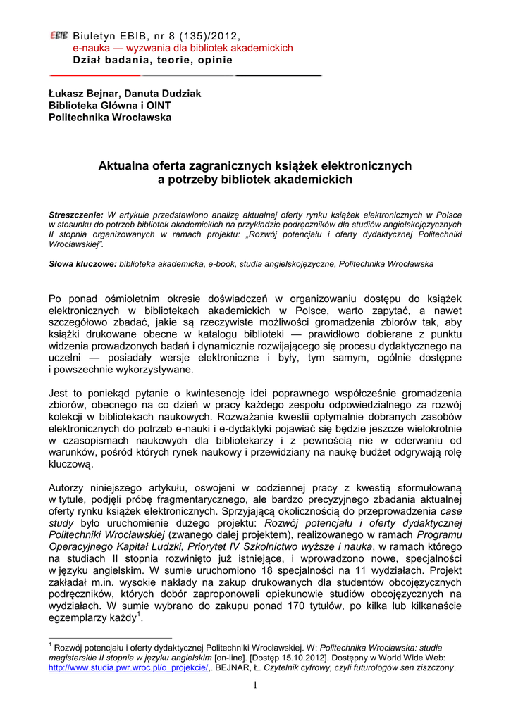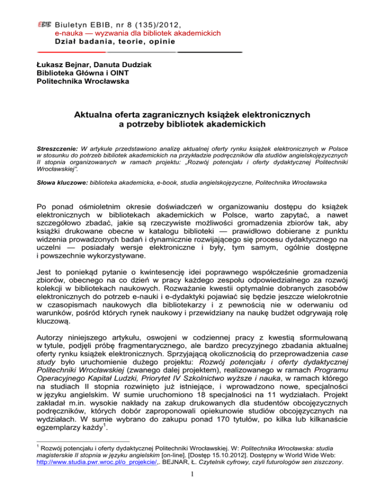 Biuletyn EBIB, nr 8 (135)/2012, e-nauka — wyzwania dla bibliotek akademickich Dział badania, teorie, opinie Łukasz Bejnar, Danuta Dudziak Biblioteka Główna i OINT Politechnika Wrocławska Aktualna oferta zagranicznych książek elektronicznych a potrzeby bibliotek akademickich Streszczenie: W artykule przedstawiono analizę aktualnej oferty rynku książek elektronicznych w Polsce w stosunku do potrzeb bibliotek akademickich na przykładzie podręczników dla studiów angielskojęzycznych II stopnia organizowanych w ramach projektu: „Rozwój potencjału i oferty dydaktycznej Politechniki Wrocławskiej”. Słowa kluczowe: biblioteka akademicka, e-book, studia angielskojęzyczne, Politechnika Wrocławska Po ponad ośmioletnim okresie doświadczeń w organizowaniu dostępu do książek elektronicznych w bibliotekach akademickich w Polsce, warto zapytać, a nawet szczegółowo zbadać, jakie są rzeczywiste możliwości gromadzenia zbiorów tak, aby książki drukowane obecne w katalogu biblioteki — prawidłowo dobierane z punktu widzenia prowadzonych badań i dynamicznie rozwijającego się procesu dydaktycznego na uczelni — posiadały wersje elektroniczne i były, tym samym, ogólnie dostępne i powszechnie wykorzystywane. Jest to poniekąd pytanie o kwintesencję idei poprawnego współcześnie gromadzenia zbiorów, obecnego na co dzień w pracy każdego zespołu odpowiedzialnego za rozwój kolekcji w bibliotekach naukowych. Rozważanie kwestii optymalnie dobranych zasobów elektronicznych do potrzeb e-nauki i e-dydaktyki pojawiać się będzie jeszcze wielokrotnie w czasopismach naukowych dla bibliotekarzy i z pewnością nie w oderwaniu od warunków, pośród których rynek naukowy i przewidziany na naukę budżet odgrywają rolę kluczową. Autorzy niniejszego artykułu, oswojeni w codziennej pracy z kwestią sformułowaną w tytule, podjęli próbę fragmentarycznego, ale bardzo precyzyjnego zbadania aktualnej oferty rynku książek elektronicznych. Sprzyjającą okolicznością do przeprowadzenia case study było uruchomienie dużego projektu: Rozwój potencjału i oferty dydaktycznej Politechniki Wrocławskiej (zwanego dalej projektem), realizowanego w ramach Programu Operacyjnego Kapitał Ludzki, Priorytet IV Szkolnictwo wyższe i nauka, w ramach którego na studiach II stopnia rozwinięto już istniejące, i wprowadzono nowe, specjalności w języku angielskim. W sumie uruchomiono 18 specjalności na 11 wydziałach. Projekt zakładał m.in. wysokie nakłady na zakup drukowanych dla studentów obcojęzycznych podręczników, których dobór zaproponowali opiekunowie studiów obcojęzycznych na wydziałach. W sumie wybrano do zakupu ponad 170 tytułów, po kilka lub kilkanaście egzemplarzy każdy1. 1 Rozwój potencjału i oferty dydaktycznej Politechniki Wrocławskiej. W: Politechnika Wrocławska: studia magisterskie II stopnia w języku angielskim [on-line]. [Dostęp 15.10.2012]. Dostępny w World Wide Web: http://www.studia.pwr.wroc.pl/o_projekcie/,. BEJNAR, Ł. Czytelnik cyfrowy, czyli futurologów sen ziszczony. 1 Biuletyn EBIB, nr 8 (135)/2012, e-nauka — wyzwania dla bibliotek akademickich Dział badania, teorie, opinie Autorzy artykułu zbadali możliwości uzupełnienia o wersje elektroniczne 172 tytułów zakupionych w ramach projektu, biorąc pod uwagę ich dostępność w ofertach dostawców/agregatorów najczęściej testowanych i obecnych w bibliotekach akademickich w Polsce. Badanie podzielono na dwa etapy. Najpierw określono, ile spośród 172 tytułów jest już w zbiorach Biblioteki Głównej Politechniki Wrocławskiej (zwanej dalej biblioteką) i na jakiej platformie są udostępniane (Raport nr 1), a następnie, jaki procent pozostałych tytułów można by dokupić (w modelu na własność, a nie w pakiecie) według stanu na październik 2012 r. (Raport nr 2). Po przeprowadzonych analizach stwierdzono na przykładzie ponad 100 tytułów, że rynek książek elektronicznych w zakresie podręczników angielskojęzycznych, niezbędnych do prawidłowego przebiegu procesu dydaktycznego w dużej uczelni prowadzącej liczne kursy w języku angielskim, dalece odbiega od potrzeb dużych bibliotek akademickich. Raport 1. E-booki z projektu w zasobach elektronicznych Biblioteki Głównej Politechniki Wrocławskiej Spośród 172 podręczników drukowanych, zakupionych w ramach projektu, 65 tytułów (38%) znajduje się w zasobach elektronicznych biblioteki. dostępne w e-zasobach BG 38% brak w e-zasobach BG 62% Wykr. 1. Obecność poszukiwanych e-booków w zasobach biblioteki. Źródło: Opracowanie na podstawie badań własnych. W: CZYREK, J., GÓRNA, B. (red.). Między hybrydą a cyfrą” [on-line]. Wrocław: Korporacja Bibliotekarzy Wrocławskich : Dolnośląska Biblioteka Pedagogiczna, 2010, s. 29–35. [Dostęp 15.10.2012]. Dostępny w World Wide Web: http://www.dbc.wroc.pl/Content/5941/Miedzy_hybryda_a_cyfra.pdf. 2 Biuletyn EBIB, nr 8 (135)/2012, e-nauka — wyzwania dla bibliotek akademickich Dział badania, teorie, opinie Rozkład 65 tytułów dostępnych w e-zasobach biblioteki na poszczególne platformy wygląda następująco: 1 tytuł znajduje się na platformie MyiLibrary (zakup na własność przez bibliotekę, dostęp ma jeden użytkownik w jednym czasie), 14 tytułów znajduje się na platformie Knovel (dostęp w ramach licencji krajowej, dla nieograniczonej liczby równoczesnych użytkowników), 20 tytułów znajduje się na platformie Safari (zakup subskrypcji przez bibliotekę, dostęp do 100 punktów, dla 6 równoczesnych użytkowników), 18 tytułów znajduje się na platformie SpringerLink (dostęp w ramach licencji krajowej, dla nieograniczonej liczby równoczesnych użytkowników), 14 tytułów znajduje się na platformie Wiley Online Library (zakup na własność przez bibliotekę, dostęp dla nieograniczonej liczby równoczesnych użytkowników). Wyszczególnione w nawiasach modele dostępu w ramach różnych platform dodano ze wzgl