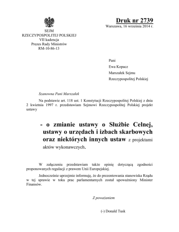 Druk nr 2739 Warszawa, 16 września 2014 r. SEJM RZECZYPOSPOLITEJ POLSKIEJ VII kadencja Prezes Rady Ministrów RM-10-86-13 Pani Ewa Kopacz Marszałek Sejmu Rzeczypospolitej Polskiej Szanowna Pani Marszałek Na podstawie art. 118 ust. 1 Konstytucji Rzeczypospolitej Polskiej z dnia 2 kwietnia 1997 r. przedstawiam Sejmowi Rzeczypospolitej Polskiej projekt ustawy - o zmianie ustawy o Służbie Celnej, ustawy o urzędach i izbach skarbowych oraz niektórych innych ustaw z projektami aktów wykonawczych. W załączeniu przedstawiam także opinię proponowanych regulacji z prawem Unii Europejskiej. dotyczącą zgodności Jednocześnie uprzejmie informuję, że do prezentowania stanowiska Rządu w tej sprawie w toku prac parlamentarnych został upoważniony Minister Finansów. Z poważaniem (-) Donald Tusk Projekt U S T AWA z dnia o zmianie ustawy o Służbie Celnej, ustawy o urzędach i izbach skarbowych oraz niektórych innych ustaw 1) Art. 1. W ustawie z dnia 27 sierpnia 2009 r. o Służbie Celnej (Dz. U. z 2013 r. poz. 1404 oraz z 2014 r. poz. 486, 1055 i 1215) wprowadza się następujące zmiany: 1) w art. 2 w ust. 1 po pkt 9 dodaje się pkt 9a w brzmieniu: „9a) wykonywanie zadań, o których mowa w art. 9 ust. 1 lit. a rozporządzenia Komisji (UE) nr 737/2010 z dnia 10 sierpnia 2010 r. ustanawiającego szczegółowe zasady wykonania rozporządzenia Parlamentu Europejskiego i Rady (WE) nr 1007/2009 w sprawie handlu produktami z fok (Dz. Urz. UE L 216 z 17.08.2010, str. 1);”; 2) w art. 8 w ust. 1 zdanie pierwsze otrzymuje brzmienie: „Informacja dotycząca podmiotu, o którym mowa w art. 30 ust. 1, będąca przedmiotem albo wynikiem przeprowadzonej przez organ Służby Celnej analizy ryzyka, o której mowa w art. 3 ust. 1, oraz informacja uzyskana w sposób określony w art. 5–7, która na mocy przepisów odrębnych podlega ochronie, jest tajemnicą celną, z zastrzeżeniem ust. 8, i nie może być rozpowszechniana.”; 1) Niniejszą ustawą zmienia się następujące ustawy: ustawę z dnia 14 czerwca 1960 r. – Kodeks postępowania administracyjnego, ustawę z dnia 17 czerwca 1966 r. o postępowaniu egzekucyjnym w administracji, ustawę z dnia 28 lipca 1983 r. o podatku od spadków i darowizn, ustawę z dnia 26 lipca 1991 r. o podatku dochodowym od osób fizycznych, ustawę z dnia 28 września 1991 r. o kontroli skarbowej, ustawę z dnia 15 lutego 1992 r. o podatku dochodowym od osób prawnych, ustawę z dnia 27 października 1994 r. o autostradach płatnych oraz o Krajowym Funduszu Drogowym, ustawę z dnia 20 czerwca 1997 r. – Prawo o ruchu drogowym, ustawę z dnia 29 sierpnia 1997 r. – Ordynacja podatkowa, ustawę z dnia 20 listopada 1998 r. o zryczałtowanym podatku dochodowym od niektórych przychodów osiąganych przez osoby fizyczne, ustawę z dnia 21 grudnia 2000 r. o jakości handlowej artykułów rolno-spożywczych, ustawę z dnia 6 września 2001 r. o transporcie drogowym, ustawę z dnia 18 grudnia 2003 r. o ochronie roślin, ustawę z dnia 28 stycznia 2004 r. o Inspekcji Weterynaryjnej, ustawę z dnia 11 marca 2004 r. o podatku od towarów i usług, ustawę z dnia 19 marca 2004 r. – Prawo celne, ustawę z dnia 24 sierpnia 2006 r. o podatku tonażowym, ustawę z dnia 10 lipca 2007 r. o nawozach i nawożeniu, ustawę z dnia 21 listopada 2008 r. o służbie cywilnej, ustawę z dnia 6 grudnia 2008 r. o podatku akcyzowym, ustawę z dnia 19 listopada 2009 r. o grach hazardowych, ustawę z dnia 2 marca 2012 r. o podatku od wydobycia niektórych kopalin oraz ustawę z dnia 11 października 2013 r. o wzajemnej pomocy przy dochodzeniu podatków, należności celnych i innych należności pieniężnych. –2– 3) w art. 9 dodaje się ust. 4 w brzmieniu: „4. Minister właściwy do spraw finansów publicznych określi, w drodze rozporządzenia: 1) właściwość miejscową urzędów celnych oraz izb celnych do wykonywania zadań określonych w Kodeksie karnym skarbowym, 2) właściwość miejscową wyznaczonych urzędów celnych do prowadzenia postępowań przygotowawczych w sprawach o niektóre przestępstwa skarbowe i wykroczenia skarbowe określone w art. 133 § 1 pkt 1 Kodeksu karnego skarbowego – mając na uwadze zapewnienie sprawnego wykonywania zadań Służby Celnej.”; 4) w art. 10: a) w ust. 3: – pkt 5 otrzymuje brzmienie: „5) wykonywanie funkcji specjalnej jednostki w rozumieniu art. 85 rozporządzenia Parlamentu Europejskiego i Rady (UE) nr 1306/2013 z dnia 17 grudnia 2013 r. w sprawie finansowania wspólnej polityki rolnej, zarządzania nią i monitorowania jej oraz uchylającego rozporządzenia Rady (EWG) nr 352/78, (WE) nr 165/94, (WE) nr 2799/98, (WE) nr 814/2000, (WE) nr 1290/2005 i (WE) nr 485/2008 (Dz. Urz. UE L 347 z 20.12.2013, str. 549), zwanego dalej „rozporządzeniem (UE) nr 1306/2013”, polegającej w szczególności na koordynacji i ogólnym nadzorze kontroli przeprowadzanych przez inne organy;”, – b) uchyla się pkt 6, po ust. 3 dodaje się ust. 3a w brzmieniu: „3a. W celu zapewnienia sprawnego i efektywnego wykonywania zadań, w szczególności nadzoru nad działalnością dyrektorów izb celnych i naczelników urzędów celnych oraz kształtowania polityki kadrowej i szkoleniowej w Służbie Celnej, Szef Służby Celnej może wydawać zarządzenia.”; 5) w art. 17: a) w ust. 1 pkt 2 otrzymuje brzmienie: „2) zlecania wykonania określonych czynności organom administracji publicznej oraz państwowym jednostkom organizacyjnym i osobom prawnym –3– uprawnionym do kontroli dokumentów, które mają znaczenie dla realizacji zadań określonych w tytule V w rozdziale III rozporządzenia (UE) nr 1306/2013.”, b) ust. 2 otrzymuje brzmienie: „2. Pisemne wystąpienie o dostarczenie informacji lub wykonanie określonych czynności powinno w szczególności zawierać oznaczenie treści żądania lub zlecenia oraz termin dostarczenia informacji lub wykonania określonej czynności. W przypadku podmiotów innych niż przeprowadzające k