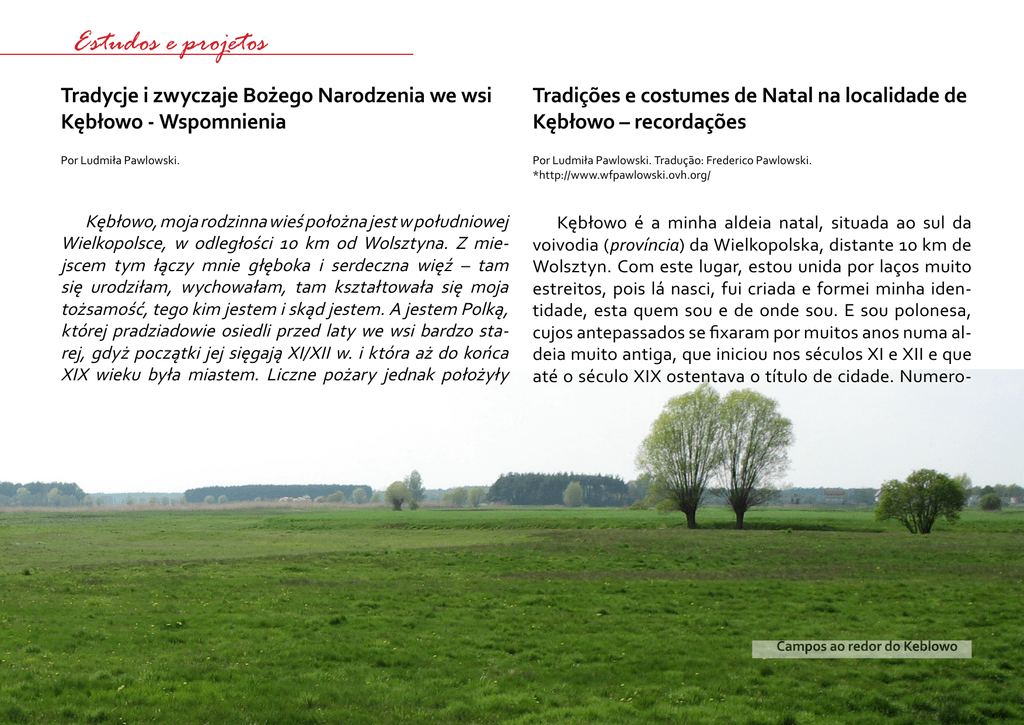 Estudos e projetos Tradycje i zwyczaje Bożego Narodzenia we wsi Kębłowo - Wspomnienia Tradições e costumes de Natal na localidade de Kębłowo – recordações Por Ludmiła Pawlowski. Por Ludmiła Pawlowski. Tradução: Frederico Pawlowski. *http://www.wfpawlowski.ovh.org/ Kębłowo, moja rodzinna wieś położna jest w południowej Wielkopolsce, w odległości 10 km od Wolsztyna. Z miejscem tym łączy mnie głęboka i serdeczna więź – tam się urodziłam, wychowałam, tam kształtowała się moja tożsamość, tego kim jestem i skąd jestem. A jestem Polką, której pradziadowie osiedli przed laty we wsi bardzo starej, gdyż początki jej sięgają XI/XII w. i która aż do końca XIX wieku była miastem. Liczne pożary jednak położyły Kębłowo é a minha aldeia natal, situada ao sul da voivodia (província) da Wielkopolska, distante 10 km de Wolsztyn. Com este lugar, estou unida por laços muito estreitos, pois lá nasci, fui criada e formei minha identidade, esta quem sou e de onde sou. E sou polonesa, cujos antepassados se fixaram por muitos anos numa aldeia muito antiga, que iniciou nos séculos XI e XII e que até o século XIX ostentava o título de cidade. Numero- Campos ao redor do Keblowo Estudos e projetos kres historii miejskiej Kębłowa. Do dziś jednak zachował się zabytkowy układ urbanistyczny Rynku oraz wiele pamiątek minionych stuleci. Historia budzi szacunek, ale z nią nieodzownie łączą się również tradycja i zwyczaje, które kultywowali dziadowie, a które dziś stanowią naszą spuściznę, nasze dziedzictwo. Jest przed czym chylić czoła w odniesieniu do Kębłowa, gdyż jego mieszkańcy znani są w regionie z szeroko pojętego umiłowania do swojego gniazda. W gnieździe tym, do dziś można znaleźć niejedno „złote jajo” w postaci jakiejś dawnej legendy, specyficznej gwary, wierzeń czy zwyczajów. Pozwolę więc sobie w niniejszej publikacji opisać w oparciu o własne wspomnienia niektóre tradycje i zwyczaje mojej wsi z okazii Bozego Narodzenia. Otóż nie zawsze było tak w Boże Narodzenie, jak w opisach znanych nam z książek i filmów – że gdzieś między polami i lasami leży wieś cała zasypana śniegiem. Owszem, w przypadku Kębłowa położenie się zgadza - właśnie między polami i lasami, ale co do pogody, to bywało różnie, czasem nawet w miarę ciepło. W pamięci mam jednak też takie święta, że żeby dojść do kościoła na pasterkę, trzeba było pokonać niejedną zaspę. Kilka lat temu spadło tyle śniegu, że księdza trzeba było zawieźć saniami do sąsiedniej miejscowości, bo samochodem nie dało rady się przedrzeć. Istotnie miałam sos incêndios, porém, colocaram um final na história da cidade de Kębłowo. De qualquer forma, o conjunto urbanístico do Mercado e diversas recordações dos séculos passados se mantêm até os dias de hoje. Uma história que desperta o respeito, mas que traz consigo também tradições e costumes cultivados pelos nossos avós e que hoje formam nosso atavismo, nosso patrimônio. Há o que se respeitar no que se refere a Kębłowo, pois seus habitantes são reconhecidos na região pelo grande amor que têm pelo seu ninho. E neste ninho podem-se hoje encontrar diversos “ovos de ouro” em forma de lendas antigas, falares característicos, crenças e costumes. Nesta publicação tomo a liberdade de descrever algumas tradições e costumes da época natalina, em base das próprias recordações. Nem sempre o Natal foi como nos aparece em livros e filmes, num lugar entre campos e bosques onde há uma aldeia totalmente coberta de neve. Até que no caso de Kębłowo a localização é assim mesmo, pois está entre campos e bosques, mas o clima se apresentou diversificado, por vezes até fez relativo calor para a época. Mas na memória tenho Natais que, para se chegar até a igreja na Missa do Galo, tive de superar mais de um morro de neve. Há alguns anos houve uma nevada tão forte que o padre precisou ser conduzido de trenó até as locaRevista Cekaw - nº X - Página 16 Estudos e projetos wówczas wrażenie prawdziwych polskich świąt, takich z żywą choinką, kolędami, ośnieżonymi krajobrazami. Ale od początku. W zasadzie już od 1 grudnia w Kębłowie czuć atmosferę zbliżającej się Gwiazdki. Gospodynie domowe zazwyczaj są zabiegane, zajęte przedświąteczną krzątaniną. We wsi co rusz odbywa się jakaś wigilia - a to Koło Gospodyń Wiejskich spotyka się na opłatku w Domu Kultury, a to członkowie Zespołu Pieśni i Tańca etc. Często jest tak, że jedna osoba jest członkiem kilku grup, zatem uczestniczy w ok. 5 wigiliach, nim doczeka się tej jednej jedynej w rodzinnym gronie. 24 grudnia w moim domu od rana zawsze jest gwarno, gdyż właśnie wtedy zabieramy się za strojenie choinki - żywej, kształtnej, wysokiej aż do sufitu. Nigdy nie zabrakło też na niej prawdziwych świeczek. Pod choinką oczywiście umieszczamy mały żłóbek z Dzieciątkiem Jezus. Całe domostwo ozdabiamy wszelkiego typu stroikami, lampkami, świecidełkami, czasem też i jemiołą. Wigilię rozpoczynamy wraz z pojawieniem się pierwszej gwiazdy na niebie (ok. 17.00). Głowa rodziny czyta fragment Ewangelii wg Św. Łukasza, potem wspólnie się modlimy, łamiemy opłatkiem życząc sobie wszystkiego dobrego, po czym zasiadamy do stołu. Co do potraw wigilijnych, to w zależności od części kraju wygląda to lidades vizinhas, já que de carro era totalmente inviável. O mais importante é que tive sempre o sentimento do real Natal polonês, com o pinheirinho vivo, as cantigas – kolędy – e a paisagem nevada. Mas vou descrever desde o início. Em verdade, já no dia 1º de dezembro é sensível em Kębłowo o clima da Estrela Guia a se aproximar. As donas de casa ficam correndo de um lado para o outro, ocupadas com todos os preparativos para as Festas. Na aldeia a cada pouco acontece uma vigília – celebração da noite que antecede o Natal – com