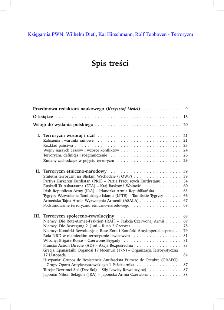 Księgarnia PWN: Wilhelm Dietl, Kai Hirschmann, Rolf Tophoven - Terroryzm Spis treści Przedmowa redaktora naukowego (Krzysztof Liedel) . . . . . . . . . . . . 9 O książce . . . . . . . . . . . . . . . . . . . . . . . . . . . . . . . . . . . . . . . 18 Wstęp do wydania polskiego . . . . . . . . . . . . . . . . . . . . . . . . . . . 20 I. Terroryzm wczoraj i dziś . . . . . . . . . . . . . . . . . . . . . . . . . . 21 Założenia i warunki ramowe . . . . . . . Rozkład państwa . . . . . . . . . . . . . . Wojny naszych czasów i wzorce konfliktów Terroryzm: definicja i rozgraniczenie . . . Zmiany zachodzące w pojęciu terroryzm . . . . . . . . . . . . . . . . . . . . . . . . . . . . . . . 21 23 24 26 29 . . . . . . . . . . . . . . . . . Stuletni terroryzm na Bliskim Wschodzie (i OWP) . . . . . . . . . . Partiya Karkerên Kurdistan (PKK) – Partia Pracujących Kurdystanu . Euskadi Ta Askatasuna (ETA) – Kraj Basków i Wolność . . . . . . . Irish Republican Army (IRA) – Irlandzka Armia Republikańska . . . Tygrysy Wyzwolenia Tamilskiego Islamu (LTTE) – Tamilskie Tygrysy Armeńska Tajna Armia Wyzwolenia Armenii (ASALA) . . . . . . . . Podsumowanie terroryzmu etniczno-narodowego . . . . . . . . . . . . . . . . . . . . . . . . . . . . . . . . . . . . . . . . . . . . . . . . . . 39 39 54 60 63 66 67 68 II. Terroryzm etniczno-narodowy . . . . . . . . . . . . . . . . . . . . . . . . . . . . . . . . . . . . . . . . . . . . . . . . . . . . . . . . . . . . . . . . . III. Terroryzm społeczno-rewolucyjny . . . . . . . . . . . . . . . . . . . . 69 Niemcy: Die Rote-Armee-Fraktion (RAF) – Frakcja Czerwonej Armii . . . . Niemcy: Die Bewegung 2. Juni – Ruch 2 Czerwca . . . . . . . . . . . . . . Niemcy: Komórki Rewolucyjne, Rote Zora i Komórki Antyimperialistyczne . Rola NRD w niemieckim terroryzmie lewicowym . . . . . . . . . . . . . . Włochy: Brigate Rosse – Czerwone Brygady . . . . . . . . . . . . . . . . . Francja: Action Directe (AD) – Akcja Bezpośrednia . . . . . . . . . . . . . Grecja: Epanastaiki Organosi 17 Noemuri (17N) – Organizacja Terrorystyczna 17 Listopada . . . . . . . . . . . . . . . . . . . . . . . . . . . . . . . . . . Hiszpania: Grupos de Resistencia Antifascista Primero de Octubre (GRAPO) – Grupy Oporu Antyfaszystowskiego 1 Października . . . . . . . . . . . . . Turcja: Devrimci Sol (Dev Sol) – Siły Lewicy Rewolucyjnej . . . . . . . . . Japonia: Nihon Sekigun ( JRA) – Japońska Armia Czerwona . . . . . . . . . . . . . . . 69 78 79 81 81 83 . 84 . 87 . 87 . 88 6 Spis treści IV. Terroryzm z udziałem państwa . . . . . . . . . . . . . . . . . . . . . . 90 Terroryzm państwowy . . . . . . . . . . . . . . . . . . . . . . . . . . . . . . 90 Terroryzm wspierany przez państwo . . . . . . . . . . . . . . . . . . . . . . 108 Terroryzm tolerowany przez państwo . . . . . . . . . . . . . . . . . . . . . . 110 V. Islamizm i dżihadyzm jako ideologia światowa . . . . . . . . . . . . 112 Ideologia przemocy jako motyw przewodni . . . . . . . . . . . . . . Kierunki rozwoju islamizmu . . . . . . . . . . . . . . . . . . . . . . Pojęcie dżihadu w Koranie . . . . . . . . . . . . . . . . . . . . . . . Ideologia dżihadu: liderzy i przemoc . . . . . . . . . . . . . . . . . Droga: międzynarodowy model dżihadu 3-2-1 . . . . . . . . . . . . Osiągnięcie celu: założenia i talibanizacja . . . . . . . . . . . . . . . Islamizm i struktury sekt . . . . . . . . . . . . . . . . . . . . . . . Międzynarodowy Front Islamski na rzecz Dżihadu przeciwko Żydom i Krzyżowcom . . . . . . . . . . . . . . . . . . . . . . . . . . . . . . . . . . . . . . . . . . . . . . . . . . . . . . . . . . 112 . 114 . 118 . 119 . 122 . 124 . 126 . . . . . 128 VI. Dżihadyzm w praktyce . . . . . . . . . . . . . . . . . . . . . . . . . . . 129 Egipscy Bracia Muzułmańscy: przemiana ideologii . . . . Egipskie ugrupowania dżihadu . . . . . . . . . . . . . . Dżihad w Palestynie . . . . . . . . . . . . . . . . . . . . Dżihad w Afganistanie 1980–1989: narodziny Al-Kaidy . System dualny po 1990 r.: w 80 dżihadów dookoła świata 11 września 2001 r. i jego następstwa . . . . . . . . . . . Trzecie pokolenie: Al-Kaida po 11 września 2001 r. . . . Terroryzm w europejskich metropoliach . . . . . . . . . Regionalny dżihad . . . . . . . . . . . . . . . . . . . . . Dzisiejsi mudżahedini i ich abstrakcyjny świat pojęć . . . Wirtualny dżihad: wojna w Internecie . . . . . . . . . . . Przyszłość dżihadu: obszary i kierunek działania . . . . . Islam szyicki: Hezbollah w Libanie . . . . . . . . . . . . . . . . . . . . . . . . . . . . . . . . . . . . . . . . . . . . . . . . . . . . . . . . . . . . . . . . . . . . . . . . . . . . . . . . . . . . . . . . . . . . . . . . . . . . . . . . . . . . . . . . . . . . . . . . . . . . . . . . . . . . . . . . . . . . . . . 129 . 131 . 132 . 139 . 143 . 147 . 150 . 152 . 164 . 204 . 208 . 212 . 214 VII. Formy terroryzmu . . . . . . . . . . . . . . . . . . . . . . . . . . . . . . 219 Konwencjonalny terroryzm i nowe metody . . . . . . . . . . Zamachowcy samobójcy . . . . . . . . . . . . . . . . . . . . Terroryzm morski . . . . . . . . . . . . . . . . . . . . . . . Dzienniki Turnera, Christian Identity i Oklahoma City . . . . . Broń nuklearna, biologiczna i chemiczna (BMR) . . . . . . . Shoko Asahara i Najwyższa Prawda . . . . . . . . . . . . . . Islamiści i dżihad BMR . . . . . . . . . . . . . . . . . . . . Wąglik przesyłany pocztą . . . . . . . . . . . . . . . . . . . Władza polityczna przez PC: cyberterroryzm . . . . . . . . . Zagubieni sprawcy działający w pojedynkę i eksplodujące listy . . . . . . . . . . . . . . . . . . . . . . . . . . . . . . . . . . . . . . . . . . . . . . . . . . . . . . . . . . . . . . . . . . . . . . . . . . . . . . . . 219 . 220 . 226 . 233 . 235 . 241 . 245 . 250 . 252 . 253 VIII. Metody zwalczania różnego typu zjawisk terrorystycznych . . . . 257 Kto przeciw komu – systematyka walki . . . . . . . . . . . . . . . . .