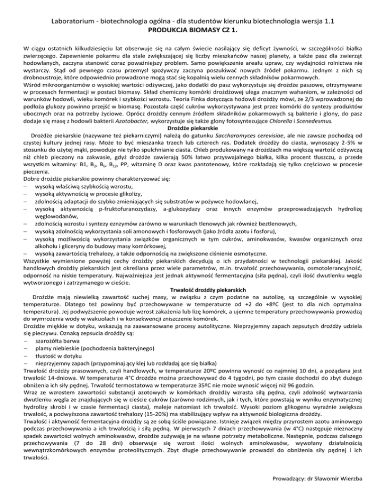 Laboratorium - biotechnologia ogólna - dla studentów kierunku biotechnologia wersja 1.1 PRODUKCJA BIOMASY CZ 1. W ciągu ostatnich kilkudziesięciu lat obserwuje się na całym świecie nasilający się deficyt żywności, w szczególności białka zwierzęcego. Zapewnienie pokarmu dla stale zwiększającej się liczby mieszkaoców naszej planety, a także pasz dla zwierząt hodowlanych, zaczyna stanowid coraz poważniejszy problem. Samo powiększenie areału upraw, czy wydajności rolnictwa nie wystarczy. Stąd od pewnego czasu przemysł spożywczy zaczyna poszukiwad nowych źródeł pokarmu. Jednym z nich są drobnoustroje, które odpowiednio prowadzone mogą stad się kopalnią wielu cennych składników pokarmowych. Wśród mikroorganizmów o wysokiej wartości odżywczej, jako dodatki do pasz wykorzystuje się drożdże paszowe, otrzymywane w procesach fermentacji w postaci biomasy. Skład chemiczny komórki drożdżowej ulega znacznym wahaniom, w zależności od warunków hodowli, wieku komórek i szybkości wzrostu. Teoria Finka dotycząca hodowli drożdży mówi, że 2/3 wprowadzonej do podłoża glukozy powinno przejśd w biomasę. Pozostała częśd cukrów wykorzystywana jest przez komórki do syntezy produktów ubocznych oraz na potrzeby życiowe. Oprócz drożdży cennym źródłem składników pokarmowych są bakterie i glony, do pasz dodaje się masę z hodowli bakterii Azotobacter, wykorzystuje się także glony fotosyntezujące Chlorella i Scenedesmus. Drożdże piekarskie Drożdże piekarskie (nazywane też piekarniczymi) należą do gatunku Saccharomyces cerevisiae, ale nie zawsze pochodzą od czystej kultury jednej rasy. Może to byd mieszanka trzech lub czterech ras. Dodatek drożdży do ciasta, wynoszący 2-5% w stosunku do użytej mąki, powoduje nie tylko spulchnianie ciasta. Chleb produkowany na drożdżach ma większą wartośd odżywczą niż chleb pieczony na zakwasie, gdyż drożdże zawierają 50% łatwo przyswajalnego białka, kilka procent tłuszczu, a przede wszystkim witaminy: B1, B2, B6, B12, PP, witaminę D oraz kwas pantotenowy, które rozkładają się tylko częściowo w procesie pieczenia. Dobre drożdże piekarskie powinny charakteryzowad się: wysoką właściwą szybkością wzrostu, wysoką aktywnością w procesie glikolizy, zdolnością adaptacji do szybko zmieniających się substratów w pożywce hodowlanej, wysoką aktywnością p-fruktofuranozydazy, a-glukozydazy oraz innych enzymów przeprowadzających hydrolizę węglowodanów, zdolnością wzrostu i syntezy eznzymów zarówno w warunkach tlenowych jak również beztlenowych, wysoką zdolnością wykorzystania soli amonowych i fosforowych (jako źródła azotu i fosforu), wysoką możliwością wykorzystania związków organicznych w tym cukrów, aminokwasów, kwasów organicznych oraz alkoholu i gliceryny do budowy masy komórkowej, wysoką zawartością trehalozy, a także odpornością na zwiększone ciśnienie osmotyczne. Wszystkie wymienione powyżej cechy drożdży piekarskich decydują o ich przydatności w technologii piekarskiej. Jakośd handlowych drożdży piekarskich jest określana przez wiele parametrów, m.in. trwałośd przechowywania, osmotolerancyjnośd, odpornośd na niskie temperatury. Najważniejsza jest jednak aktywnośd fermentacyjna (siła pędna), czyli ilośd dwutlenku węgla wytworzonego i zatrzymanego w cieście. Trwałośd drożdży piekarskich Drożdże mają niewielką zawartośd suchej masy, w związku z czym podatne na autolizę, są szczególnie w wysokiej temperaturze. Dlatego też powinny byd przechowywane w temperaturze od +2 do +8ºC (jest to dla nich optymalna temperatura). Jej podwyższenie powoduje wzrost zakażenia lub lizę komórek, a ujemne temperatury przechowywania prowadzą do wymrożenia wody w wakuolach i w konsekwencji zniszczenie komórek. Drożdże miękkie w dotyku, wskazują na zaawansowane procesy autolityczne. Nieprzyjemny zapach zepsutych drożdży udziela się pieczywu. Oznaką zepsucia drożdży są: szarożółta barwa plamy niebieskie (pochodzenia bakteryjnego) tłustośd w dotyku nieprzyjemny zapach (przypominaj ący klej lub rozkładaj ące się białka) Trwałośd drożdży prasowanych, czyli handlowych, w temperaturze 20ºC powinna wynosid co najmniej 10 dni, a pożądana jest trwałośd 14-dniowa. W temperaturze 4°C drożdże można przechowywad do 4 tygodni, po tym czasie dochodzi do zbyt dużego obniżenia ich siły pędnej. Trwałośd termostatowa w temperaturze 35ºC nie może wynosid więcej niż 96 godzin. Wraz ze wzrostem zawartości substancji azotowych w komórkach drożdży wzrasta siłą pędna, czyli zdolnośd wytwarzania dwutlenku węgla ze znajdujących się w cieście cukrów (zarówno rodzimych, jak i tych, które powstają w wyniku enzymatycznej hydrolizy skrobi i w czasie fermentacji ciasta), maleje natomiast ich trwałośd. Wysoki poziom glikogenu wyraźnie zwiększa trwałośd, a podwyższona zawartośd trehalozy (15-20%) ma stabilizujący wpływ na aktywnośd biologiczna drożdży. Trwałośd i aktywnośd fermentacyjna drożdży są ze sobą ściśle powiązane. Istnieje związek między przyrostem azotu aminowego podczas przechowywania a ich trwałością i siłą pędną. W pierwszych 7 dniach przechowywania (w 4°C) następuje nieznaczny spadek zawartości wolnych aminokwasów, drożdże zużywają je na własne potrzeby metaboliczne. Następnie, podczas dalszego przechowywania (7 do 28 dni) obserwuje się wzrost ilości wolnych aminokwasów, wywołany działalnością wewnątrzkomórkowych enzymów proteolitycznych. Zbyt długie przechowywanie prowadzi do obniżenia siły pędnej i ich trwałości. Prowadzący: dr Sławomir Wierzba Laboratorium - biotechnologia ogólna - dla studentów kierunku biotechnologia wersja 1.1 PRODUKCJA BIOMASY CZ 1. Na trwałośd i aktywnośd biomasy komórkowej drożdży wpływają też cechy genetyczne rasy użytego szczepu S. cerevisiae, szczególnie wzajemne sto