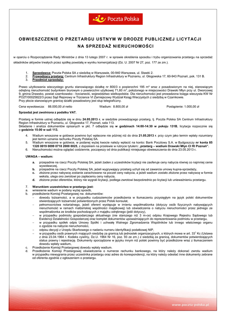 OBWIESZCZENIE O PRZETARGU USTNYM W DRODZE PUBLICZNEJ LI CYTACJI N A SPRZED AŻ NIERUCHOMOŚCI w oparciu o Rozporządzenie Rady Ministrów z dnia 13 lutego 2007 r. w sprawie określenia sposobu i trybu organizowania przetargu na sprzedaż składników aktywów trwałych przez spółkę powstałą w wyniku komercjalizacji (Dz. U. 2007 Nr 27, poz. 177 ze zm.). 1. 2. 3. Sprzedawca: Poczta Polska SA z siedzibą w Warszawie, 00-940 Warszawa, ul. Stawki 2. Prowadzący przetarg: Centrum Infrastruktury Region Infrastruktury w Poznaniu, ul. Głogowska 17, 60-943 Poznań, pok. 131 B. Przedmiot sprzedaży: Prawo użytkowania wieczystego gruntu stanowiącego działkę nr 800/3 o powierzchni 195 m² wraz z posadowionym na niej, stanowiącym odrębną nieruchomość budynkiem biurowym o powierzchni użytkowej 71,60 m2, położonego w miejscowości Drawski Młyn przy ul. Dworcowej 9, gmina Drawsko, powiat czarnkowsko - trzcianecki, województwo wielkopolskie. Dla nieruchomości jest prowadzona księga wieczysta KW Nr PO2T/00025822/3 przez Sąd Rejonowy w Trzciance VI Zamiejscowy Wydział Ksiąg Wieczystych z siedzibą w Czarnkowie. Przy płocie stanowiącym granicę działki posadowiony jest słup telegraficzny. Cena wywoławcza: 88.000,00 zł netto Wadium: 8.800,00 zł Postąpienie: 1.000,00 zł Sprzedaż jest zwolniona z podatku VAT. Przetarg w formie ustnej odbędzie się w dniu 24.05.2013 r. w siedzibie prowadzącego przetarg, tj. Poczta Polska SA Centrum Infrastruktury Region Infrastruktury w Poznaniu, ul. Głogowska 17, Poznań, sala 113. Składanie i analiza dokumentów opisanych w pkt. 7 odbędzie się w godzinach 14:00-14:30 w pokoju 131B, licytacja rozpocznie się o godzinie 15:00 w sali 113. 4. 5. 6. Wadium wnoszone w gotówce powinno być wpłacone nie później niż do dnia 21.05.2013 r. przy czym jako termin wpłaty rozumiany jest termin uznania rachunku Poczty Polskiej SA. Wadium wnoszone w gotówce, w podanej wyżej kwocie należy wpłacić na konto: Bank Pocztowy S.A. w Bydgoszczy nr konta 85 1320 0019 0099 0718 2000 0025, z dopiskiem na przelewie w rubryce tytułem: „przetarg – wadium Drawski Młyn CI RI Poznań”. Nieruchomości można oglądać codziennie, począwszy od dnia publikacji niniejszego obwieszczenia do dnia 23.05.2013 r. UWAGA – wadium: a. b. c. d. 7. a. b. c. d. przepadnie na rzecz Poczty Polskiej SA, jeżeli żaden z uczestników licytacji nie zaoferuje ceny nabycia równej co najmniej cenie wywoławczej, przepadnie na rzecz Poczty Polskiej SA, jeżeli wygrywający przetarg uchyli się od zawarcia umowy kupna-sprzedaży, złożone przez nabywcę zostanie zarachowane na poczet ceny nabycia, a jeżeli wadium zostało złożone przez nabywcę w formie weksla, ulega ono zwrotowi po zapłaceniu ceny nabycia, złożone przez oferentów, którzy nie wygrali licytacji, podlega zwrotowi bezpośrednio po licytacji lub unieważnieniu przetargu. Warunkiem uczestnictwa w przetargu jest: wniesienie wadium w podany wyżej sposób, przedłożenie Komisji Przetargowej nw. dokumentów: − dowodu tożsamości, a w przypadku cudzoziemców przedłożenia w tłumaczeniu przysięgłym na język polski dokumentów stwierdzających tożsamość potwierdzonych przez Polski konsulat, − pełnomocnictwa notarialnego, jeżeli oferent występuje w imieniu współmałżonka (dotyczy osób fizycznych nabywających nieruchomość w ramach małżeńskiej wspólności majątkowej) lub oświadczenia o nabyciu nieruchomości przez jednego ze współmałżonka ze środków pochodzących z majątku odrębnego (jeśli dotyczy), − w przypadku podmiotu gospodarczego aktualnego (nie starszego niż 3 m-ce) odpisu Krajowego Rejestru Sądowego lub Ewidencji Działalności Gospodarczej oraz komplet dokumentów upoważniających do reprezentowania podmiotu w przetargu, − w przypadku spółek odpis Umowy Spółki i uchwałę Walnego Zgromadzenia Wspólników lub innego właściwego organu o zgodzie na nabycie nieruchomości, − odpisu decyzji z Urzędu Skarbowego o nadaniu numeru identyfikacji podatkowej NIP, − w przypadku osób prawnych mających siedzibę za granicą lub jednostek organizacyjnych, o których mowa w art. 331 Kc (Ustawa z dnia 23.04.1964 r. Kodeks cywilny, Dz.U. 1964 Nr 16, poz. 93 ze zm.) z siedzibą za granicą, dokumentów potwierdzających status prawny i rejestrację. Dokumenty sporządzone w języku innym niż polski powinny być przedłożone wraz z tłumaczeniem dowodu wpłaty wadium, Przedłożenie Komisji Przetargowej dowodu wpłaty wadium. Przedłożenie Komisji Przetargowej oświadczenia o numerze rachunku bankowego, na który należy dokonać zwrotu wadium w przypadku niewygrania przez uczestnika przetargu oraz adres do korespondencji, na który należy odesłać inne dokumenty zebrane od oferenta zgodnie z ogłoszeniem o przetargu. 8. 9. 10. 11. 12. 13. 14. Do przeprowadzenia przetargu wystarczy uczestnictwo jednego licytanta. Nabywca, pod rygorem utraty wadium i utraty prawa wynikającego z przybicia, jest obowiązany zapłacić cenę nabycia jednorazowo nie później niż na dzień roboczy przed podpisaniem umowy sprzedaży, przy czym jako termin wpłaty rozumiany jest termin uznania rachunku Poczty Polskiej SA. Kancelarię Notarialną oraz datę zawarcia umowy wskaże Nabywcy prowadzący przetarg, pod rygorem, że nie zastosowanie się Kupującego do tych wskazań oznaczać będzie uchylenie się od zawarcia umowy. Poza ceną nabycia wygrywający przetarg ponosi koszty: sporządzenia aktu notarialnego, sporządzenia ostatniego operatu szacunkowego (w kwocie 894,31 zł), na podstawie którego ogłoszono przetarg, pozyskania wypisu i wyrysu z ewidencji gruntów i budynków (w kwocie 150,00 zł) oraz sporządzenia świadectwa energetycznego poniesiony w związku z wnioskiem Nabywcy o sporządzenie takiego świadectwa. Nabywca uiści Sprzedającemu opłatę za użytkowanie wieczyste gruntu w wysokości proporcjonalnej do liczonego w dniach okresu użytkowania tego gruntu w