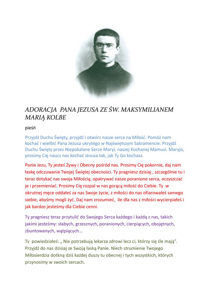 ADORACJA PANA JEZUSA ZE ŚW. MAKSYMILIANEM MARIĄ KOLBE pieśń Przyjdź Duchu Święty, przyjdź i otwórz nasze serca na Miłość. Pomóż nam kochać i wielbić Pana Jezusa ukrytego w Najświętszym Sakramencie. Przyjdź Duchu Święty przez Niepokalane Serce Maryi, naszej Kochanej Mamusi. Maryjo, prosimy Cię naucz nas kochać Jezusa tak, jak Ty Go kochasz. Panie Jezu, Ty jesteś Żywy i Obecny pośród nas. Prosimy Cię pokornie, daj nam łaskę odczuwania Twojej Świętej obecności. Ty pragniesz dzisiaj , szczególnie tu i teraz dotykać nas swoja Miłością, opatrywać nasze poranione serca, oczyszczać je i przemieniać. Prosimy Cię rozpal w nas gorącą miłość do Ciebie. Ty w okrutnej męce oddałeś za nas Swoje życie, z miłości do nas ofiarowałeś samego siebie, abyśmy mogli żyć. Daj nam zrozumieć, ile dla nas z miłości wycierpiałeś i jak bardzo jesteśmy dla Ciebie cenni. Ty pragniesz teraz przytulić do Swojego Serca każdego i każdą z nas, takich jakimi jesteśmy: słabych, grzesznych, poranionych, cierpiących, obojętnych, zbuntowanych, wątpiących… Ty powiedziałeś: „ Nie potrzebują lekarza zdrowi lecz ci, którzy się źle mają”. Przyjdź do nas dzisiaj ze Swoją łaską Panie. Niech strumienie Twojego Miłosierdzia dotkną dziś każdej duszy tu obecnej i tych wszystkich, których przynosimy w swoich sercach. Święty Maksymilianie, patronie tego spotkania, Ty który szczególnie umiłowałeś Maryję, przez Niepokalaną i w niej ukochałeś Jezusa, prosimy Cię bądź obecny wśród nas w czasie tej Adoracji i wypraszaj nam u Maryj łaskę wielkiej miłości do Boga. Pieśń: Maksymilian urodził się w Zduńskiej Woli 8 października 1894 roku. Na chrzcie otrzymał imię Rajmund. Jego rodzice, choć ubodzy w dobra materialne, byli jednak bogaci w dobra duchowe. Od wczesnych lat rodzice rozbudzili w nim szczególną miłość do Najświętszej Maryi Panny, połączoną z miłością do ojczyzny. Ojciec chętnie czytał swoim synom patriotyczne książki. Chłopcy często bawili się w rycerzy i rysowali na płotach polskie orły. Umiłowanie Matki Bożej i wola rycerskiej walki zaowocowały później założeniem ruchu Rycerstwa Niepokalanej. Święty Maksymilianie, ty który ukochałeś Maryję szczególna miłością, prosimy cię wyproś nam taką miłość do Niej, naucz nas, jak całkowicie oddać się i zawierzyć Maryi. Gdy miał 12 lat, podczas modlitwy w kościele ukazała mu się Najświętsza Maryja Panna. Wydarzenie to Rajmund tak przedstawił swojej matce: Prosiłem Matkę Bożą, żeby mi powiedziała co ze mnie będzie… Wtedy Matka Boża pokazała mi się, trzymając dwie korony, jedną białą, a drugą czerwoną. Spytała czy chcę tych koron: biała miała oznaczać, że wytrwam w czystości, a czerwona, że będę męczennikiem. Odpowiedziałem, że chcę. Wówczas Matka Boża mile na mnie spojrzała i znikła. Święty Maksymilianie Ty wybrałeś czystość i męczeństwo dla Chrystusa. Czy mnie stać na taki wybór? Czy chce wytrwać w czystości dla Jezusa? Czy chcę kochać Jezusa tak, aby pragnąć cierpieć dla Niego, umierać dla Niego? Jezu, pragnę kochać Cię tak jak święty Maksymilian, pragnę aby świadomość Twojej nieskończonej Miłości do mnie usuwała z mojego serca wszelki lęk przed cierpieniem i śmiercią. Rajmund wraz ze swoim starszym bratem Franciszkiem wstąpili do małego seminarium franciszkanów konwentualnych we Lwowie. W trzy lata później dołączył do nich najmłodszy brat Józef.4 września 1910 roku, w wieku niespełna 17 lat, Rajmund wstąpił do Zakonu Braci Mniejszych Konwentualnych i rozpoczął nowicjat we Lwowie pod imieniem Maksymilian. Pieśń: Będąc w niższym seminarium we Lwowie, czuł się wewnętrznie rozdarty, nie wiedział, po której stanąć stronie- po stronie Boga czy Ojczyzny, walczyć o jej wolność z bronią w ręku czy dla Niepokalanej o chwałę Bożą? Zwyciężył Bóg i Jego zwycięstwo było decydujące. Nigdy później nie zwątpił w słuszność tego wyboru. Nie oglądał się wstecz, dążąc wytrwale do wyznaczonej mety. W decydującej chwili, kiedy ważyły się losy jego pozostania czy opuszczenia zakonu, z pomocą przyszła mu matka, utwierdzając w nim wcześniejszy wybór. Kiedy zabrakło jej, znalazł nowe, mocniejsze wsparcie – Niepokalaną i pod Jej sztandarem postanowił zdobyć świat dla Chrystusa. Jej zawierzył swoje studia seminaryjne i Ją wybrał na duchową Matkę swojego kapłaństwa. W katedrze lwowskiej przed cudownym obrazem Matki Bożej Łaskawej Maksymilian poświęcił się Niepokalanej. W swoich pamiętnikach napisał: Z twarzą pochyloną ku ziemi obiecałem Najświętszej Maryi Pannie, królującej na ołtarzu, że będę walczył dla Niej. Jak? – nie wiedziałem, ale wyobrażałem sobie walkę orężem materialnym. Maryjo, nasza Kochana Mamusiu, zawierzamy Tobie naszą drogę życia, nasze plany, nasze pragnienia, nasze marzenia. Ufamy, że Ty wiesz najlepiej, co jest dla nas dobre i co miłe Bogu. Ufamy Tobie Maryjo! Prosimy Cię święty Maksymilianie, wyproś nam taką wolę walki dla Niepokalanej, jaką Ty miałeś, daj nam Twoją gorliwość i pomysłowość w dziele ewangelizacji świata przez Niepokalaną. Pieśń: W roku 1912 przełożeni wysłali go na dalsze studia do Krakowa. Stąd ze względu na jego niezwykłe zdolności, skierowano go do Rzymu. Studia filozoficzne jak i teologiczne uwieńczył dwoma doktoratami. Wykazywał również wybitne uzdolnienia matematyczno – fizyczne. Po złożeniu ślubów wieczystych w 1914 roku przybrał sobie drugie imię Maria. 4 lata później przyjął również święcenia kapłańskie. Od wczesnych lat kapłańskich był chory. Nosił w sobie gruźlicę, nie miał płuca. Chorobę jednak uważał za środek apostolstwa. Często powtarzał, że stanowi ona jeden z najważniejszych „działów” życia zakonnego. Świadomym przeżywaniem cierpienia można najw