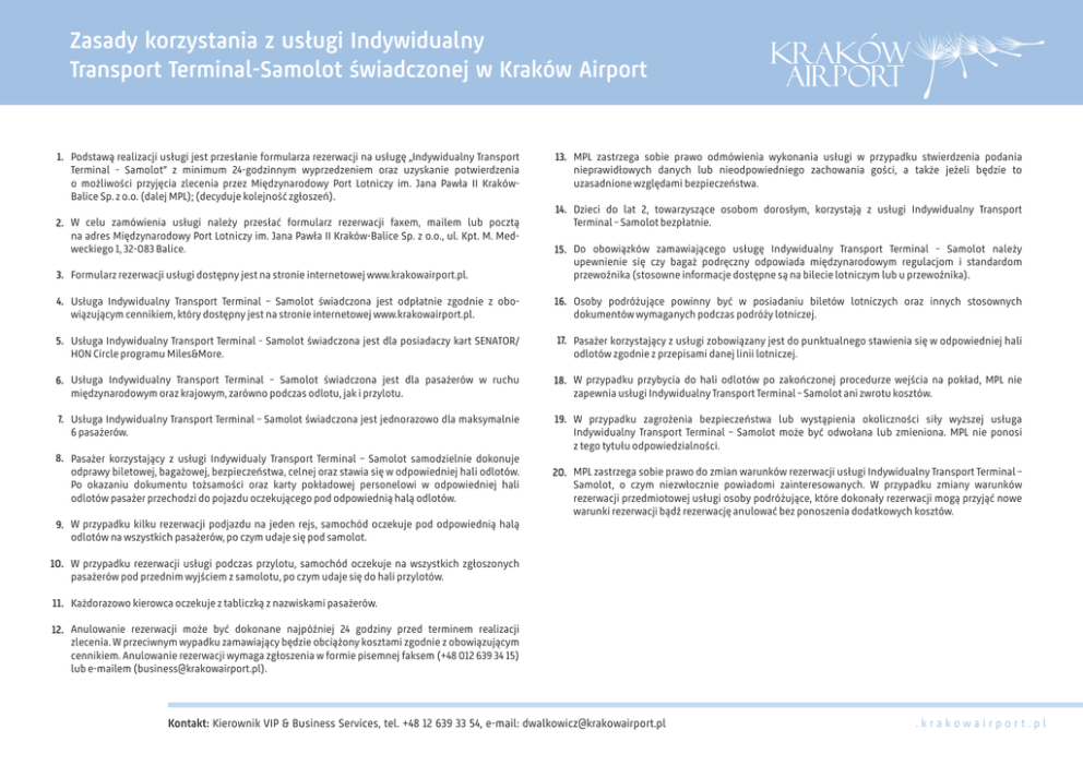 Zasady korzystania z usługi Indywidualny Transport Terminal-Samolot świadczonej w Kraków Airport 1. Podstawą realizacji usługi jest przesłanie formularza rezerwacji na usługę „Indywidualny Transport Terminal - Samolot” z minimum 24-godzinnym wyprzedzeniem oraz uzyskanie potwierdzenia o możliwości przyjęcia zlecenia przez Międzynarodowy Port Lotniczy im. Jana Pawła II KrakówBalice Sp. z o.o. (dalej MPL); (decyduje kolejność zgłoszeń). 2. W celu zamówienia usługi należy przesłać formularz rezerwacji faxem, mailem lub pocztą na adres Międzynarodowy Port Lotniczy im. Jana Pawła II Kraków-Balice Sp. z o.o., ul. Kpt. M. Medweckiego 1, 32-083 Balice. 13. MPL zastrzega sobie prawo odmówienia wykonania usługi w przypadku stwierdzenia podania nieprawidłowych danych lub nieodpowiedniego zachowania gości, a także jeżeli będzie to uzasadnione względami bezpieczeństwa. 14. Dzieci do lat 2, towarzyszące osobom dorosłym, korzystają z usługi Indywidualny Transport Terminal – Samolot bezpłatnie. 3. Formularz rezerwacji usługi dostępny jest na stronie internetowej www.krakowairport.pl. 15. Do obowiązków zamawiającego usługę Indywidualny Transport Terminal – Samolot należy upewnienie się czy bagaż podręczny odpowiada międzynarodowym regulacjom i standardom przewoźnika (stosowne informacje dostępne są na bilecie lotniczym lub u przewoźnika). 4. Usługa Indywidualny Transport Terminal – Samolot świadczona jest odpłatnie zgodnie z obowiązującym cennikiem, który dostępny jest na stronie internetowej www.krakowairport.pl. 16. Osoby podróżujące powinny być w posiadaniu biletów lotniczych oraz innych stosownych dokumentów wymaganych podczas podróży lotniczej. 5. Usługa Indywidualny Transport Terminal - Samolot świadczona jest dla posiadaczy kart SENATOR/ HON Circle programu Miles&More. 17. Pasażer korzystający z usługi zobowiązany jest do punktualnego stawienia się w odpowiedniej hali odlotów zgodnie z przepisami danej linii lotniczej. 6. Usługa Indywidualny Transport Terminal – Samolot świadczona jest dla pasażerów w ruchu międzynarodowym oraz krajowym, zarówno podczas odlotu, jak i przylotu. 18. W przypadku przybycia do hali odlotów po zakończonej procedurze wejścia na pokład, MPL nie zapewnia usługi Indywidualny Transport Terminal – Samolot ani zwrotu kosztów. 7. Usługa Indywidualny Transport Terminal – Samolot świadczona jest jednorazowo dla maksymalnie 6 pasażerów. 19. W przypadku zagrożenia bezpieczeństwa lub wystąpienia okoliczności siły wyższej usługa Indywidualny Transport Terminal – Samolot może być odwołana lub zmieniona. MPL nie ponosi z tego tytułu odpowiedzialności. 8. Pasażer korzystający z usługi Indywidualy Transport Terminal – Samolot samodzielnie dokonuje odprawy biletowej, bagażowej, bezpieczeństwa, celnej oraz stawia się w odpowiedniej hali odlotów. Po okazaniu dokumentu tożsamości oraz karty pokładowej personelowi w odpowiedniej hali odlotów pasażer przechodzi do pojazdu oczekującego pod odpowiednią halą odlotów. 20. MPL zastrzega sobie prawo do zmian warunków rezerwacji usługi Indywidualny Transport Terminal – Samolot, o czym niezwłocznie powiadomi zainteresowanych. W przypadku zmiany warunków rezerwacji przedmiotowej usługi osoby podróżujące, które dokonały rezerwacji mogą przyjąć nowe warunki rezerwacji bądź rezerwację anulować bez ponoszenia dodatkowych kosztów. 9. W przypadku kilku rezerwacji podjazdu na jeden rejs, samochód oczekuje pod odpowiednią halą odlotów na wszystkich pasażerów, po czym udaje się pod samolot. 10. W przypadku rezerwacji usługi podczas przylotu, samochód oczekuje na wszystkich zgłoszonych pasażerów pod przednim wyjściem z samolotu, po czym udaje się do hali przylotów. 11. Każdorazowo kierowca oczekuje z tabliczką z nazwiskami pasażerów. 12. Anulowanie rezerwacji może być dokonane najpóźniej 24 godziny przed terminem realizacji zlecenia. W przeciwnym wypadku zamawiający będzie obciążony kosztami zgodnie z obowiązującym cennikiem. Anulowanie rezerwacji wymaga zgłoszenia w formie pisemnej faksem (+48 012 639 34 15) lub e-mailem ([email protected]). Kontakt: Kierownik VIP & Business Services, tel. +48 12 639 33 54, e-mail: [email protected] .krakowairport.pl