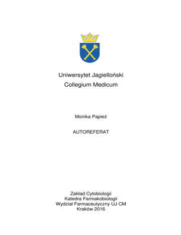 Uniwersytet Jagielloński Collegium Medicum Monika Papież AUTOREFERAT Zakład Cytobiologii Katedra Farmakobiologii Wydział Farmaceutyczny UJ CM Kraków 2016 SPIS TREŚCI 1. Posiadane dyplomy, stopnie naukowe……………………………………………….....3 2. Informacje o dotychczasowym zatrudnieniu w jednostkach naukowych………..….3 3. Wskazanie osiągnięcia wynikającego z art. 16 ust. 2 ustawy z dnia 14 marca 2003 r. o stopniach naukowych i tytule naukowym oraz o stopniach i tytule w zakresie sztuki (Dz. U. nr 65, poz. 595 ze zm.)……………………………………..…4 3.1. Wykaz publikacji stanowiących podstawę habilitacji……….……………………..….....4 3.2. Omówienie celu naukowego ww. prac i osiągniętych wyników wraz z omówieniem ich ewentualnego wykorzystania…………………………………………. ……………..….5 3.2.1. Wprowadzenie………………………………………………………………………...5 3.2.1.1. Polifenole jako związki modulujące działanie cytostatyków w komórkach białaczkowych ………..........................................................................................................…6 3.2.1.2. Cytogenotoksyczne działanie etopozydu na komórki białaczkowe i prawidłowe komórki mieloidalne………………………………………………………………………………...….7 3.2.1.3 Kurkumina i (–)-epikatechina jako potencjalne związki modyfikujące cytogenotoksyczne działanie etopozydu……………………………………………………..…….……………...9 3.2.2. Cel badań stanowiących podstawę habilitacji……………………………………….…10 3.2.3. Omówienie wyników badań stanowiących podstawę pracy habilitacyjnej…………...11 3.2.4. Podsumowanie wyników badań stanowiących podstawę pracy habilitacyjnej oraz ich ewentualne wykorzystanie…………………………………………………………………....26 4. Omówienie pozostałych osiągnięć naukowo – badawczych……………………...….28 4.1. Badania przed doktoratem………………………………………………………………28 4.2. Badania po doktoracie……………………………………………………………….….30 5. Plany dotyczące badań………………………………………………………………...34 6. Piśmiennictwo……………………………………………………………………….....34 7. Analiza bibliometryczna dorobku naukowego……………………………………....40 8. Kierowanie i udział w projektach badawczych………………………………….…..41 9. Udział w konferencjach…………………………………………………………….….42 10. Nagrody, wyróżnienia……………………………………………………………..…..42 11. Członkostwo w towarzystwach naukowych…………………………………………42 12. Członkostwo w radach redakcyjnych czasopism naukowych……………………....42 13. Recenzje prac…………………………………………………………………………..42 2 1. Posiadane dyplomy, stopnie naukowe. 1992: magister biologii, Wydział Biologii i Nauk o Ziemi, Uniwersytet Jagielloński, Kraków 2002: doktor nauk farmaceutycznych, Wydział Farmaceutyczny, Collegium Medicum UJ, Kraków, tytuł pracy: Wpływ składników wyciągu z kwiatów malwy czarnej (Flos Malvae Arboreae) na obraz histoenzymatyczny i morfologiczny tarczycy i gonady męskiej szczura. 2. Informacje o dotychczasowym zatrudnieniu w jednostkach naukowych. 1993 – pracownik inżynieryjno-techniczny, Zakład Farmakokinetyki i Metabolizmu Leków, Instytut Farmakologii, PAN, Kraków 1993 – 1995: asystent, Zakład Wirusologii, Instytut Mikrobiologii, Collegium Medicum, UJ, Kraków 1995 – 2009: pracownik naukowo-techniczny, asystent, adiunkt, Zakład Cytobiologii i Histochemii, Wydział Farmaceutyczny, Collegium Medicum UJ, Kraków 2010 – obecnie: adiunkt, starszy wykładowca; Zakład Cytobiologii (pierwotna nazwa Zakład Cytobiologii i Histochemii), Wydział Farmaceutyczny, Collegium Medicum UJ, Kraków 3 3. Wskazanie osiągnięcia wynikającego z art. 16 ust. 2 ustawy z dnia 14 marca 2003 r. o stopniach naukowych i tytule naukowym oraz o stopniach i tytule w zakresie sztuki (Dz. U. nr 65, poz. 595 ze zm.): Podstawą pracy habilitacyjnej zatytułowanej „Modulujący wpływ wybranych polifenoli na przeciwbiałaczkowe działanie etopozydu i na jego cytogenotoksyczną aktywność w komórkach prawidłowych” jest monotematyczny cykl 6 publikacji o łącznym IF wynoszącym 12.5 (141 pkt. MNiSW). We wszystkich publikacjach stanowiących postawę habilitacji jestem pierwszym autorem oraz autorem korespondencyjnym. 3.1. Wykaz publikacji stanowiących podstawę habilitacji P1. Papież MA, Dybała M, Sowa-Kućma M, Krzyściak W, Taha H, Józkowicz A, Nowak G. (2009) Evaluation of oxidative status and depression-like responses in Brown Norway rats with acute myeloid leukemia. Progress in Neuro-Psychopharmacology & Biological Psychiatry 33 (4): 596–604. IF = 2.823, 24 pkt. P2. Papież MA, Baran J, Bukowska-Straková K, Wiczkowski W. (2010) Antileukemic action of (–)-epicatechin in the spleen of rats with acute myeloid leukemia. Food and Chemical Toxicology 48 (12): 3391-3397. IF = 2.602, 32 pkt. P3. Papież MA, Baran J, Bukowska-Straková K, Krośniak M. (2011) Epicatechin administration leads to necrotic cell death of rat leukemia promyelocytes in vivo. In Vivo 25 (1): 29-34. IF = 1.264, 20 pkt. P4. Papież MA, Bukowska-Straková K, Krzyściak W, Baran J. (2012) (–)-Epicatechin enhances the etoposide-induced antileukaemic effect in rats with acute myeloid leukaemia. Anticancer Research 32 (7): 2905-2914. IF = 1.713, 20 pkt. P5. Papież MA. (2013) The influence of curcumin and (–)-epicatechin on the genotoxicity 