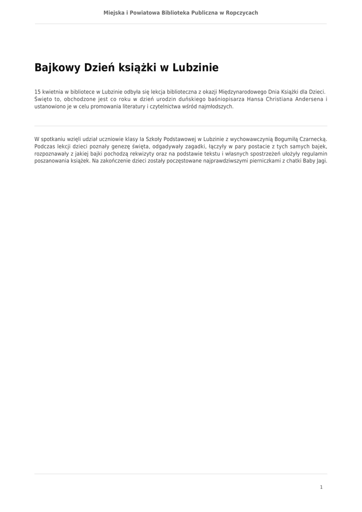 Miejska i Powiatowa Biblioteka Publiczna w Ropczycach Bajkowy Dzień książki w Lubzinie 15 kwietnia w bibliotece w Lubzinie odbyła się lekcja biblioteczna z okazji Międzynarodowego Dnia Książki dla Dzieci. Święto to, obchodzone jest co roku w dzień urodzin duńskiego baśniopisarza Hansa Christiana Andersena i ustanowiono je w celu promowania literatury i czytelnictwa wśród najmłodszych. W spotkaniu wzięli udział uczniowie klasy Ia Szkoły Podstawowej w Lubzinie z wychowawczynią Bogumiłą Czarnecką. Podczas lekcji dzieci poznały genezę święta, odgadywały zagadki, łączyły w pary postacie z tych samych bajek, rozpoznawały z jakiej bajki pochodzą rekwizyty oraz na podstawie tekstu i własnych spostrzeżeń ułożyły regulamin poszanowania książek. Na zakończenie dzieci zostały poczęstowane najprawdziwszymi pierniczkami z chatki Baby Jagi. 1