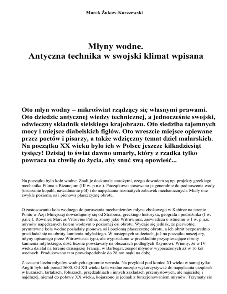 Marek Żukow-Karczewski Młyny wodne. Antyczna technika w swojski klimat wpisana Oto młyn wodny – mikroświat rządzący się własnymi prawami. Oto dziedzic antycznej wiedzy technicznej, a jednocześnie swojski, odwieczny składnik sielskiego krajobrazu. Oto siedziba tajemnych mocy i miejsce diabelskich figlów. Oto wreszcie miejsce opiewane przez poetów i pisarzy, a także wdzięczny temat dzieł malarskich. Na początku XX wieku było ich w Polsce jeszcze kilkadziesiąt tysięcy! Dzisiaj to świat dawno umarły, który z rzadka tylko powraca na chwilę do życia, aby snuć swą opowieść... Na początku było koło wodne. Znali je doskonale starożytni, czego dowodem są np. projekty greckiego mechanika Filona z Bizancjum (III w. p.n.e.). Początkowo stosowano je generalnie do podnoszenia wody (osuszanie kopalń, nawadnianie pól) i do napędzania rozmaitych zabawek mechanicznych. Miały one zwykle poziomą oś i pionową płaszczyznę obrotu. O zastosowaniu koła wodnego do poruszania mechanizmów młyna zbożowego w Kabirze na terenie Pontu w Azji Mniejszej dowiadujemy się od Strabona, greckiego historyka, geografa i podróżnika (I w. p.n.e.). Również Marcus Vitruvius Pollio, znany jako Witruwiusz, zaświadcza o istnieniu w I w. p.n.e. młynów napędzanych kołem wodnym o poziomej osi obrotu. Wydaje się jednak, że pierwotne, prymitywne koła wodne posiadały pionową oś i poziomą płaszczyznę obrotu, a ich obrót bezposrednio przekładał się na obroty kamienia młyńskiego. W następnych stuleciach, już na początku naszej ery, młyny opisanego przez Witruwiusza typu, ale wyposażone w przekładnie przyspieszające obroty kamienia młyńskiego, dość licznie powstawały na obszarach podległych Rzymowi. Wiemy, że w IV wieku działał na terenie dzisiejszej Francji, w Barbegal, zespół młynów wyposażonych aż w 16 kół wodnych. Produkowano tam prawdopodobnie do 28 ton mąki na dobę. Z czasem liczba młynów wodnych ogromnie wzrosła. Na przykład pod koniec XI wieku w samej tylko Anglii było ich ponad 5600. Od XII wieku koła wodne zaczęto wykorzystywać do napędzania urządzeń w kuźniach, tartakach, foluszach, przędzalniach i innych zakładach przemysłowych, ale najściślej i najdłużej, niemal do połowy XX wieku, kojarzono je jednak z funkcjonowaniem młynów. Trzymały się zatem dzielnie przez dwa tysiące lat, mimo że już w XIX wieku były stopniowo wypierane przez maszyny parowe, a później przez silniki spalinowe i elektryczne. Rozróżniamy trzy podstawowe rodzaje kół wodnych o poziomej osi obrotu, które były stosowane w dawnych młynach wodnych. Najmniej wysiłku przy instalacji wymagało koło podsiębierne (łopatkowe), zwane walnym, używane zwykle na terenach płaskich. Posiadało ono na obwodzie łopatki. Dolną część koła zanurzano w przepływającej wodzie, aby jej nacisk na łopatki powodował jego obrót. Tego typu koła były największe, a ich sprawność (procent przetworzenia energii wody na pracę) wynosiła zaledwie 2230 proc. Jego pracy zagrozić mogły przepływające gałęzie i konary drzew, a prędkość obrotu zależała od siły nurtu oraz wahań poziomu wody w rzece lub strumieniu. Z problemami tymi radzono sobie poprzez częściową regulację cieku wodnego w rejonie młyna, a więc umacnianie brzegów, pogłębianie koryta i przesuwanie głównego nurtu. W miastach, dużych wsiach i majątkach ziemskich przekopywano tzw. młynówki, czyli sztuczne odnogi rzek, w których starano się utrzymywać stały poziom i przepływ wody. Stosowano też dobór odpowiednich przełożeń (przekładni) w samym młynie. Nieco mniejsze bywały napędzane „od góry” koła nasiębierne (korytkowe), czyli korzeczne, posiadające na obwodzie korytka, które napełniał strumień spadającej wody. Pod jej ciężarem i w wyniku siły uderzenia następował obrót koła. Pojawiło się w V wieku w Atenach. Jego sprawność wynosiła aż 63- 70 proc., ale prawidłowe funkcjonowanie tego drugiego typu koła wodnego wymagało już poważniejszych prac z zakresu inżynierii wodnej. Niezbędne tu było zróżnicowane poziomo ukształtowanie terenu w okolicach młyna. Przede wszystkim należało zapewnić ciągły dopływ na koło strumienia wody o określonej prędkości. W tym celu spiętrzano wodę w tzw. stawie górnym, zakładanym powyżej młyna. Stały poziom lustra wody w tym stawie utrzymywało tzw. stawidło (jaz zastawkowy), czyli przesuwane w pionowych prowadnicach zastawy na śluzie, które podnoszono lub opuszczano za pomocą mechanizmu łańcuchowego lub poruszanej korbą przekładni zębatej. Zazwyczaj istniał też odprowadzający nadmiar wody kanał odpływowy (burzowy, ulgowy). Woda ze stawu górnego spływała na koło kanałem roboczym, który niekiedy przybierał postać drewnianego koryta o niewielkim spadku, wspartego na słupach wbitych w podłoże. Po wykonaniu pracy, tj. po obróceniu koła, woda spływała do zbiornika usytuowanego nieco poniżej budynku młyna, czyli do tzw. stawu dolnego, a stamtąd płynęła sobie do cieku głównego (rzeki lub strumienia), albo zaopatrywała rybne stawy hodowlane. Najrzadziej spotykanym kołem wodnym było koło śródsiębierne, które do połowy zanurzano w nurcie rzeki, zwiększając powierzchnię nacisku. Dzięki temu starano się maksymalnie spożytkować energię potencjalną i kinetyczną wody. Wprowadził je do użytku John Smeaton, angielski inżynier budowlany i konstruktor maszyn. Młyny wyposażone w tego typu koła zaczęto budować w połowie XVIII wieku. Sprawność koła śródsiębiernego dochodziła nawet do 80 proc. Stało się ono pierwowzorem turbiny wodnej, rozpowszechnionej w wieku XIX. Jej konstruktorem był Benoit Fourneyron, francuski inżynier mechanik, który swoją turbinę reakcyjną uruchomił w roku 1827. Turbina, w następnych dziesięcioleciach wielokrotnie modyfikowana, rozwiązała problemy z kołem wodnym, zapewniając większ