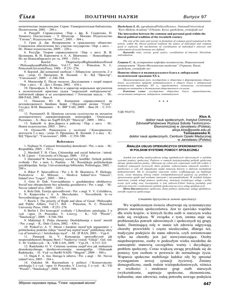 Гілея ПОЛІТИЧНІ НАУКИ Випуск 97 IIIIIIIIIIIIIIIIIIIIIIIIIIIIIIIIIIIIIIIIIIIIIIIIIIIIIIIIIIIIIIIIIIIIIIIIIIIIIIIIIIIIIIIIIIIIIIIIIIIIIIIIIIIIIIIIIIIIIIIIIIIIIIIIIIIIIIIIIIIIIIIIIIIIIIIIIIIIIIIIIIIIIIIIIIIIIIIIIIIIIIIIIIIIIIIIIIIIIIIIIIIIIIIIIIIIIIIIIIIIIIIIIIIIIIIIIIIIIIIIIIIIIIIIIIIIIIIIIIIIIIIIIIIIIIIIIIIIIIIIII политическая энциклопедия. Серия: Университетская библиотека. Политология, 2002. – 288 с. 4. РикерП. Справедливое / Пер с фр. Б. Скуратова, П. Хицкого. Послесловие – Э. Шлоссер. – Москва: Издательство “Гнозис”, Издательство “Логос”, 2005. – 304 с. 5. Грин Д. Дж. Возвращение в гражданское общество: Социальное обеспечение без участия государства / Пер. с англ. – М.: Новое издательство, 2009. – 220 с. 6. РолзДж. Теория справедливости / Пер. с англ. В. В. Целищева, В. Н. Карповича и А. А. Шевченко. – Новосибирск: Из–во Новосибирского ун–та, 1995. – 510 с. 7. RawlsJ. ThepriorityofRightandideasofGood / PhilosophyandPublicAffairs. Vol.17, №4. – Princeton, N. J.: PrincetonUniversityPress, 1988. – Р.251–276. 8. БерлінІ. Дві концепції свободи // Лібералізм: антологія, 2–е вид. / упор. О. Проценко, В. Лісовий. – К.: ВД “Простір”, “Смолоскип”, 2009. – С.546–584. 9. Макінтайр Е. Після чесноти: Дослідження з теорії моралі / Пер. з англ. – К.: Дух і Літера, 2002. – 436 с. 10. Прокофьев А. В. Место и характер моральных аргументов в политической практике (идея “моральной нейтральности” публичной сферы и ее альтернативы) // Этическая мысль. – М.: ИФ РАН, 2003. – Вып.4. 11. Панасюк Ю. В. Концепція справедливості як неупередженості Брайана Беррі // Науковий вісник “Гілея”. Гол.ред. В.М. Вашкевич. – К.: ВІР УАН, 2009. – Вип.28. – С.315– 322. 12. РадченкоО. В. Ціннісна система суспільства як механізм демократичного державотворення: монографія / Олександр Радченко. – Х.: Вид–во ХарРІ НАДУ “Магістр”, 2009. – 380 с. 13. ХайекФ. А. фон.Дорога к рабству / Пер. с англ. – М.: Новое издательство, 2005. – 264 с. 14. ОукшотМ. Раціоналізм у політиці // Консерватизм: антологія 2–е вид. / упор. О. Проценко, В. Лісовий. 2–е вид. – К.: ВД “Простір”, “Смолоскип”, 2008. – С.554–580. References 1. Nojhauz N. Cennosti hristianskoj demokratii / Per. s nem. – M.: Respublika, 2005. – 192 s. 2. Marshall T. H. Class, Citizenship and social behavior / introd. S. M. Lipset. – University of Chicago, 2000. – 335 p. 3. Darendorf R. Sovremennyj social’nyj konflikt. Ocherk politiki svobody / Per. s nem. L. Pantina. – M.: Rossijskaja politicheskaja jenciklopedija. Serija: Universitetskaja biblioteka. Politologija, 2002. – 288 s. 4. Riker P. Spravedlivoe / Per s fr. B. Skuratova, P. Hickogo. Posleslovie – Je. Shlosser. – Moskva: Izdatel’stvo “Gnozis”, Izdatel’stvo “Logos”, 2005. – 304 s. 5. Grin D. Dzh. Vozvrashhenie v grazhdanskoe obshhestvo: Social’noe obespechenie bez uchastija gosudarstva / Per. s angl. – M.: Novoe izdatel’stvo, 2009. – 220 s. 6. Rolz Dzh. Teorija spravedlivosti / Per. s angl. V. V. Celishheva, V. N. Karpovicha i A. A. Shevchenko. – Novosibirsk: Iz–vo Novosibirskogo un–ta, 1995. – 510 s. 7. Rawls J. The priority of Right and ideas of Good / Philosophy and Public Affairs. Vol.17, №4. – Princeton, N. J.: Princeton University Press, 1988. – Р.251–276. 8. Berlin I. Dvi koncepcii’ svobody // Liberalizm: antologija, 2–e vyd. / upor. O. Procenko, V. Lisovyj. – K.: VD “Prostir”, “Smoloskyp”, 2009. – S.546–584. 9. Makintajr E. Pislja chesnoty: Doslidzhennja z teorii’ morali / Per. z angl. – K.: Duh i Litera, 2002. – 436 s. 10. Prokof’ev A. V. Mesto i harakter moral’nyh argumentov v politicheskoj praktike (ideja “moral’noj nejtral’nosti” publichnoj sfery i ee al’ternativy) // Jeticheskaja mysl’. – M.: IF RAN, 2003. – Vyp.4. 11. Panasjuk Ju. V. Koncepcija spravedlyvosti jak neuperedzhenosti Brajana Berri // Naukovyj visnyk “Gileja”. Gol. red. V. M. Vashkevych. – K.: VIR UAN, 2009. – Vyp.28. – S.315–322. 12. Radchenko O. V. Cinnisna systema suspil’stva jak mehanizm demokratychnogo derzhavotvorennja: monografija / Oleksandr Radchenko. – H.: Vyd–vo HarRI NADU “Magistr”, 2009. – 380 s. 13. Hajek F. A. fon. Doroga k rabstvu / Per. s angl. – M.: Novoe izdatel’stvo, 2005. – 264 s. 14. Oukshot M. Racionalizm u polityci // Konservatyzm: antologija 2–e vyd. / upor. O. Procenko, V. Lisovyj. 2–e vyd. – K.: VD “Prostir”, “Smoloskyp”, 2008. – S.554–580. Збірник наукових праць “Гілея: науковий вісник” Hushchyna S. О., agraduateofPoliticalScience, NationalUniversityof "Kyiv-Mohyla Academy" (Ukraine, Kyiv), [email protected] The interaction between the common and personal good within the liberal political tradition of the twentieth century The role of the state and society in formatio