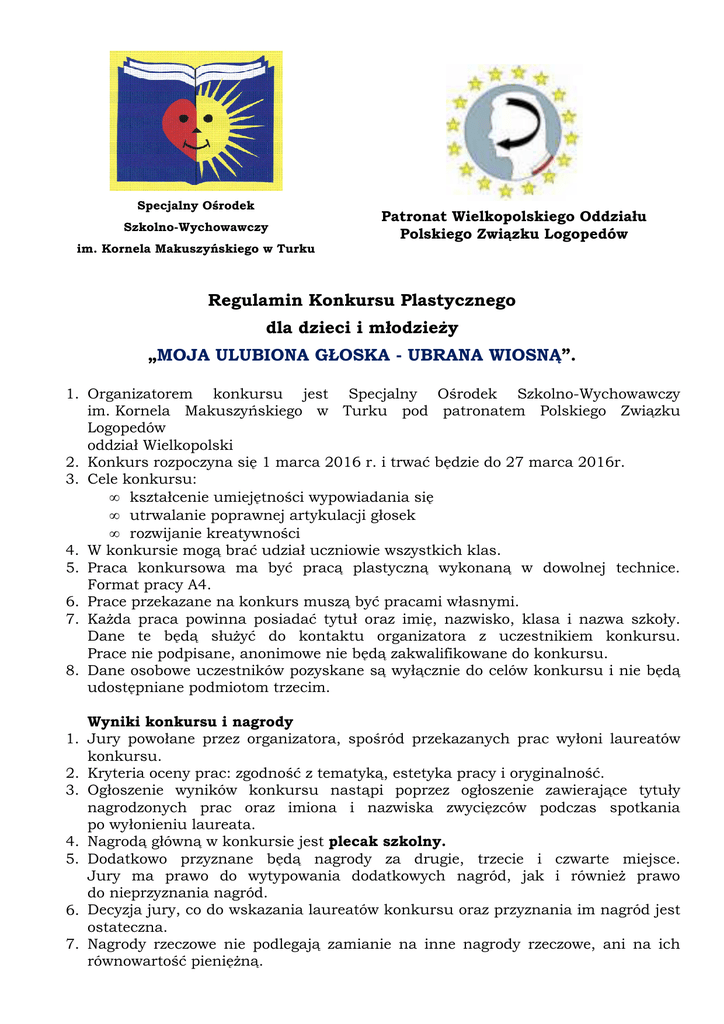 Specjalny Ośrodek Szkolno-Wychowawczy Patronat Wielkopolskiego Oddziału Polskiego Związku Logopedów im. Kornela Makuszyńskiego w Turku Regulamin Konkursu Plastycznego dla dzieci i młodzieży „MOJA ULUBIONA GŁOSKA - UBRANA WIOSNĄ”. 1. Organizatorem konkursu jest Specjalny Ośrodek Szkolno-Wychowawczy im. Kornela Makuszyńskiego w Turku pod patronatem Polskiego Związku Logopedów oddział Wielkopolski 2. Konkurs rozpoczyna się 1 marca 2016 r. i trwać będzie do 27 marca 2016r. 3. Cele konkursu: • kształcenie umiejętności wypowiadania się • utrwalanie poprawnej artykulacji głosek • rozwijanie kreatywności 4. W konkursie mogą brać udział uczniowie wszystkich klas. 5. Praca konkursowa ma być pracą plastyczną wykonaną w dowolnej technice. Format pracy A4. 6. Prace przekazane na konkurs muszą być pracami własnymi. 7. Każda praca powinna posiadać tytuł oraz imię, nazwisko, klasa i nazwa szkoły. Dane te będą służyć do kontaktu organizatora z uczestnikiem konkursu. Prace nie podpisane, anonimowe nie będą zakwalifikowane do konkursu. 8. Dane osobowe uczestników pozyskane są wyłącznie do celów konkursu i nie będą udostępniane podmiotom trzecim. Wyniki konkursu i nagrody 1. Jury powołane przez organizatora, spośród przekazanych prac wyłoni laureatów konkursu. 2. Kryteria oceny prac: zgodność z tematyką, estetyka pracy i oryginalność. 3. Ogłoszenie wyników konkursu nastąpi poprzez ogłoszenie zawierające tytuły nagrodzonych prac oraz imiona i nazwiska zwycięzców podczas spotkania po wyłonieniu laureata. 4. Nagrodą główną w konkursie jest plecak szkolny. 5. Dodatkowo przyznane będą nagrody za drugie, trzecie i czwarte miejsce. Jury ma prawo do wytypowania dodatkowych nagród, jak i również prawo do nieprzyznania nagród. 6. Decyzja jury, co do wskazania laureatów konkursu oraz przyznania im nagród jest ostateczna. 7. Nagrody rzeczowe nie podlegają zamianie na inne nagrody rzeczowe, ani na ich równowartość pieniężną.