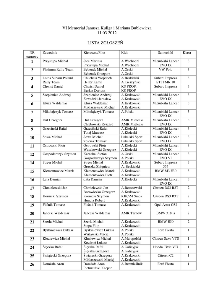 VI Memoriał Janusza Kuliga i Mariana Bublewicza 11.03.2012 LISTA ZGŁOSZEŃ NR startowy Zawodnik Kierowca/Pilot Klub 1 Przystupa Michał 2 Platinum Rally Team 3 4 Lotos Subaru Poland Rally Team Chwist Daniel 5 Szepieniec Andrzej 6 Kluza Waldemar 7 Mikołajczyk Tomasz Stec Mariusz Przystupa Michał Bębenek Michał Bębenek Grzegorz Chuchała Wojciech Heller Kamil Chwist Daniel Burkat Dariusz Szepieniec Andrzej Zawadzki Jarosław Kluza Waldemar Miklaszewski Michał Mikołajczyk Tomasz A.Wschodni A.Wschodni A.Orski A.Orski A.Beskidzki A.Cieszyński KS PROF. KS PROF A.Krakowski A.Krakowski A.Krakowski A.Krakowski A.Polski 8 Dul Grzegorz 9 Grzesiński Rafał Dul Grzegorz Chlebowski Ryszard Grzesiński Rafał Tutaj Mateusz Sowa Michał Zbiciak Tomasz Ostrowski Piotr Waszkowski Grzegorz Karnabal Stefan Gospodarczyk Szymon Streer Michał Gruszka Zbigniew Klementowicz Marek Klementowicz Piotr Łata Damian AMK Mielecki AMK Mielecki A.Kielecki A.Kielecki Lubelski Sport Lubelski Sport A.Kielecki A.Kielecki A.Orski A.Polski A.Krakowski A. Beskidzki A.Krakowski A.Krakowski A.Kielecki A.Rzeszowski A.Krakowski KKCiM Smok A.Krakowski A.Krakowski Samochód Mitsubishi Lancer EVO IX VW Polo Subaru Impreza STI TMR 10 Subaru Impreza Mitsubishi Lancer EVO IX Mitsubishi Lancer Klasa 3 3 3 3 3 3 Mitsubishi Lancer EVO IX Mitsubishi Lancer EVO IX Mitsubishi Lancer EVO IX Mitsubishi Lancer EVO IX Mitsubishi Lancer EVO IX Mitsubishi Lancer EVO VI Subaru Impreza 555 BMW M3 E30 3 Mitsubishi Lancer EVO IX Citroen DS3 R3T 3 Citroen DS3 R3T 2 Opel Astra GSI 2 3 3 10 Sowa Michał 3 11 Ostrowski Piotr 12 Gospodarczyk Szymon 14 Streer Michał 15 Klementowicz Marek 16 Łata Damian 17 Chmielewski Jan 18 Kornicki Szymon 19 Fliśnik Tomasz Chmielewski Jan Borowiczka Grzegorz Kornicki Szymon Hundla Robert Fliśnik Tomasz 20 Janecki Waldemar Janecki Waldemar AMK Tarnów BMW 318 is 2 21 Szerla Michał 2 Byśkiniewicz Łukasz Ford Fiesta 1 23 Kluziewicz Michał Citroen Saxo VTS 1 24 Ślęczka Rafał Honda Civic VTi 1 25 Świątecki Grzegorz Citroen C2 1 26 Domżała Aron A.Krakowski A.Krakowski A.Polski A.Polski A.Małopolski A.Krakowski A.Galicyjski A.Galicyjski A.Krakowski A.Krakowski A.Rzemieślnik BMW E30 22 Szerla Michał Stopa Filip Byśkiniewicz Łukasz Wisławski Maciej Kluziewicz Michał Kozdroń Łukasz Ślęczka Rafał Ślęczka Grzegorz Świątecki Grzegorz Miklaszewski Maciej Domżała Aron Pietrusiński Kacper Ford Fiesta 1 3 3 3 3 2
