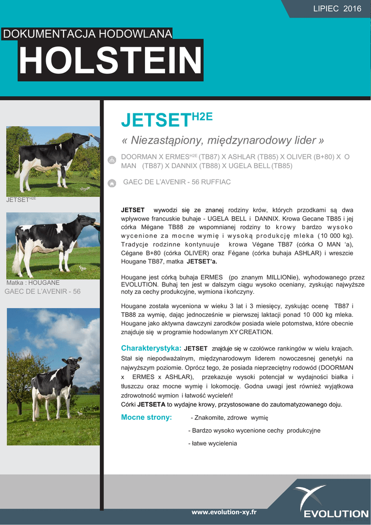 LIPIEC 2016 DOKUMENTACJA HODOWLANA HOLSTEIN JETSETH2E « Niezastąpiony, międzynarodowy lider » DOORMAN X ERMESH2E (TB87) X ASHLAR (TB85) X OLIVER (B+80) X O MAN (TB87) X DANNIX (TB88) X UGELA BELL (TB85) GAEC DE L’AVENIR - 56 RUFFIAC JETSETH2E JETSET wywodzi się ze znanej rodziny krów, których przodkami są dwa wpływowe francuskie buhaje - UGELA BELL i DANNIX. Krowa Gecane TB85 i jej córka Mégane TB88 ze wspomnianej rodziny to k r o w y b ardzo w y s o k o w y c e n i o n e z a m o c n e w y m i ę i w y s o k ą p r o d u k c j ę m l e k a ( 10 000 kg). Tradycje rodzinne kontynuuje krowa Végane TB87 (córka O MAN ‘a), Cégane B+80 (córka OLIVER) oraz Fégane (córka buhaja ASHLAR) i wreszcie Hougane TB87, matka JETSET’a. Matka : HOUGANE GAEC DE L’AVENIR - 56 Hougane jest córką buhaja ERMES (po znanym MILLIONie), wyhodowanego przez EVOLUTION. Buhaj ten jest w dalszym ciągu wysoko oceniany, zyskując najwyższe noty za cechy produkcyjne, wymiona i kończyny. Hougane została wyceniona w wieku 3 lat i 3 miesięcy, zyskując ocenę TB87 i TB88 za wymię, dając jednocześnie w pierwszej laktacji ponad 10 000 kg mleka. Hougane jako aktywna dawczyni zarodków posiada wiele potomstwa, które obecnie znajduje się w programie hodowlanym XY CREATION. Charakterystyka: JETSET znajduje się w czołówce rankingów w wielu krajach. Stał się niepodważalnym, międzynarodowym liderem nowoczesnej genetyki na najwyższym poziomie. Oprócz tego, że posiada nieprzeciętny rodowód (DOORMAN x ERMES x ASHLAR), przekazuje wysoki potencjał w wydajności białka i tłuszczu oraz mocne wymię i lokomocję. Godna uwagi jest również wyjątkowa zdrowotność wymion i łatwość wycieleń! Córki JETSETA to wydajne krowy, przystosowane do zautomatyzowanego doju. Mocne strony: - Znakomite, zdrowe wymię - Bardzo wysoko wycenione cechy produkcyjne - łatwe wycielenia www.evolution-xy.fr