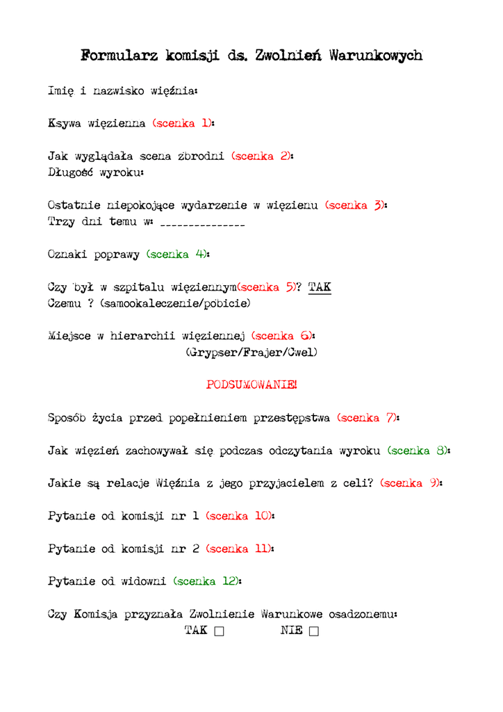Formularz komisji ds. Zwolnień Warunkowych Imię i nazwisko więźnia: Ksywa więzienna (scenka 1): Jak wyglądała scena zbrodni (scenka 2): Długość wyroku: Ostatnie niepokojące wydarzenie w więzienu (scenka 3): Trzy dni temu w: _______________ Oznaki poprawy (scenka 4): Czy był w szpitalu więziennym(scenka 5)? TAK Czemu ? (samookaleczenie/pobicie) Miejsce w hierarchii więziennej (scenka 6): (Grypser/Frajer/Cwel) PODSUMOWANIE! Sposób życia przed popełnieniem przestępstwa (scenka 7): Jak więzień zachowywał się podczas odczytania wyroku (scenka 8): Jakie są relacje Więźnia z jego przyjacielem z celi? (scenka 9): Pytanie od komisji nr 1 (scenka 10): Pytanie od komisji nr 2 (scenka 11): Pytanie od widowni (scenka 12): Czy Komisja przyznała Zwolnienie Warunkowe osadzonemu: TAK c NIE c Formularz komisji ds. Zwolnień Warunkowych Imię i nazwisko więźnia: Ksywa więzienna (scenka 1): Jak wyglądała scena zbrodni (scenka 2): Długość wyroku: Ostatnie niepokojące wydarzenie w więzienu (scenka 3): Trzy dni temu w: _______________ Oznaki poprawy (scenka 4): Czy był w szpitalu więziennym(scenka 5)? TAK Czemu ? (samookaleczenie/pobicie) Miejsce w hierarchii więziennej (scenka 6): (Grypser/Frajer/Cwel) PODSUMOWANIE! Sposób życia przed popełnieniem przestępstwa (scenka 7): Jak więzień zachowywał się podczas odczytania wyroku (scenka 8): Jakie są relacje Więźnia z jego przyjacielem z celi? (scenka 9): Pytanie od komisji nr 1 (scenka 10): Pytanie od komisji nr 2 (scenka 11): Pytanie od widowni (scenka 12): Czy Komisja przyznała Zwolnienie Warunkowe osadzonemu: TAK c NIE c Formularz komisji ds. Zwolnień Warunkowych Imię i nazwisko więźnia: Ksywa więzienna (scenka 1): Jak wyglądała scena zbrodni (scenka 2): Długość wyroku: Ostatnie niepokojące wydarzenie w więzienu (scenka 3): Trzy dni temu w: _______________ Oznaki poprawy (scenka 4): Czy był w szpitalu więziennym(scenka 5)? TAK Czemu ? (samookaleczenie/pobicie) Miejsce w hierarchii więziennej (scenka 6): (Grypser/Frajer/Cwel) PODSUMOWANIE! Sposób życia przed popełnieniem przestępstwa (scenka 7): Jak więzień zachowywał się podczas odczytania wyroku (scenka 8): Jakie są relacje Więźnia z jego przyjacielem z celi? (scenka 9): Pytanie od komisji nr 1 (scenka 10): Pytanie od komisji nr 2 (scenka 11): Pytanie od widowni (scenka 12): Czy Komisja przyznała Zwolnienie Warunkowe osadzonemu: TAK c NIE c Członek komisji ds. zwolnień warunkowych Masz przed sobą jedną z najgorszych kanalii jakie mogą żyć na tym świecie – przestępcę, zbrodniarza, bandytę. Nie wypuścisz go z pierdla, chyba że po twoim trupie! Tacy jak on powinni skończyć na krześle nie na wolności! Przedłuż mu wyrok! Członek komisji ds. zwolnień warunkowych Masz przed sobą jedną z najgorszych kanalii jakie mogą żyć na tym świecie – przestępcę, zbrodniarza, bandytę. Nie wypuścisz go z pierdla, chyba że po twoim trupie! Tacy jak on powinni skończyć na krześle nie na wolności! Przedłuż mu wyrok! Członek komisji ds. zwolnień warunkowych Masz przed sobą Więźnia, który zasługuje na współczucie. Mimo że jest to pospolity przestępca, zbrodniarz i bandyta chcesz mu pomóc. Uważasz, że już swoje wysiedział i może już wyjść na wolność. Skróć mu wyrok! Więzień ? Przyjaciel Więźnia Jesteś przyjacielem Więźnia. Znacie się z jednej celi. Trzymasz zawsze jego stronę. Już nie raz on uratował ci skórę, tak samo ty jemu. Jesteście sobie wierni!