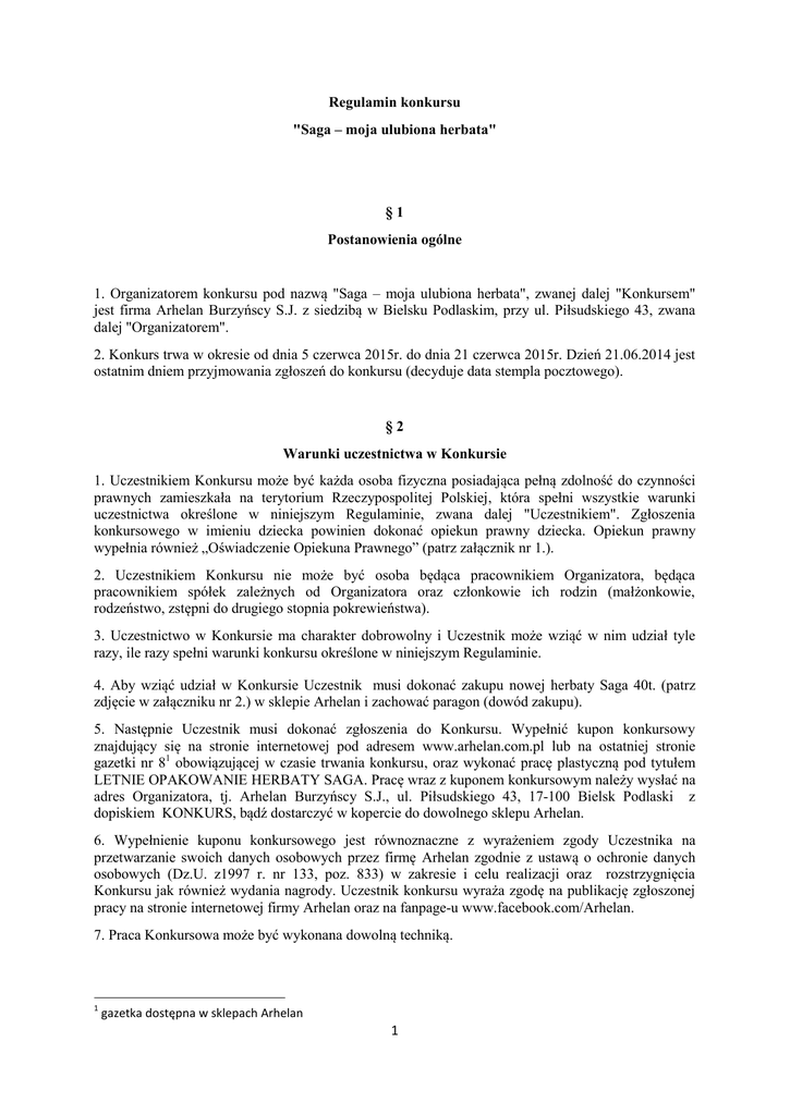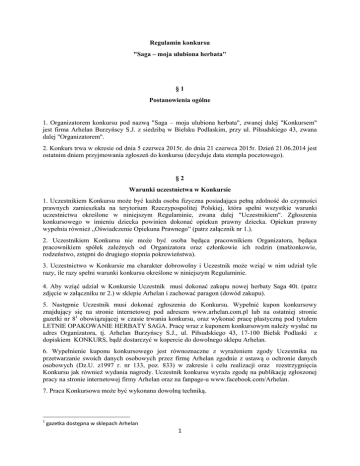 Regulamin konkursu "Saga – moja ulubiona herbata" §1 Postanowienia ogólne 1. Organizatorem konkursu pod nazwą "Saga – moja ulubiona herbata", zwanej dalej "Konkursem" jest firma Arhelan Burzyńscy S.J. z siedzibą w Bielsku Podlaskim, przy ul. Piłsudskiego 43, zwana dalej "Organizatorem". 2. Konkurs trwa w okresie od dnia 5 czerwca 2015r. do dnia 21 czerwca 2015r. Dzień 21.06.2014 jest ostatnim dniem przyjmowania zgłoszeń do konkursu (decyduje data stempla pocztowego). §2 Warunki uczestnictwa w Konkursie 1. Uczestnikiem Konkursu może być każda osoba fizyczna posiadająca pełną zdolność do czynności prawnych zamieszkała na terytorium Rzeczypospolitej Polskiej, która spełni wszystkie warunki uczestnictwa określone w niniejszym Regulaminie, zwana dalej "Uczestnikiem". Zgłoszenia konkursowego w imieniu dziecka powinien dokonać opiekun prawny dziecka. Opiekun prawny wypełnia również „Oświadczenie Opiekuna Prawnego” (patrz załącznik nr 1.). 2. Uczestnikiem Konkursu nie może być osoba będąca pracownikiem Organizatora, będąca pracownikiem spółek zależnych od Organizatora oraz członkowie ich rodzin (małżonkowie, rodzeństwo, zstępni do drugiego stopnia pokrewieństwa). 3. Uczestnictwo w Konkursie ma charakter dobrowolny i Uczestnik może wziąć w nim udział tyle razy, ile razy spełni warunki konkursu określone w niniejszym Regulaminie. 4. Aby wziąć udział w Konkursie Uczestnik musi dokonać zakupu nowej herbaty Saga 40t. (patrz zdjęcie w załączniku nr 2.) w sklepie Arhelan i zachować paragon (dowód zakupu). 5. Następnie Uczestnik musi dokonać zgłoszenia do Konkursu. Wypełnić kupon konkursowy znajdujący się na stronie internetowej pod adresem www.arhelan.com.pl lub na ostatniej stronie gazetki nr 81 obowiązującej w czasie trwania konkursu, oraz wykonać pracę plastyczną pod tytułem LETNIE OPAKOWANIE HERBATY SAGA. Pracę wraz z kuponem konkursowym należy wysłać na adres Organizatora, tj. Arhelan Burzyńscy S.J., ul. Piłsudskiego 43, 17-100 Bielsk Podlaski z dopiskiem KONKURS, bądź dostarczyć w kopercie do dowolnego sklepu Arhelan. 6. Wypełnienie kuponu konkursowego jest równoznaczne z wyrażeniem zgody Uczestnika na przetwarzanie swoich danych osobowych przez firmę Arhelan zgodnie z ustawą o ochronie danych osobowych (Dz.U. z1997 r. nr 133, poz. 833) w zakresie i celu realizacji oraz rozstrzygnięcia Konkursu jak również wydania nagrody. Uczestnik konkursu wyraża zgodę na publikację zgłoszonej pracy na stronie internetowej firmy Arhelan oraz na fanpage-u www.facebook.com/Arhelan. 7. Praca Konkursowa może być wykonana dowolną techniką. 1 gazetka dostępna w sklepach Arhelan 1 §3 Nagrody w Konkursie 1. Fundatorem nagród do Konkursu jest firma Unilever. 2. Nagrody stanowią: 1 x czajnik elektryczny 1 x komplet szklanek żaroodpornych (6 szt. w kpl.) 5 x duży miś Saga 6 x mały miś Saga 6 x komplet filiżanek ze spodkami (4 szt. w kpl.) 36 x herbat Saga 3. Nagrody otrzyma 11 Uczestników Konkursu, których prace konkursowe zostaną uznane przez Komisję Konkursową jako najciekawsze. I. II. III. IV. V. VI. VII. VIII. IX. X. XI. Czajnik elektryczny + duży miś Saga + herbata Saga Komplet szklanek żaroodpornych + duży miś Saga + herbata Saga Komplet filiżanek + duży miś Saga + herbata Saga Komplet filiżanek + duży miś Saga + herbata Saga Komplet filiżanek + duży miś Saga + herbata Saga Komplet filiżanek + mały miś Saga + herbata Saga Komplet filiżanek + mały miś Saga + herbata Saga Komplet filiżanek + mały miś Saga + herbata Saga Mały miś Saga + herbata Saga Mały miś Saga + herbata Saga Mały miś Saga + herbata Saga Komisja Konkursowa wyróżni również 25 Uczestników Konkursu którzy otrzymają nagrodę pocieszenia w postaci herbaty Saga. 4. Wyboru najciekawszej pracy konkursowej dokona powołana przez Organizatora Komisja Konkursowa. 5. Decyzja Komisji Konkursowej jest suwerenna, nie może zostać zmieniona i nie podlega zaskarżeniu przez Uczestników. Z obrad Komisji Konkursowej zostanie sporządzony protokół podpisany następnie przez wszystkich jej członków. 6. Kryterium wyboru najlepszej pracy konkursowej przez Komisję stanowić będą w szczególności następujące elementy: oryginalność pomysłu, zgodność z tematyką, walory estetyczne. §4 Odbiór nagrody 1. Uczestnik, który wygra Nagrodę, zostanie powiadomiony przez Organizatora o wygranej na numer telefonu podany przez Uczestnika w zgłoszeniu. 2. Komisja będzie informować zwycięzców o wygranej drogą telefoniczną. W przypadku kontaktu telefonicznego Organizator podejmie 3 próby połączenia telefonicznego ze Zwycięzcą. Przez nieudaną próbę rozumie się: włączenie poczty głosowej, nieodebrane połączenie przez 5 sygnałów, przebywanie telefonu poza zasięgiem, wyłączony telefon. Uczestnik, z którym nie udało się skontaktować, traci prawo do nagrody. 3. Po 3 nieudanych próbach kontaktu ze zwycięzcą, nagroda zostaje przekazana kolejnej osobie z listy rezerwowej. 2 4. Wyniki zostaną ogłoszone 30 czerwca na stronie www.arhelan.com.pl oraz na fanpage-u www.facebook.com/Arhelan 5. Nagrody będą przekazywane zwycięzcom w wybranych przez Uczestników punktach sieci Arhelan. 6. W przypadku braku możliwości osobistego odebrania nagrody przez Zwycięzcę, nagrodę w jego imieniu może odebrać Pełnomocnik na podstawie upoważnienia do odbioru nagrody w imieniu Zwycięzcy. Upoważnienie musi określać: dane Zwycięzcy (imię i nazwisko, adres zameldowania, PESEL, nr dowodu osobistego lub innego dokumentu tożsamości) oraz dane Pełnomocnika (imię i nazwisko, adres zameldowania, PESEL, nr dowodu osobistego lub innego dokumentu tożsamości). Pełnomocnik musi mieć ukończone 18 lat i wyrazić zgodę na wykorzystanie jego wizerunku we wszelkich materiałach dokumentujących przebieg konkursu. 7. Warunki wydania nagrody w wyznaczonym przez Organizatora terminie: stawienie się we wska