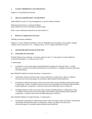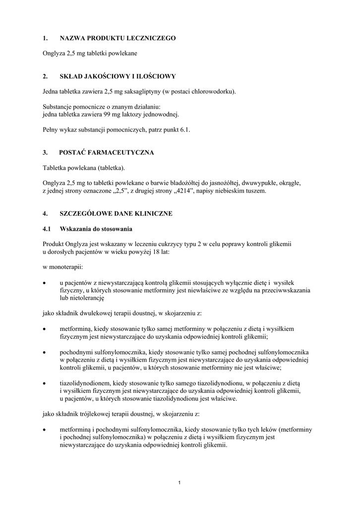 1. NAZWA PRODUKTU LECZNICZEGO Onglyza 2,5 mg tabletki powlekane 2. SKŁAD JAKOŚCIOWY I ILOŚCIOWY Jedna tabletka zawiera 2,5 mg saksagliptyny (w postaci chlorowodorku). Substancje pomocnicze o znanym działaniu: jedna tabletka zawiera 99 mg laktozy jednowodnej. Pełny wykaz substancji pomocniczych, patrz punkt 6.1. 3. POSTAĆ FARMACEUTYCZNA Tabletka powlekana (tabletka). Onglyza 2,5 mg to tabletki powlekane o barwie bladożółtej do jasnożółtej, dwuwypukłe, okrągłe, z jednej strony oznaczone „2,5”, z drugiej strony „4214”, napisy niebieskim tuszem. 4. SZCZEGÓŁOWE DANE KLINICZNE 4.1 Wskazania do stosowania Produkt Onglyza jest wskazany w leczeniu cukrzycy typu 2 w celu poprawy kontroli glikemii u dorosłych pacjentów w wieku powyżej 18 lat: w monoterapii: u pacjentów z niewystarczającą kontrolą glikemii stosujących wyłącznie dietę i wysiłek fizyczny, u których stosowanie metforminy jest niewłaściwe ze względu na przeciwwskazania lub nietolerancję jako składnik dwulekowej terapii doustnej, w skojarzeniu z: metforminą, kiedy stosowanie tylko samej metforminy w połączeniu z dietą i wysiłkiem fizycznym jest niewystarczające do uzyskania odpowiedniej kontroli glikemii; pochodnymi sulfonylomocznika, kiedy stosowanie tylko samej pochodnej sulfonylomocznika w połączeniu z dietą i wysiłkiem fizycznym jest niewystarczające do uzyskania odpowiedniej kontroli glikemii, u pacjentów, u których stosowanie metforminy nie jest właściwe; tiazolidynodionem, kiedy stosowanie tylko samego tiazolidynodionu, w połączeniu z dietą i wysiłkiem fizycznym jest niewystarczające do uzyskania odpowiedniej kontroli glikemii, u pacjentów, u których stosowanie tiazolidynodionu jest właściwe. jako składnik trójlekowej terapii doustnej, w skojarzeniu z: metforminą i pochodnymi sulfonylomocznika, kiedy stosowanie tylko tych leków (metforminy i pochodnej sulfonylomocznika) w połączeniu z dietą i wysiłkiem fizycznym jest niewystarczające do uzyskania odpowiedniej kontroli glikemii. 1 w terapii skojarzonej z insuliną (z metforminą lub bez niej), kiedy stosowanie tylko samej insuliny wraz z dietą i wysiłkiem fizycznym nie jest wystarczające do uzyskania odpowiedniej kontroli glikemii. 4.2 Dawkowanie i sposób podawania Dawkowanie Zalecana dawka produktu Onglyza to 5 mg, raz na dobę. Podczas stosowania leku Onglyza w skojarzeniu z insuliną lub pochodnymi sulfonylomocznika, może być konieczne zmniejszenie dawki insuliny lub pochodnej sulfonylomocznika, aby zmniejszyć ryzyko wystąpienia hipoglikemii (patrz punkt 4.4) Nie badano skuteczności i bezpieczeństwa stosowania saksagliptyny w potrójnej terapii doustnej w skojarzeniu z metforminą i tiazolidynodionem. Specjalne grupy pacjentów Pacjenci w podeszłym wieku (65 lat) Nie zaleca się dostosowania dawki leku jedynie na podstawie wieku pacjenta (patrz także punkty 5.1 i 5.2) Pacjenci z zaburzeniami czynności nerek Nie ma konieczności zmiany dawki u pacjentów z łagodnymi zaburzeniami czynności nerek. U pacjentów z umiarkowaną do ciężkiej niewydolnością nerek dawka powinna być zmniejszona do 2,5 mg raz na dobę. Produktu Onglyza nie zaleca się do stosowania u pacjentów ze schyłkową niewydolnością nerek (ang. end-stage renal disease - ESRD) wymagających hemodializy (patrz punkt 4.4). Dawka powinna zostać zmniejszona do 2,5 mg ze względu na obniżoną czynność nerek, dlatego zaleca się kontrolowanie czynności nerek przed rozpoczęciem terapii oraz, zgodnie ze standardową procedurą medyczną, systematycznie w trakcie stosowania produktu (patrz punkty 4.4 i 5.2). Pacjenci z zaburzeniami czynności wątroby Nie ma konieczności dostosowania dawki u pacjentów z łagodnymi lub umiarkowanymi zaburzeniami czynności wątroby (patrz punkt 5.2). Saksagliptynę należy stosować ostrożnie u pacjentów z umiarkowaną niewydolnością wątroby, a u pacjentów z ciężką niewydolnością wątroby nie zaleca się stosowania (patrz punkt 4.4). Młodzież i dzieci Nie ustalono bezpieczeństwa i skuteczności stosowania leku Onglyza u dzieci w wieku poniżej 18 lat. Brak dostępnych danych. Sposób podawania Tabletki można zażywać z posiłkiem lub bez posiłku, o każdej porze dnia. Tabletek nie wolno dzielić lub kruszyć. W przypadku pominięcia dawki, pacjent powinien ją zażyć tak szybko, jak to możliwe. Nie należy zażywać podwójnej dawki tego samego dnia. 4.3 Przeciwwskazania Nadwrażliwość na substancję czynną lub na którąkolwiek substancję pomocniczą wymienioną w punkcie 6.1 lub ciężkie reakcje nadwrażliwości na jakikolwiek lek z grupy inhibitorów 2 dipeptydylopeptydazy 4 (DPP4) w wywiadzie, w tym reakcje anafilaktyczne, wstrząs anafilaktyczny i obrzęk naczynioruchowy (patrz punkty 4.4 i 4.8). 4.4 Specjalne ostrzeżenia i środki ostrożności dotyczące stosowania Ogólne Produktu Onglyza nie należy stosować u pacjentów z cukrzycą typu 1 ani w leczeniu kwasicy ketonowej w przebiegu cukrzycy. Produkt Onglyza nie zastąpi insuliny u pacjentów, którzy wymagają stosowania insuliny. Ostre zapalenie trzustki Ze stosowaniem inhibitorów DPP-4 związane jest z ryzyko rozwoju ostrego zapalenia trzustki. Pacjentów należy poinformować o charakterystycznych objawach ostrego zapalenia trzustki; uporczywym, silnym bólu brzucha. Jeśli podejrzewa się zapalenie trzustki, należy zaprzestać stosowania produktu Onglyza; w przypadku potwierdzenia rozpoznania zapalenia trzustki, nie należy wznawiać leczenia produktem Onglyza. Należy zachować szczególną ostrożność u pacjentów z zapaleniem trzustki w wywiadzie. Po wprowadzeniu do obrotu produktu zawierającego saksagliptynę były spontanicznie zgłaszane działania niepożądane w tym ostre zapalenie trzustki. Zaburzenia czynności nerek Indywidualne dostosowanie dawki zalecane jest u pacjentów z umiarkowaną do ciężkiej niewydolnością nerek. Saksagliptyna nie jest zalecana u pacjentów ze schyłkow