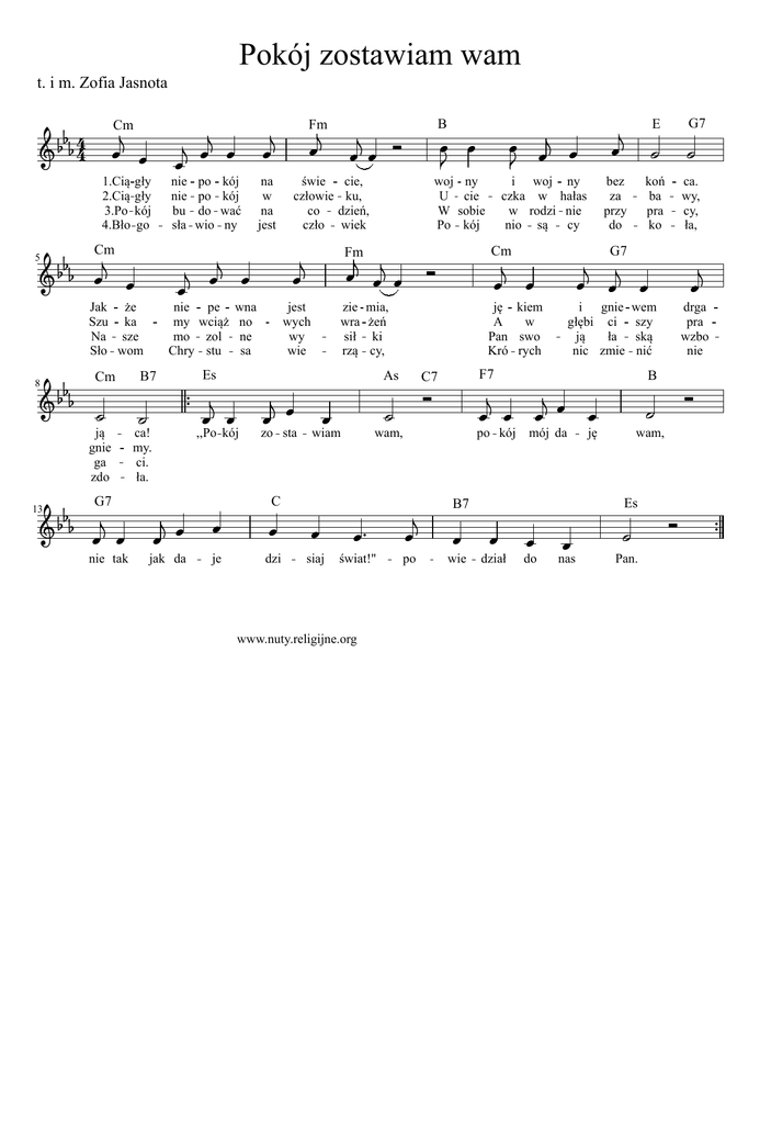 Pokój zostawiam wam t. i m. Zofia Jasnota 4 1.Cią gły 2.Cią gły 3.Po kój 4.Bło go 5 B nie nie bu sła po po do wio kój kój wać ny na w na jest świe cie, człowie ku, co dzień, czło wiek Cm Jak że Szu ka Na sze Sło wom 8 Fm Cm Cm nie pe my wciąż mo zol Chry stu B7 Es ją gnie ga zdo 13 ca! my. ci. ła. jak da je jest wych wy wie woj ny U cie W sobie Po kój zie wra sił rzą i woj ny czka w hałas w rodzi nie nio są cy bez za przy do Cm Fm mia, żeń ki cy, koń ba pra ko i głębi ją nic gnie ci ła zmie wem szy ską nić F7 C7 G7 ca. wy, cy, ła, G7 ję kiem A w Pan swo Kró rych As ,,Po kój G7 nie tak wna no ne sa E B drga pra wzbo nie zo sta wiam wam, po kój mój da C dzi świat!" www.nuty.religijne.org po wie wam, Es B7 siaj ję dział do nas Pan.