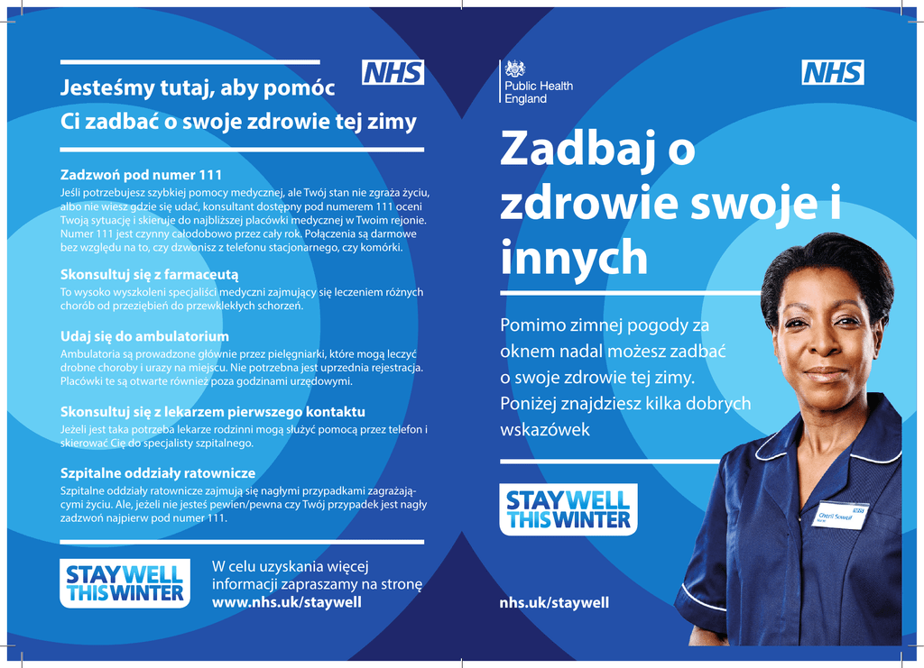 Jesteśmy tutaj, aby pomóc Ci zadbać o swoje zdrowie tej zimy Zadzwoń pod numer 111 Jeśli potrzebujesz szybkiej pomocy medycznej, ale Twój stan nie zgraża życiu, albo nie wiesz gdzie się udać, konsultant dostępny pod numerem 111 oceni Twoją sytuację i skieruje do najbliższej placówki medycznej w Twoim rejonie. Numer 111 jest czynny całodobowo przez cały rok. Połączenia są darmowe bez względu na to, czy dzwonisz z telefonu stacjonarnego, czy komórki. Skonsultuj się z farmaceutą To wysoko wyszkoleni specjaliści medyczni zajmujący się leczeniem różnych chorób od przeziębień do przewklekłych schorzeń. Udaj się do ambulatorium Ambulatoria są prowadzone głównie przez pielęgniarki, które mogą leczyć drobne choroby i urazy na miejscu. Nie potrzebna jest uprzednia rejestracja. Placówki te są otwarte również poza godzinami urzędowymi. Skonsultuj się z lekarzem pierwszego kontaktu Jeżeli jest taka potrzeba lekarze rodzinni mogą służyć pomocą przez telefon i skierować Cię do specjalisty szpitalnego. Zadbaj o zdrowie swoje i innych Pomimo zimnej pogody za oknem nadal możesz zadbać o swoje zdrowie tej zimy. Poniżej znajdziesz kilka dobrych wskazówek Szpitalne oddziały ratownicze Szpitalne oddziały ratownicze zajmują się nagłymi przypadkami zagrażającymi życiu. Ale, jeżeli nie jesteś pewien/pewna czy Twój przypadek jest nagły zadzwoń najpierw pod numer 111. W celu uzyskania więcej informacji zapraszamy na stronę www.nhs.uk/staywell nhs.uk/staywell Ciepło się ubieraj Znaj swoje opcje – Uzyskaj opiekę, której potrzebujesz Jednym z najlepszych sposobów zadbania o swoje zdrowie jest noszenie ciepłej odzieży. To pozwoli zapobiec przeziębieniom, grypie, a nawet poważniejszym powikłaniom jak zapalenie płuc, depresja, atak serca czy udar. Jeżeli nie jesteś pewien/pewna, której z usług NHS potrzebujesz, zadzwoń pod numer 111. Profesjonalnie przeszkolony konsultant przeprowadzi z Tobą wywiad środowiskowy. Określi Twoje symptomy i udzieli Ci adekwatnej porady lub skieruje Cię do odpowiedniego specjalisty dostępnego w Twoim rejonie. W nagłych przypadkach wezwie karetkę pogotowia. Jeżeli masz problemy z poruszaniem się, jesteś w wieku 65 lat lub powyżej, albo cierpisz na choroby serca lub płuc powinieneś w domu utrzymywać temperaturę przynajmniej 18C. Jeżeli w nocy będzie Ci zimno użyj termoforu lub elektrycznego koca – ale nigdy nie stosuj tych rzeczy jednocześnie. Ciepło się ubieraj; kilka lekkich warstw zapewni Ci lepszą ochronę. Ubieraj się ,,ne cebulkę’’ zamiast zakładać jedną grubą wartwę odzieży. Do wyjścia na zewnątrz wybierz buty z antypoślizgową podeszwą. Jesli masz problemy z sercem lub z oddychaniem lepiej pozostań w domu podczas mrozów. Zdrowo się odżywiaj Żywność jest podstawowym źródłem energii, która pozwala utrzymać prawidłową ciepłotę ciała. Spożywaj ciepłe posiłki regularnie i dużo pij w ciągu dnia. Spożywanie w szczególności nabiału wzmocni Twój układ odpornościowy i zapobiegnie przeziębieniom. Zaszczep się przeciw grypie Nawet najzdrowsze osoby mogą chorować na grypę przez kilka tygodni. Dla tych, którzy znajdują się ,,w grupie ryzyka’’ wirus grypy moze okazac się o wiele groźniejszy – a nawet śmiertelny. Dlatego też służba zdrowia NHS oferuje nieodpłatnie szczepionki dla następujących grup pacjentów: Osoby w wieku powyżej 65 lat Kobiety w ciąży Osoby z wysoką nadwagą (ze wskaźnikiem masy ciała powyżej 40 BMI) Dzieci i dorośli z przewlekłymi schorzeniami (w szczególności długotrwałymi chorobami serca lub płuc) Dzieci i dorośli, u których układ odpornościowy jest osłabiony. Jeżeli zaliczasz się do którejś z tych grup, zarejestruj się na wizytę u lekarza pierwszego kontaktu lub udaj się do lokalnej apteki, aby skonsultować się z farmaceutą w sprawie szczepionki. Dla najmłodszych dostępna jest szczepionka w postaci aerozolu do nosa. Zalecenia lekarza Przestrzegaj zaleceń lekarza – jeśli zażywasz lekarstwa upewnij się, że stosujesz je zgodnie z zaleceniami. Jeśli przyjmujesz antybiotyki zawsze dokończ kurację. Pamiętaj, żeby poprosić o wydanie odnawialnych recept i odbierz je przed datą 24 grudnia, ponieważ wiele przychodni i aptek będzie nieczynnych podczas okresu świątecznego i noworocznego. Apteka w pierwszej kolejności Jeżeli zaczniesz się źle czuć najpierw udaj się do lokalnej apteki. Farmaceuci udzielą Ci fachowej porady i wydadzą lekarstwa. Nie musisz się uprzednio rejestrować. Zazwyczaj w aptekach znajdują się pomieszczenia, w których można przeprowadzic prywatne konsultacje. Dlatego apteki zaleca się jako pierwszy kontakt. Jeżeli w Twoim przypadku wskazane będzie uzyskanie dodatkowej pomocy medycznej, farmaceuta Cię o tym poinformuje. Nie pozwól, aby choroba się pogłębiła – zapobiegnij postępowaniu choroby poprzez szybką konsultację z farmaceutą w pierwszej kolejności. Skonsultuj się z lekarzem pierwszego kontaktu Lekarze pierwszego kontaktu oceniają, leczą i zapobiegają szerokiej gamie problemów zdrowotnych. Udzielają również informacji medycznych, podają szczepionki i przeprowadzają drobne zabiegi. W razie potrzeby lekarz skieruje Cię do szpitalnego specjalisty. Jeżeli przychodnia będzie nieczynna zadzwoń pod numer 111 a zostaniesz skierowany do najblizszej placówki medycznej, w której zostanie Ci udzielona pomoc. Ambulatorium Ambulatoria oferują szybki dostęp do leczena drobnych urazów, chorób, w tym zakażeń, wymiotów i bóli brzucha. Większość tych placówek jest prowadzona przez pielęgniarki, a w niektórych pracują również lekarze. Tego typu kliniki są czynne poza godzinami urzędowymi i nie wymagają uprzedniej rejestracji. CZY WIESZ, ŻE? Przeziębienia, większość kaszli oraz grypa – są wirusami zakaźnymi. Anytbiotyki nie podziałają na wirusy, więc nie poczujesz się dzięki nim 