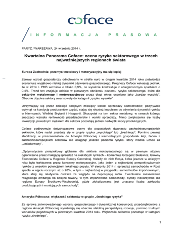 I N F O R M A C J A P R A S O W A PARYŻ / WARSZAWA, 24 września 2014 r. Kwartalna Panorama Coface: ocena ryzyka sektorowego w trzech najważniejszych regionach świata Europa Zachodnia: przemysł metalowy i motoryzacyjny ma się lepiej Zerowy wzrost gospodarczy odnotowany w strefie euro w drugim kwartale 2014 roku potwierdza scenariusz wyjątkowo niskiej dynamiki ożywienia gospodarczego. Prognozy Coface wskazują jednak, że w 2014 r. PKB wzrośnie o blisko 0,9%, co wyraźnie kontrastuje z ubiegłorocznym spadkiem o 0,4%. Trend ten znajduje odbicie w pierwszym obniżeniu poziomu ryzyka sektorowego, które dla sektorów metalowego i motoryzacyjnego przez długi okres oceniano jako „bardzo wysokie”. Obecnie obydwa sektory awansowały do kategorii „ryzyko wysokie”. Utrzymujący się przez dziesięć kolejnych miesięcy wzrost sprzedaży samochodów, pozytywnie wpłynął na kondycję producentów części, stając się również impulsem do ożywienia dynamiki rynków w Niemczech, Wielkiej Brytanii i Hiszpanii. Skorzystał na tym sektor metalowy, w ramach którego znacząco wzrosła rentowność przedsiębiorstw i wyniki sprzedaży. Mimo zwiększenia się liczby inwestycji, poważnym ciężarem dla sektora pozostają jednak nadwyżki mocy produkcyjnych. Coface podtrzymuje dotychczasowe oceny dla pozostałych dwunastu zachodnioeuropejskich sektorów, które nadal znajdują się w grupie ryzyka „wysokiego” lub „średniego”. Pomimo pewnej stabilizacji, w przeciwieństwie do Ameryki Północnej i wschodzących gospodarek Azji, żaden z zachodnioeuropejskich sektorów nie osiągnął jeszcze poziomu ryzyka, który można uznać za „umiarkowany”. „Optymistyczne perspektywy globalne dla sektora motoryzacyjnego są w pewnym stopniu ograniczane przez malejącą sprzedaż na niektórych rynkach – komentuje Grzegorz Sielewicz, Główny Ekonomista Coface w Regionie Europy Centralnej. Należy do nich Rosja, która jeszcze w ubiegłym roku była traktowana przez koncerny motoryzacyjne, jako jeden z najbardziej perspektywicznych rynków z wysokim potencjałem lokalnego popytu. W sierpniu 2014 r. sprzedaż samochodów w Rosji spadła w ujęciu rocznym aż o 26%, w tym - najbardziej w przypadku samochodów importowanych, które stały się relatywnie droższe ze względu na deprecjację rubla. Ewentualne rozszerzenie rosyjskiego embarga na kolejne towary, w tym importowane samochody, byłoby niekorzystne dla regionu Europy Środkowo-Wschodniej, gdzie zlokalizowana jest znaczna liczba zakładów produkujących i montujących samochody”. Ameryka Północna: większość sektorów w grupie „średniego ryzyka” Za sprawą zrównoważonego wzrostu gospodarczego i dynamicznej konsumpcji, przedsiębiorstwa z regionu Ameryki Północnej wyróżniają się obecnie stabilną perspektywą rozwoju, pomimo trudnych warunków pogodowych w pierwszym kwartale 2014 roku. Większość sektorów pozostaje w kategorii ryzyka „średniego”. 1 Optymistycznie rysują się perspektywy dla przemysłu motoryzacyjnego, który nadal posiada solidne zaplecze finansowe i wypracował na koniec lipca 2014 r. 4,6% wzrost sprzedaży w ujęciu rocznym. Dynamika rozwoju branży motoryzacyjnej oznacza większy popyt na produkty firm z sektora chemicznego, których rentowność dzięki dostępowi do tańszej energii i surowców, wzrosła pod koniec lipca 2014 r. o prawie 12% w ujęciu rocznym. Wschodzące gospodarki Azji: obniżenie ocen dla sektorów papierniczo-drzewnego i budowlanego W przeciwieństwie do Europy i Ameryki Północnej, gdzie następuje stopniowa stabilizacja czynników ryzyka, wschodzące rynki azjatyckie przyjmują zachowawczą postawę. Na skutek trwającego procesu konsolidacji nadwyżek zdolności produkcyjnych, rosną zapasy i rośnie zadłużenie przedsiębiorstw. W przemyśle metalowym obserwujemy spadek cen stali. Od kwietnia branża ta, jako jedyny sektor azjatyckiej gospodarki znajduje się w grupie „bardzo wysokiego ryzyka”. Poziom ryzyka sektorowego nadal rośnie w branży budowlanej i papierniczo-drzewnej. Zagrożony malejącym popytem sektor budowlany staje dodatkowo w obliczu pogarszających się możliwości uzyskania kredytu oraz coraz częstszego w Chinach problemu miast „widm”, co w konsekwencji skłania Coface do zmiany oceny ryzyka z poziomu „średniego” na „wysoki”. Rosnąca liczba niewypłacalnych podmiotów wśród małych i średnich przedsiębiorstw sektora papierniczego w połączeniu z nadwyżką mocy produkcyjnych, zmusza Coface do obniżenia oceny ryzyka sektorowego do poziomu „średniego”. KONTAKT DLA MEDIÓW: Anna A. GUZIK – T. +48 22 465 02 22, M. +48 509 467 531 – E. [email protected] Informacje o Coface Grupa Coface, światowy lider w obszarze ubezpieczeń należności, oferuje firmom na całym świecie rozwiązania w zakresie ochrony przed ryzykiem niewypłacalności ich klientów, zarówno w transakcjach krajowych jak i eksportowych. W 2013 r. Grupa osiągnęła skonsolidowany obrót w wysokości 1,44 mld EUR. 4 440 pracowników zapewnia lokalną obsługę 37 tys. klientów z ponad 200 krajów na całym świecie. Coface publikuje co kwartał swoje oceny ryzyka kraju dla 160 państw, w oparciu o unikalną wiedzę nt. zachowań płatniczych przedsiębiorstw i doświadczenie 350 analityków ds. oceny ryzyka, znajdujących się blisko klientów i ich dłużników. We Francji Coface zarządza gwarancjami eksportowymi w imieniu skarbu państwa. W Polsce Coface jest obecny od 1992 roku. Ubezpiecza należności krajowe i eksportowe, oferuje finansowanie poprzez faktoring, a także raporty handlowe o firmach z całego świata i marketingowe bazy danych. Prowadzi monitoring i windykację należności B2B. Więcej informacji o firmie oraz pozostałe komunikaty prasowe dostępne na www.coface.pl Spółka Coface SA jest notowana w indeksie Euronext Paris – Compartment A na giełdzie papierów wartościowych w Paryżu pod numerem ISIN: FR00106