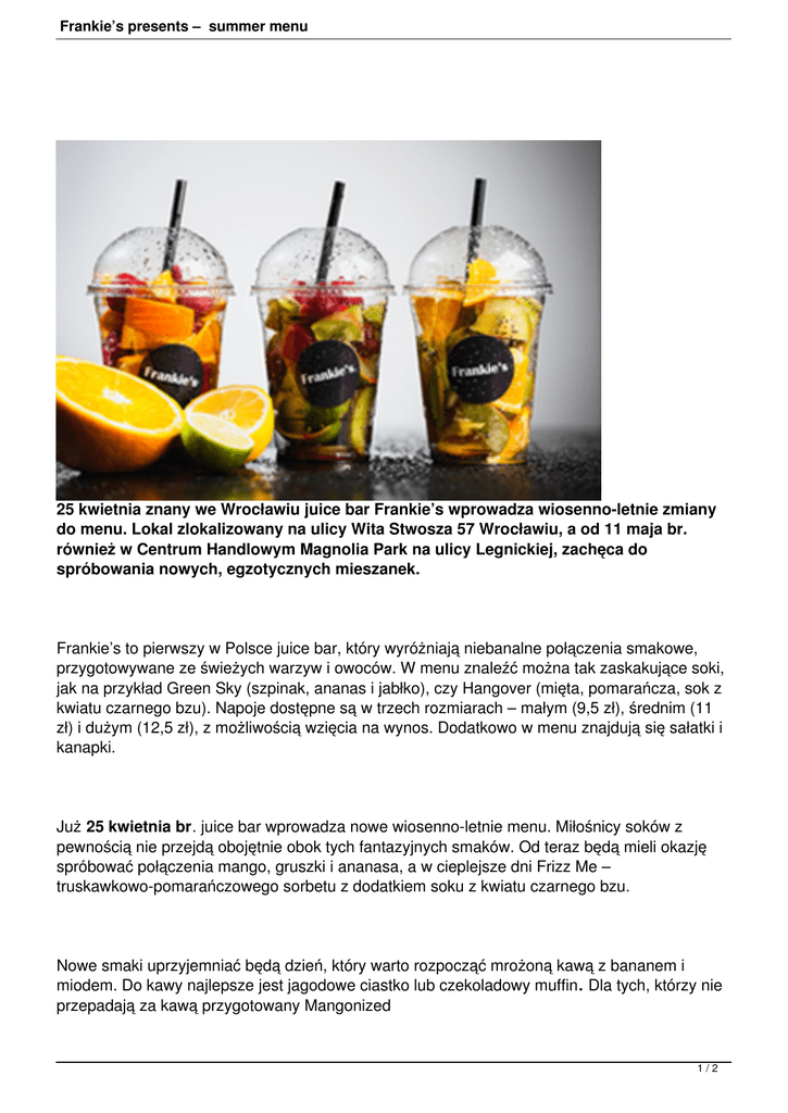 Frankie’s presents – summer menu 25 kwietnia znany we Wrocławiu juice bar Frankie’s wprowadza wiosenno-letnie zmiany do menu. Lokal zlokalizowany na ulicy Wita Stwosza 57 Wrocławiu, a od 11 maja br. również w Centrum Handlowym Magnolia Park na ulicy Legnickiej, zachęca do spróbowania nowych, egzotycznych mieszanek. Frankie’s to pierwszy w Polsce juice bar, który wyróżniają niebanalne połączenia smakowe, przygotowywane ze świeżych warzyw i owoców. W menu znaleźć można tak zaskakujące soki, jak na przykład Green Sky (szpinak, ananas i jabłko), czy Hangover (mięta, pomarańcza, sok z kwiatu czarnego bzu). Napoje dostępne są w trzech rozmiarach – małym (9,5 zł), średnim (11 zł) i dużym (12,5 zł), z możliwością wzięcia na wynos. Dodatkowo w menu znajdują się sałatki i kanapki. Już 25 kwietnia br. juice bar wprowadza nowe wiosenno-letnie menu. Miłośnicy soków z pewnością nie przejdą obojętnie obok tych fantazyjnych smaków. Od teraz będą mieli okazję spróbować połączenia mango, gruszki i ananasa, a w cieplejsze dni Frizz Me – truskawkowo-pomarańczowego sorbetu z dodatkiem soku z kwiatu czarnego bzu. Nowe smaki uprzyjemniać będą dzień, który warto rozpocząć mrożoną kawą z bananem i miodem. Do kawy najlepsze jest jagodowe ciastko lub czekoladowy muffin. Dla tych, którzy nie przepadają za kawą przygotowany Mangonized 1/2 Frankie’s presents – summer menu – sycący shake z mango, bananami i brzoskwiniami lub Micadoh – mieszankę awokado, mleka i miodu. Pora śniadaniowa minęła i pojawił się pierwszy poważniejszy głód? Na entuzjastów sałatek czeka chrupiący kurczak z makaronem, liśćmi szpinaku, fasolą Edamame, ciecierzycą, brokułami, papryką, kukurydzą i orzechami nerkowca. By wzbogacić smak, do stałych pozycji dorzucono różne składniki, np. camembert czy nasiona dyni. Better get juiced to us! 2/2