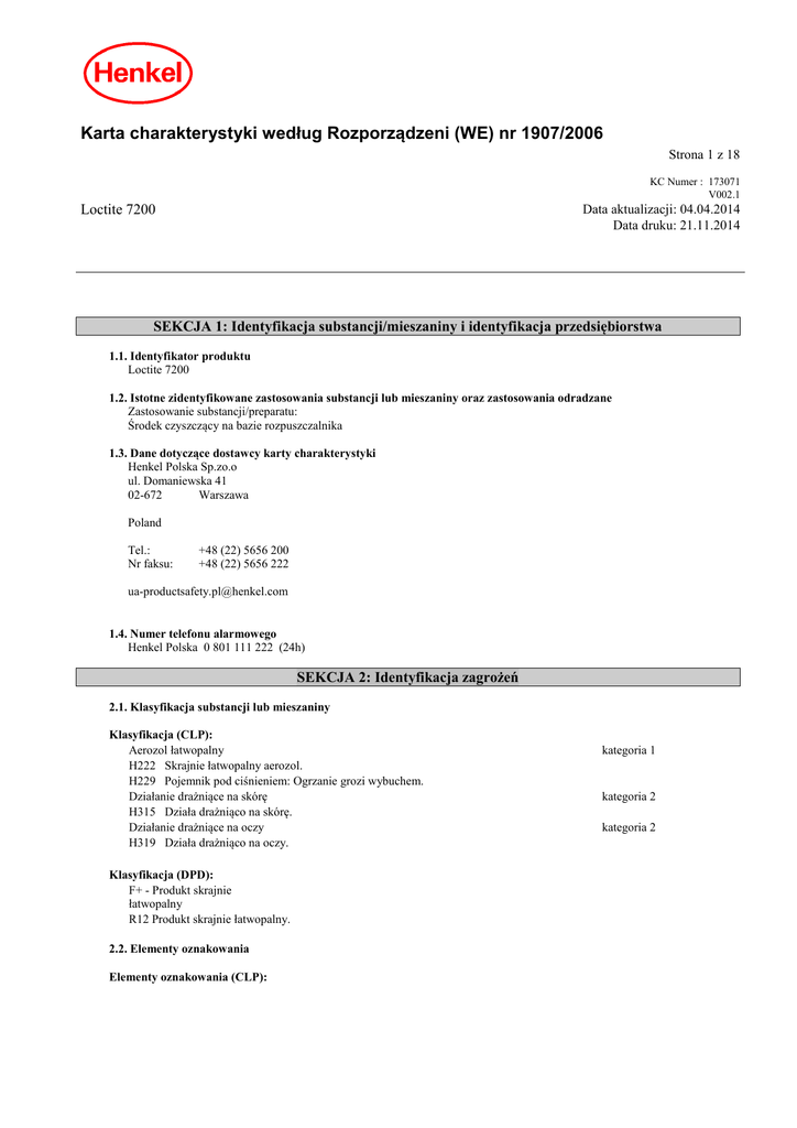 Karta charakterystyki według Rozporządzeni (WE) nr 1907/2006 Strona 1 z 18 KC Numer : 173071 V002.1 Loctite 7200 Data aktualizacji: 04.04.2014 Data druku: 21.11.2014 SEKCJA 1: Identyfikacja substancji/mieszaniny i identyfikacja przedsiębiorstwa 1.1. Identyfikator produktu Loctite 7200 1.2. Istotne zidentyfikowane zastosowania substancji lub mieszaniny oraz zastosowania odradzane Zastosowanie substancji/preparatu: Środek czyszczący na bazie rozpuszczalnika 1.3. Dane dotyczące dostawcy karty charakterystyki Henkel Polska Sp.zo.o ul. Domaniewska 41 02-672 Warszawa Poland Tel.: Nr faksu: +48 (22) 5656 200 +48 (22) 5656 222 [email protected] 1.4. Numer telefonu alarmowego Henkel Polska 0 801 111 222 (24h) SEKCJA 2: Identyfikacja zagrożeń 2.1. Klasyfikacja substancji lub mieszaniny Klasyfikacja (CLP): Aerozol łatwopalny H222 Skrajnie łatwopalny aerozol. H229 Pojemnik pod ciśnieniem: Ogrzanie grozi wybuchem. Działanie drażniące na skórę H315 Działa drażniąco na skórę. Działanie drażniące na oczy H319 Działa drażniąco na oczy. Klasyfikacja (DPD): F+ - Produkt skrajnie łatwopalny R12 Produkt skrajnie łatwopalny. 2.2. Elementy oznakowania Elementy oznakowania (CLP): kategoria 1 kategoria 2 kategoria 2 KC Numer: 173071 V002.1 Loctite 7200 Strona 2 z 18 Piktogram określający rodzaj zagrożenia: Hasło ostrzegawcze: Niebezpieczeństwo Zwrot określający zagrożenie: H222 Skrajnie łatwopalny aerozol. H229 Pojemnik pod ciśnieniem: Ogrzanie grozi wybuchem. H315 Działa drażniąco na skórę. H319 Działa drażniąco na oczy. Zwrot określający środki ostrożności: P251 Nie przebijać lub spalać, nawet po stosowaniu. P410+P412 Chronić przed światłem słonecznym. Nie poddawać temperaturze przekraczającej 50°C/ 122°F. P211 Nie rozpylać nad otwartym ogniem lub innym źródłem zapłonu. P210 Przechowywać z dala od źródeł ciepła, gorących powierzchni, źródeł iskrzenia, otwartego ognia i innych źródeł zapłonu. Nie palić. P102 Chronić przed dziećmi. ***W przypadku stosowania przez wszystkich konsumentów: P101 W razie konieczności zasięgnięcia porady lekarza należy pokazać pojemnik lub etykietę. P102 Chronić przed dziećmi. P501 Odpady i pozostałości utylizować zgodnie z lokalnie obowiązującymi przepisami.*** Zwrot określający środki ostrożności: Zapobieganie P261 Unikać wdychania aerozolu. Zwrot określający środki ostrożności: Reagowanie P302+P352 W PRZYPADKU KONTAKTU ZE SKÓRĄ: P337+P313 W przypadku utrzymywania się działania drażniącego na oczy: Zasięgnąć porady/zgłosić się pod opiekę lekarza. Elementy oznakowania (DPD): F+ - Produkt skrajnie łatwopalny Zwroty wskazujące rodzaj zagrożenia (zwroty R): R12 Produkt skrajnie łatwopalny. Zwroty bezpiecznego stosowania (zwroty S): S16 Nie przechowywać w pobliżu źródeł zapłonu - nie palić tytoniu. S23 Nie wdychać rozpylonej cieczy. S24 Unikać zanieczyszczenia skóry. S51 Stosować wyłącznie w dobrze wentylowanych pomieszczeniach. Dodatkowe informacje podawane na etykiecie: Pojemnik pod ciśnieniem: chronić przed słońcem i nagrzaniem powyżej temperatury 50 °C. Nie przekłuwać ani nie spalać, także po zużyciu. Nie rozpylać nad otwartym płomieniem lub żarzącym się materiałem. Nie przechowywać w pobliżu źródeł zapłonu - nie palić tytoniu. Chronić przed dziećmi. W przypadku stosowania przez wszystkich konsumentów: S2 Chronić przed dziećmi. S46 W razie połknięcia niezwłocznie zasięgnij porady lekarza - pokaż opakowanie lub etykietę. KC Numer: 173071 V002.1 Loctite 7200 Strona 3 z 18 2.3. Inne zagrożenia Brak przy stosowaniu zgodnie z przeznaczeniem. SEKCJA 3: Skład/informacja o składnikach Ogólna charakterystyka chemiczna: oczyszczacz Informacje o składnikach według Rozporządzenia WE Nr 1272/2008: Niebezpieczne składniki Nr CAS Numer WE Nr rejestracyjny REACH 203-714-2 Zawartość Klasyfikacja 50- < 75 % Ciecze palne 2 H225 Propan 74-98-6 200-827-9 01-2119486944-21 10- < 25 % Gaz łatwopalny 1 H220 Gazy pod ciśnieniem 1,3-dioksolan 646-06-0 211-463-5 10- < 25 % Ciecze palne 2 H225 propan-2-ol 67-63-0 200-661-7 01-2119457558-25 3- < 10 % Ciecze palne 2 H225 Działanie drażniące na oczy 2 H319 Toksyczność w stosunku do konkretnych organów -przy jednokrotnym kontakcie 3 H336 Etanol 64-17-5 200-578-6 01-2119457610-43 3- < 10 % Działanie drażniące na oczy 2 H319 Ciecze palne 2 H225 2-aminoetanol 141-43-5 205-483-3 01-2119486455-28 1- < 2,5 % Toksyczność ostra 4; Doustnie H302 Toksyczność ostra 4; Skórny H312 Działanie żrące na skórę 1B H314 Toksyczność ostra 4; przez drogi oddechowe H332 Chroniczne zagrożenie dla środowiska wodnego 3 H412 Butanon 78-93-3 201-159-0 01-2119457290-43 1- < 2,5 % Ciecze palne 2 H225 Działanie drażniące na oczy 2 H319 Toksyczność w stosunku do konkretnych organów -przy jednokrotnym kontakcie 3 H336 Benzyna ciężka obrabiana wodorem (ropa naftowa) 64742-48-9 265-150-3 01-2119471843-32 1- < 2,5 % Niebezpieczeństwo aspiracji 1 H304 Toksyczność w stosunku do konkretnych organów -przy jednokrotnym kontakcie 3 H336 Ciecze palne 3 H226 Chroniczne zagrożenie dla środowiska wodnego 3 H412 metylal 109-87-5 Pełne brzmienie zwrotów H wymienione jest w sekcji 16 ' Inne informacje". Substancje nie sklasyfikowane, dla których określono najwyższe dopuszczalne stężenia w środowisku pracy. KC Numer: 173071 V002.1 Loctite 7200 Strona 4 z 18 Informacje o składnikach według Rozporządzenia WE Nr 1999/45: Niebezpieczne składniki Nr CAS metylal 109-87-5 Propan 74-98-6 Zawartość Klasyfikacja 50 - < 75 % F - Produkt wysoce łatwopalny; R11 200-827-9 01-2119486944-21 10 - < 25 % F+ - Produkt skrajnie łatwopalny; R12 Numer WE Nr rejestracyjny REACH 203-714-2 1,3-dioksolan 646-06-0 propan-2-ol 67-63-0 211-463-5 10 - < 25 % F - Produkt wysoce łatwopalny; R11 200-661-7 01-2119457558-25 3 - < 10 % Etanol 64-17-5 200-578-6 01-2119457610-43 3 - < 10 % F - Produkt wysoce łatwopa